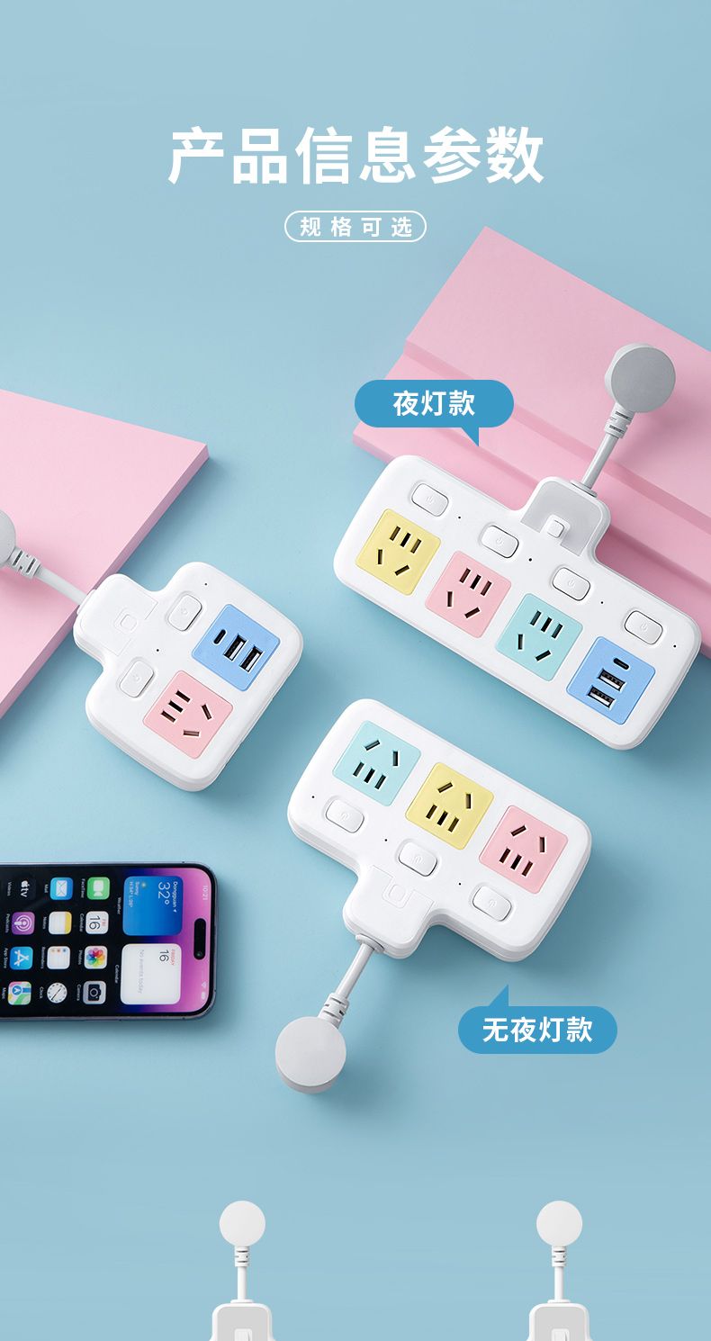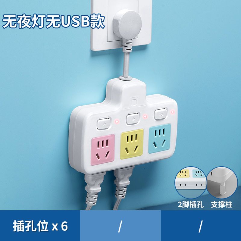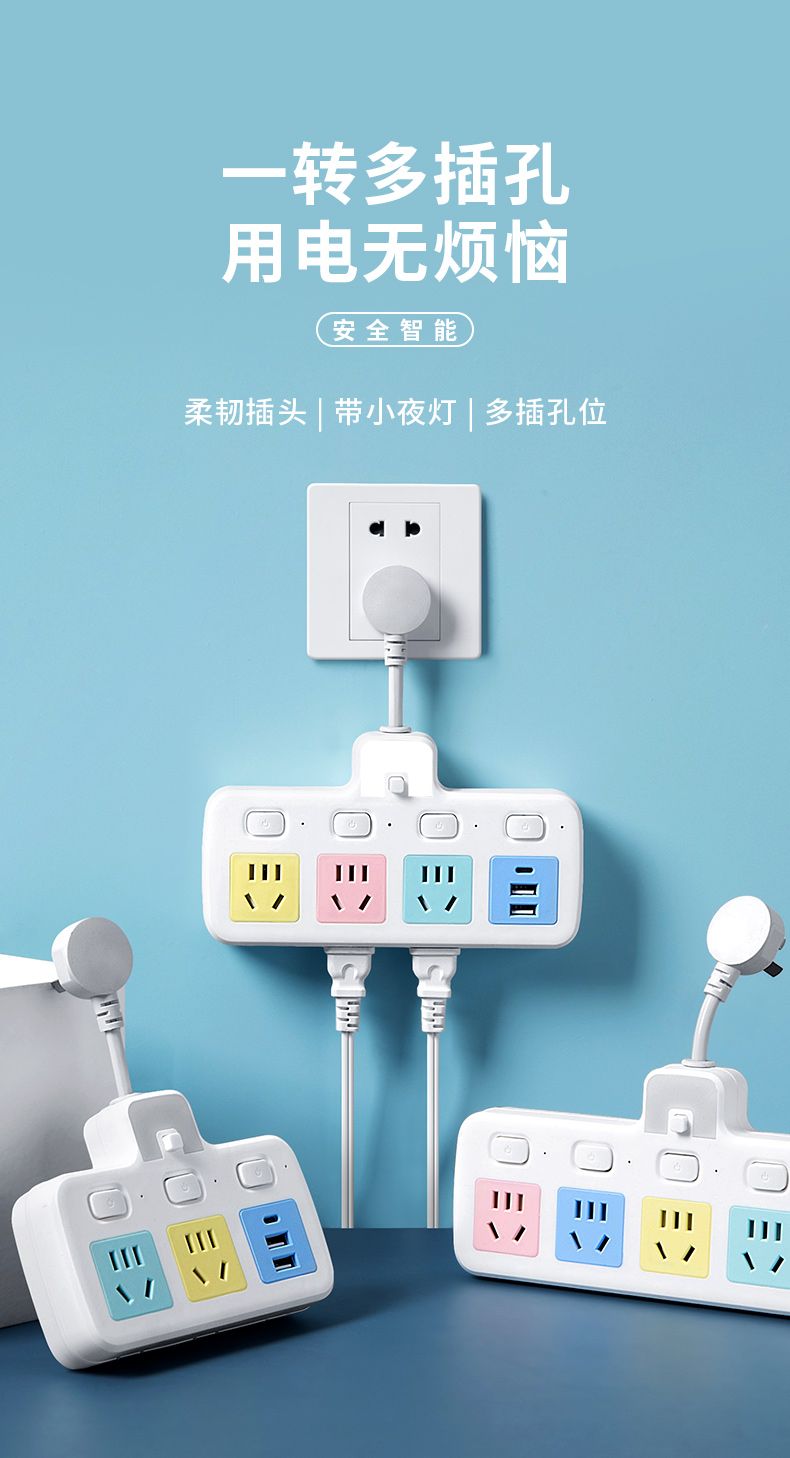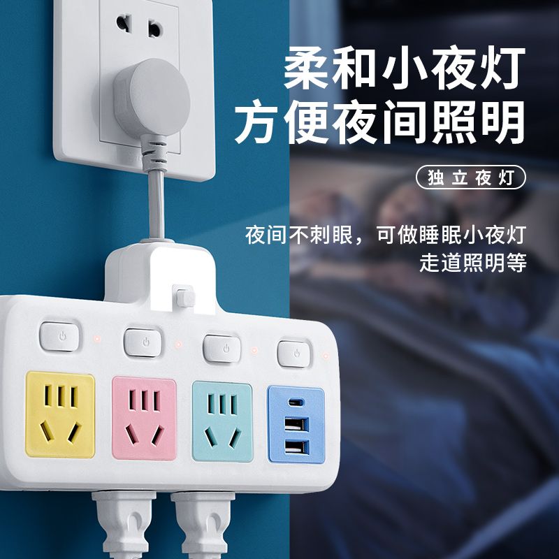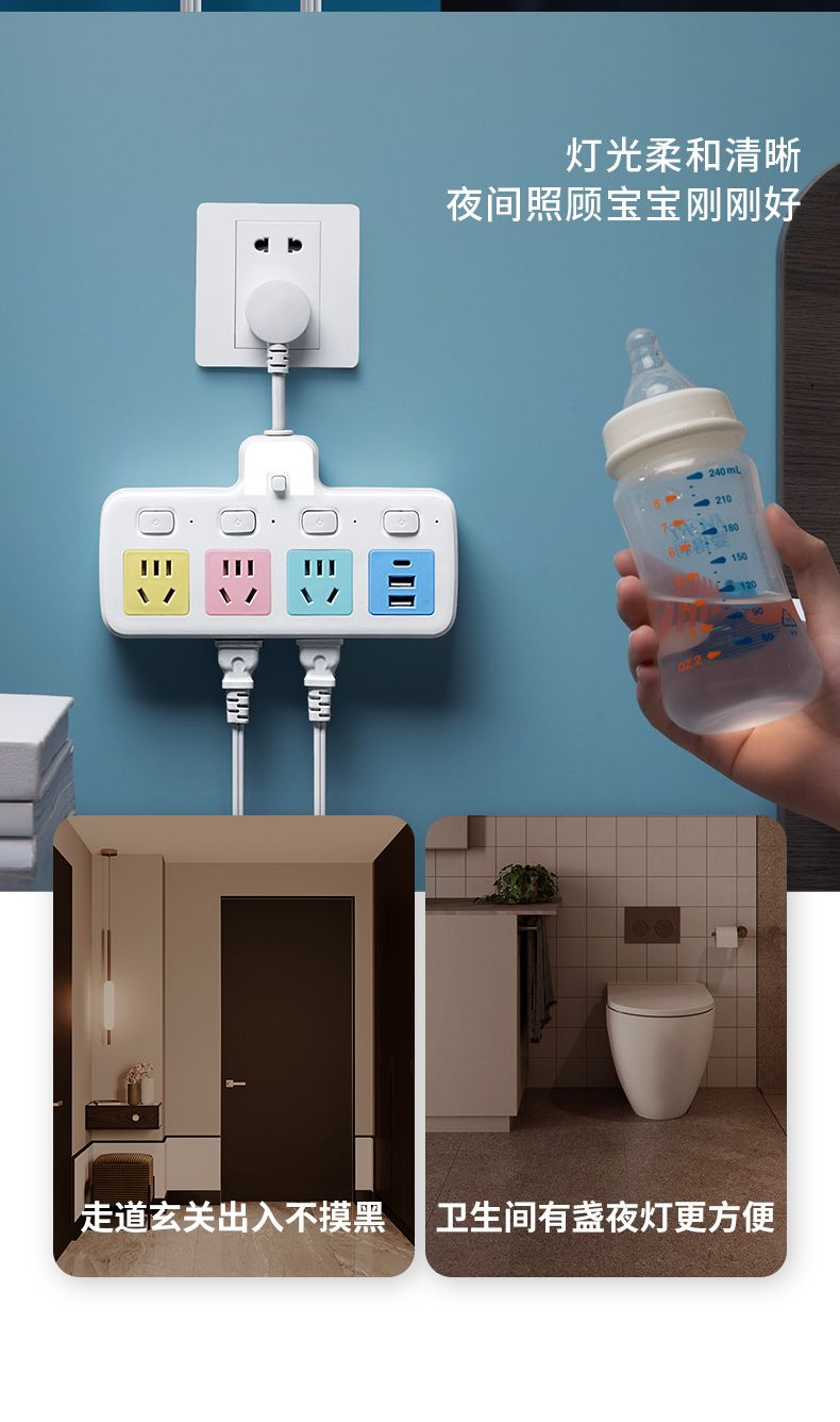 USB多用插座多功能多孔家用转换器带夜灯无线插板贴墙排插接线板