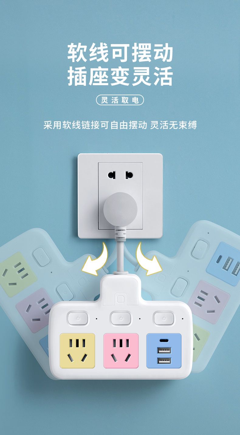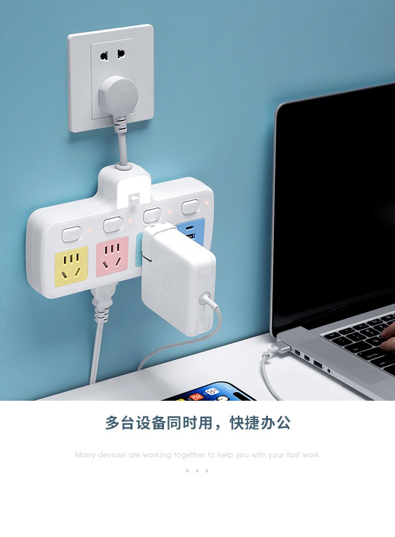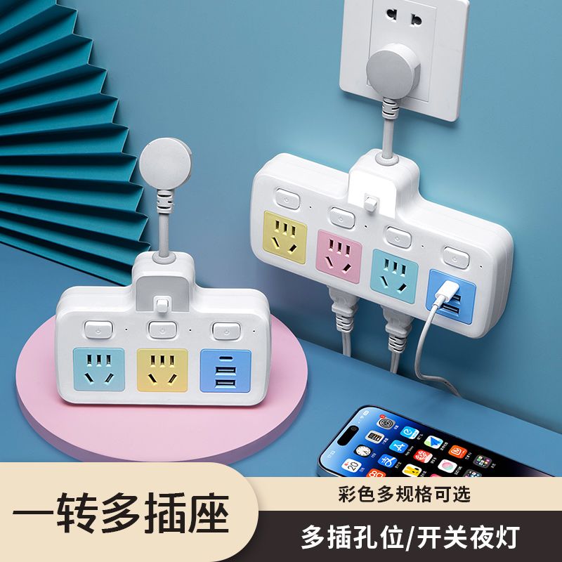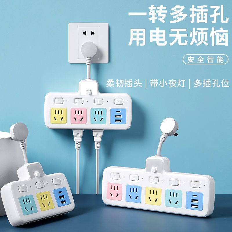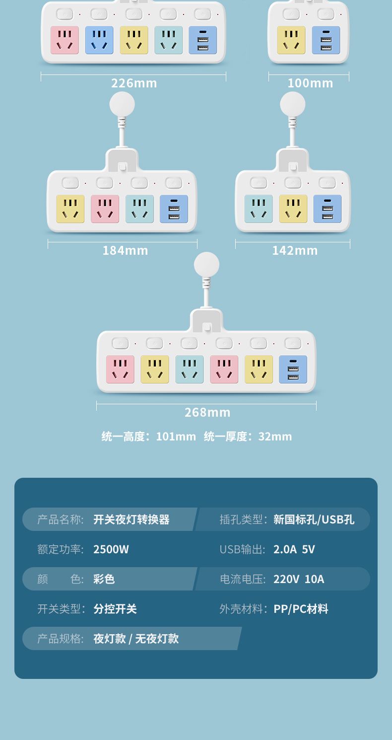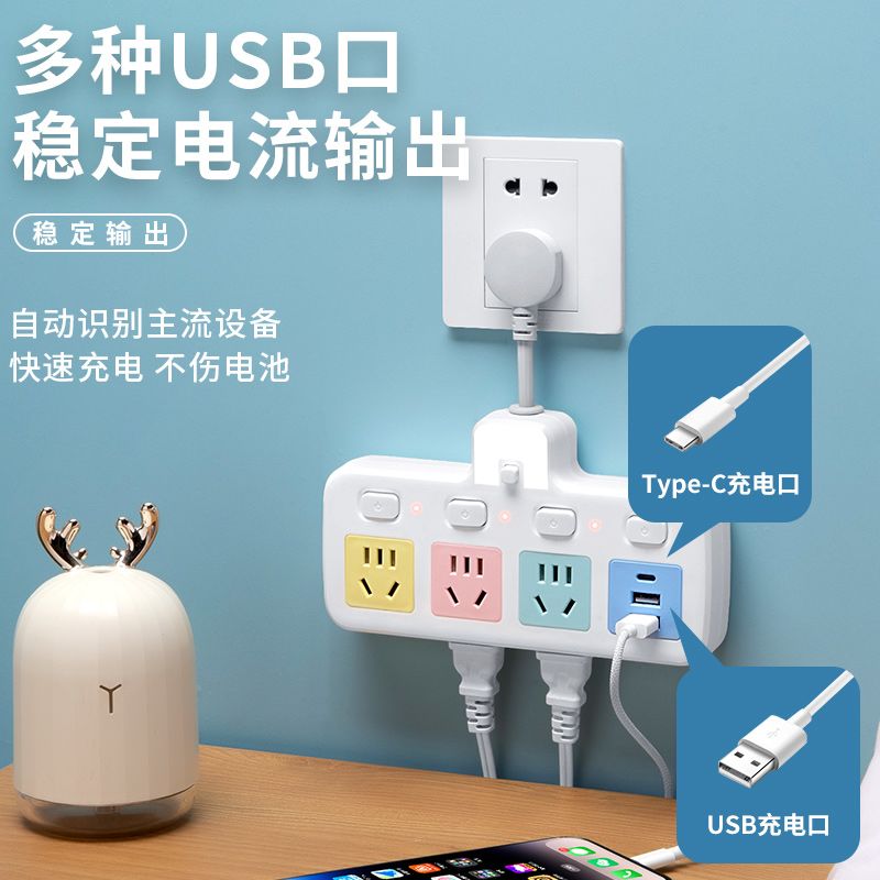 USB多用插座多功能多孔家用转换器带夜灯无线插板贴墙排插接线板