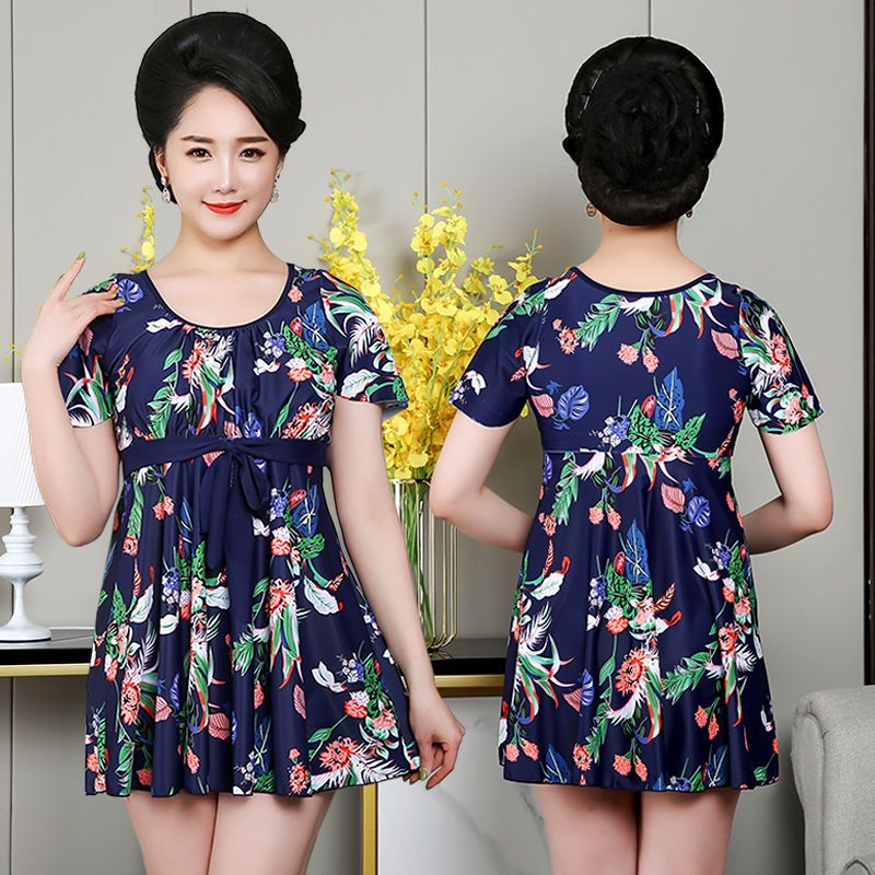 送泳帽泡温泉加大码游泳衣女分体平角裤裙式保守中年妈妈泳装胖MM