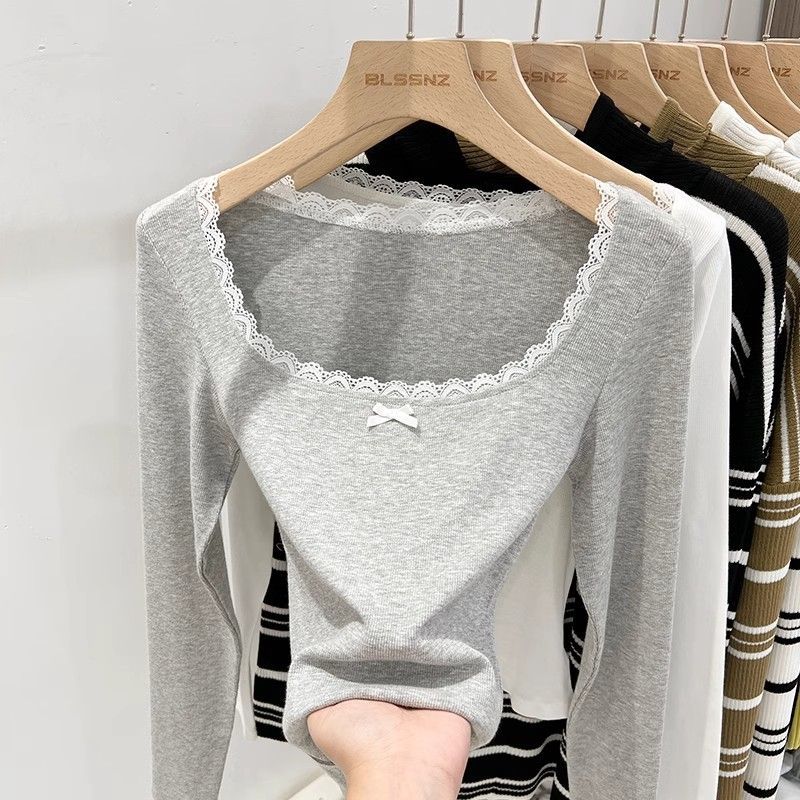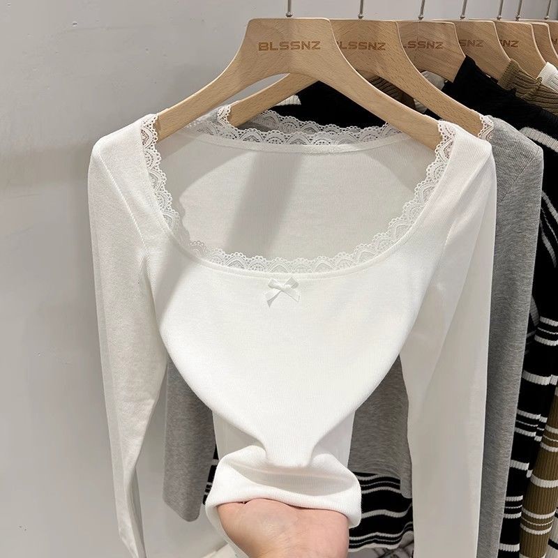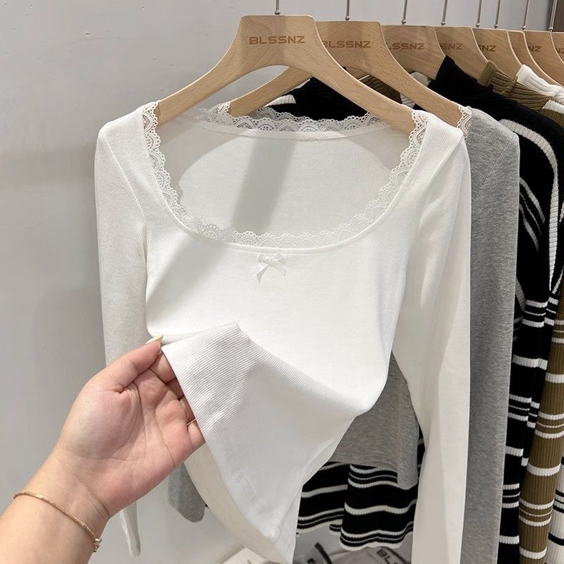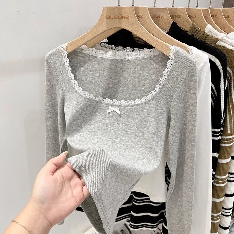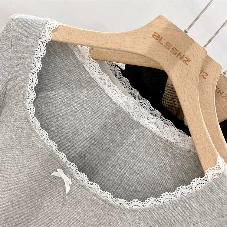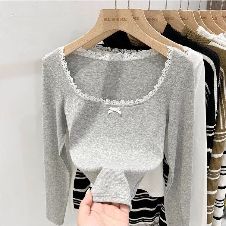 纯欲蕾丝内搭打底衫女秋冬2024春季蝴蝶结短款上衣低领长袖t恤女