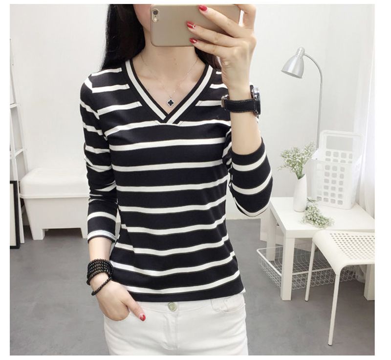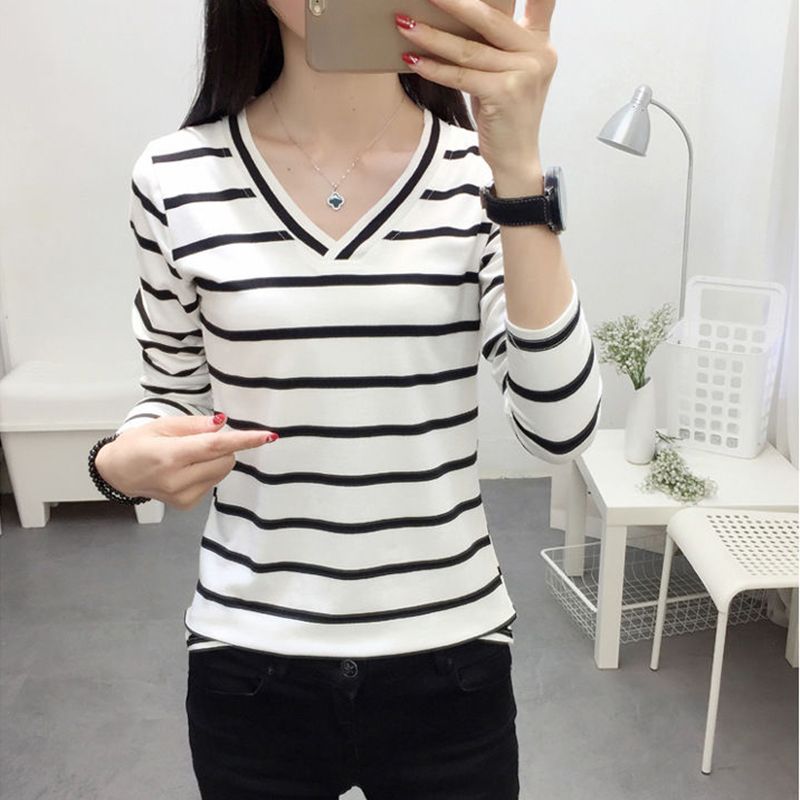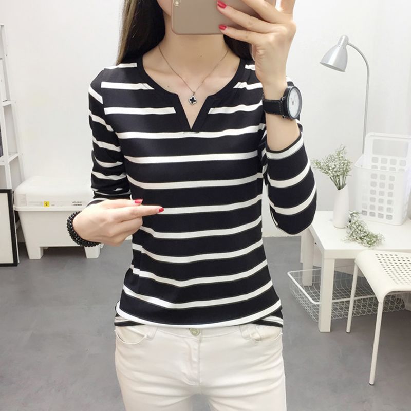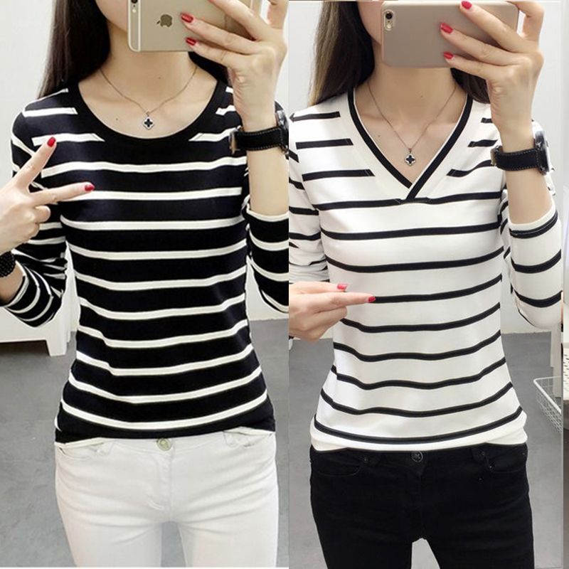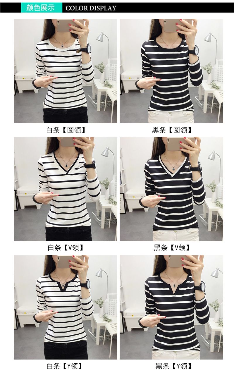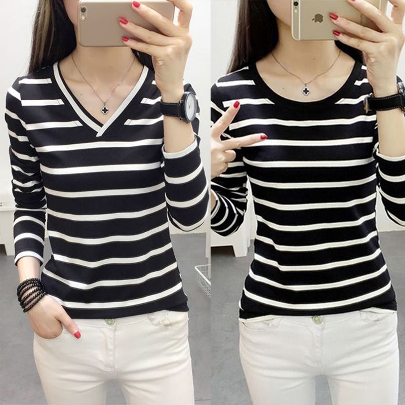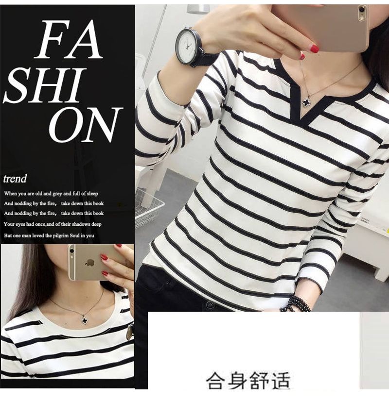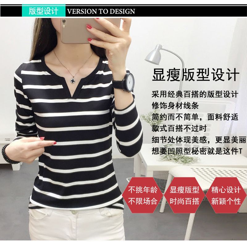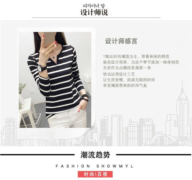 春秋款女装新款潮条纹百搭薄款长袖t恤修身v领上衣女圆领打底衫女