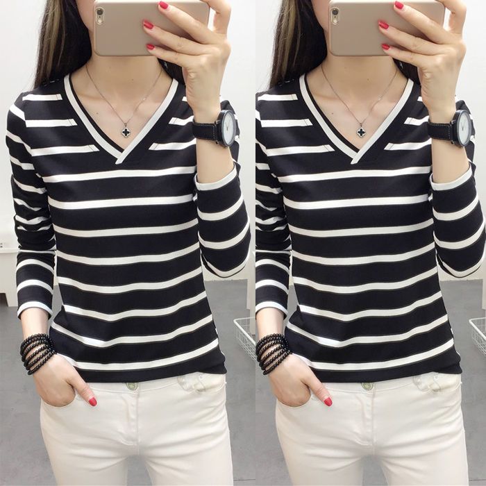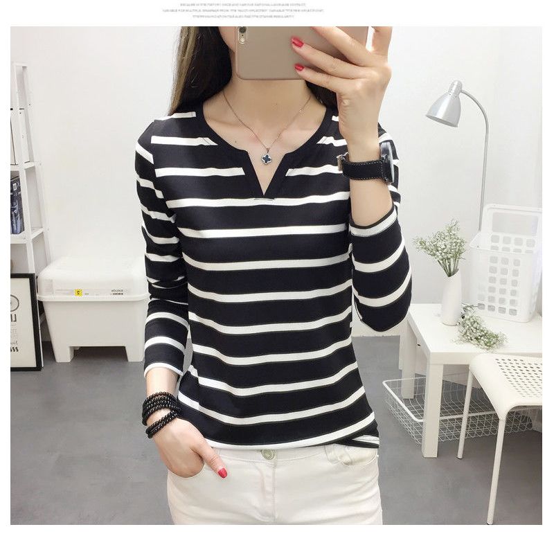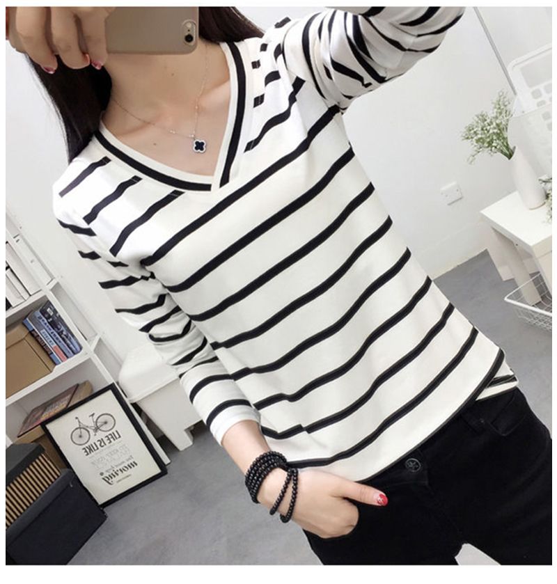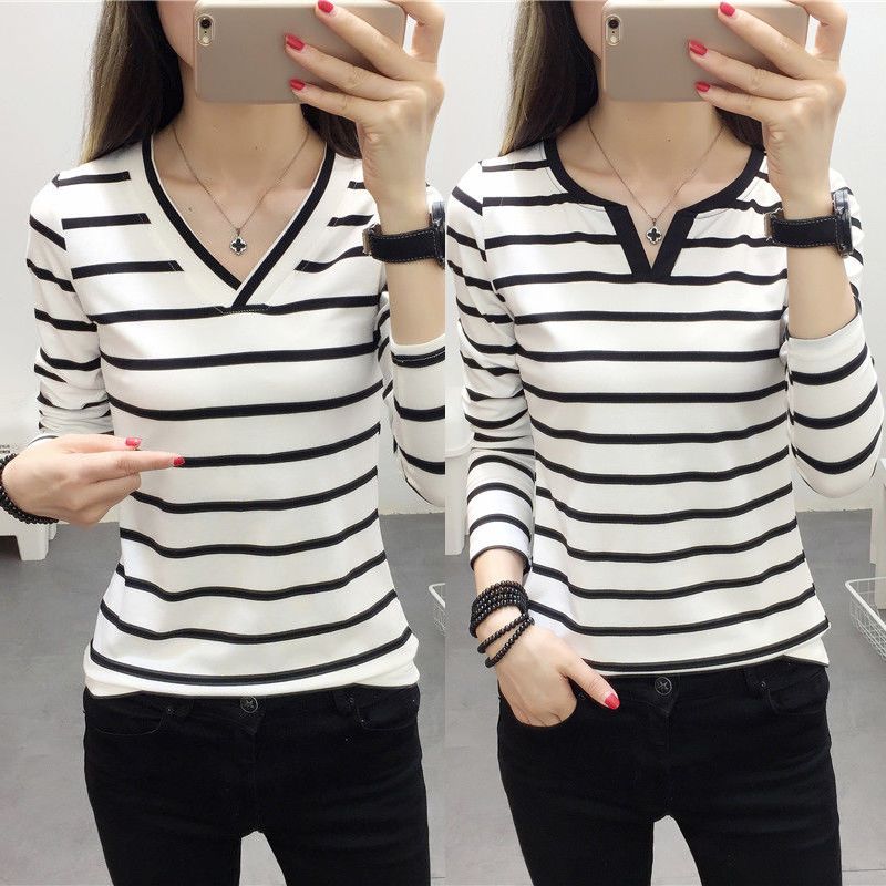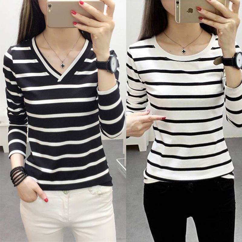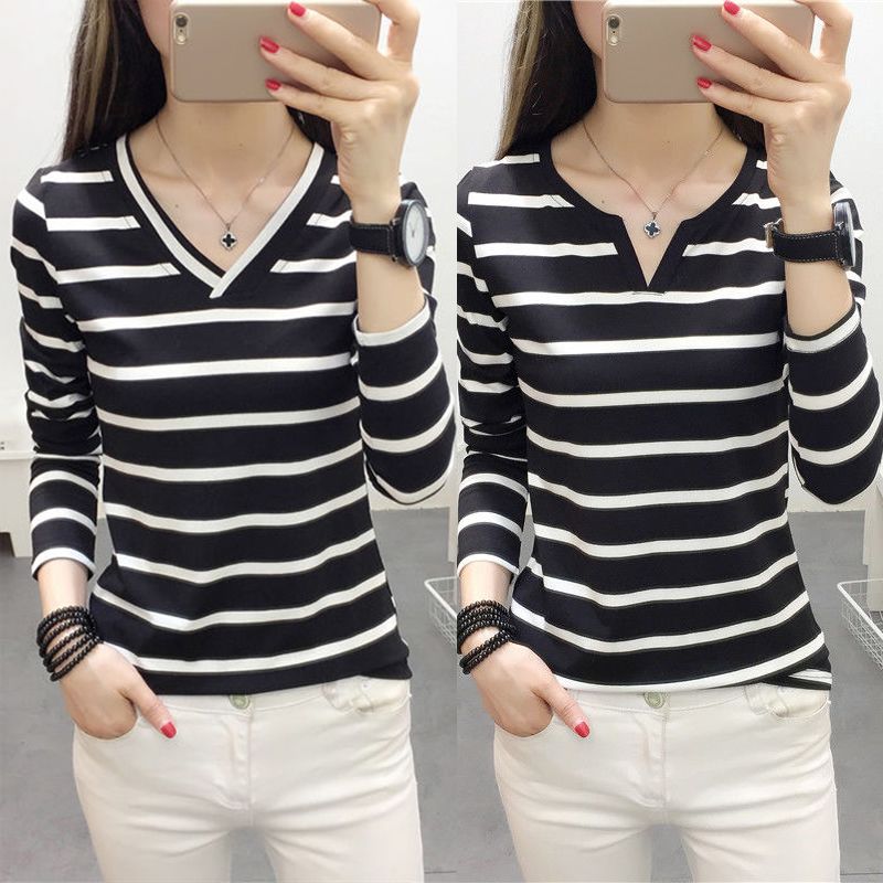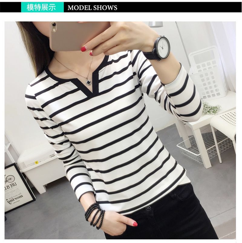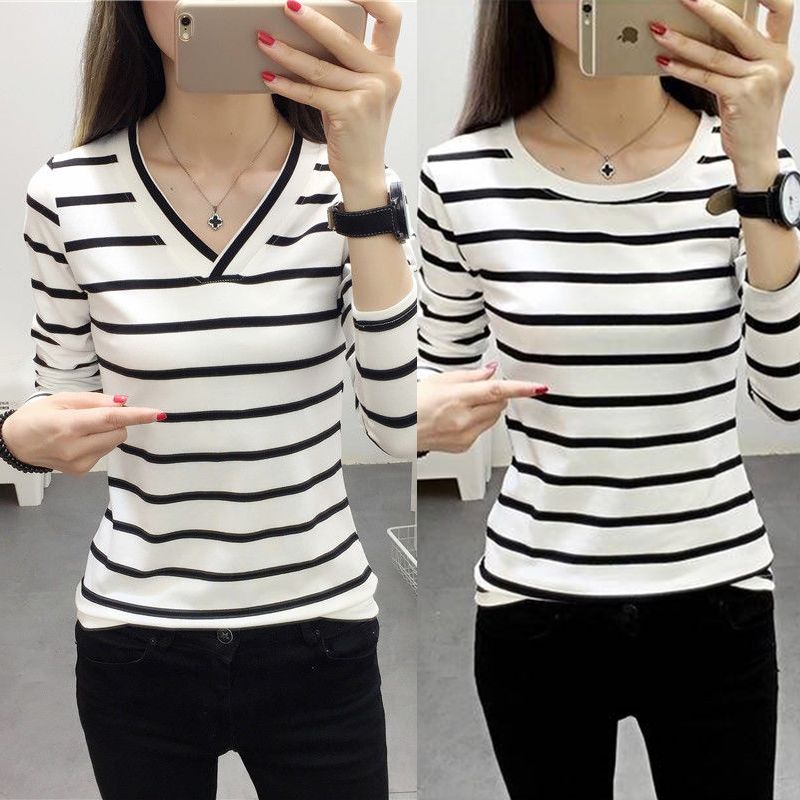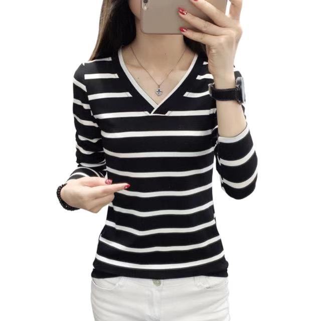 春秋款女装新款潮条纹百搭薄款长袖t恤修身v领上衣女圆领打底衫女