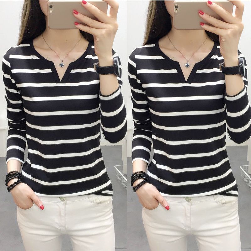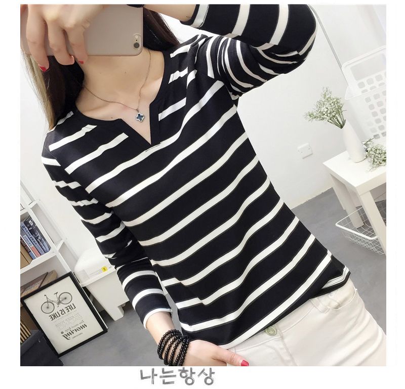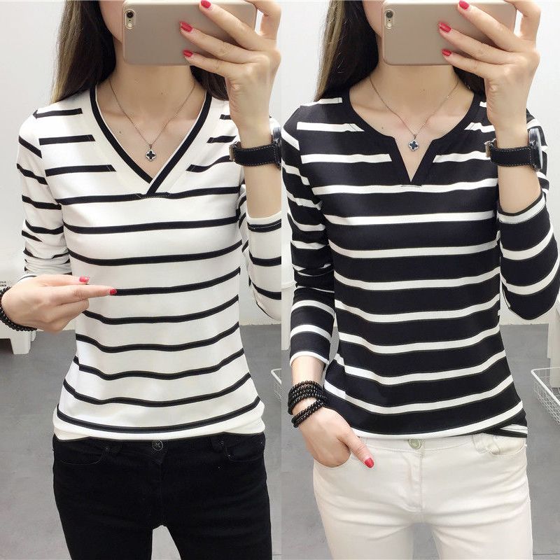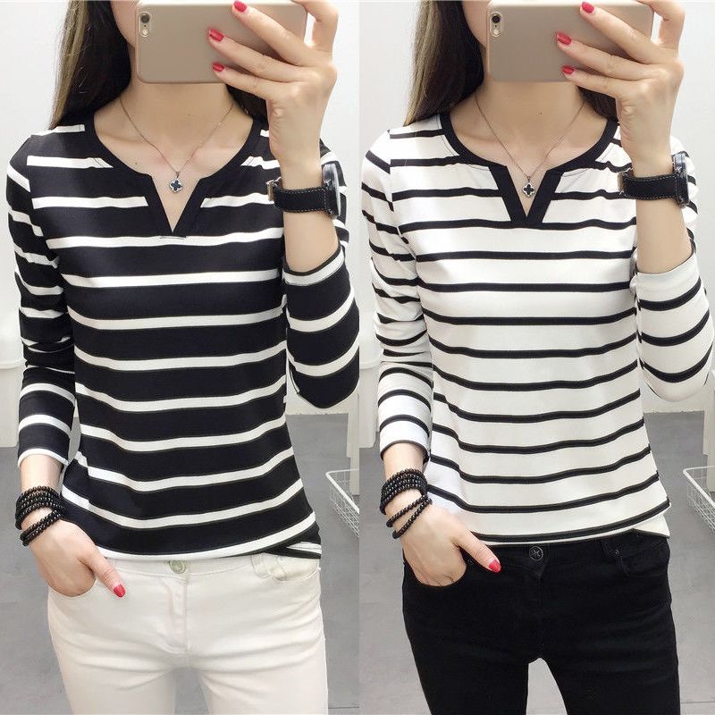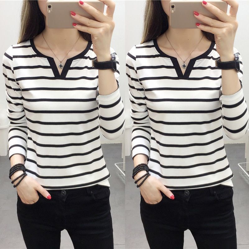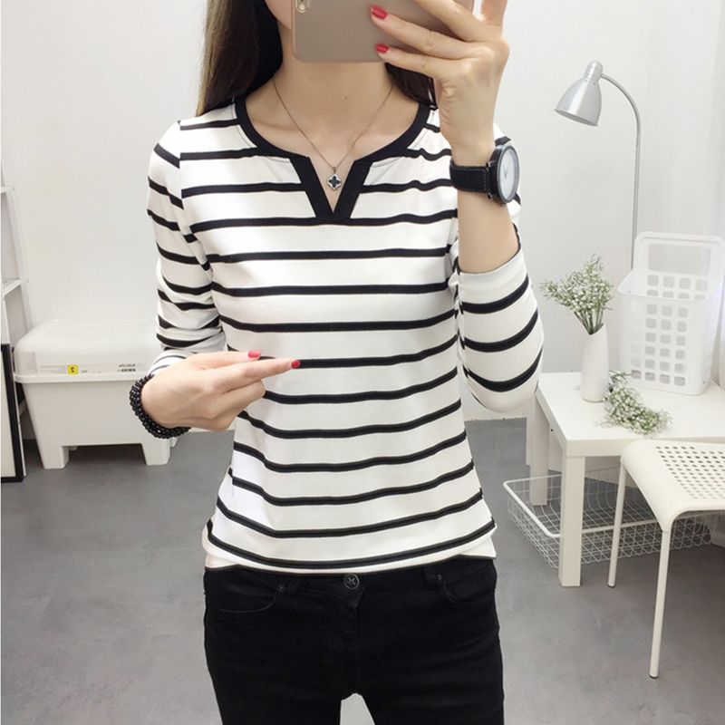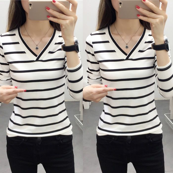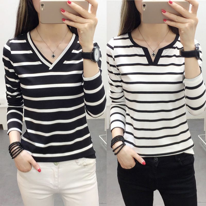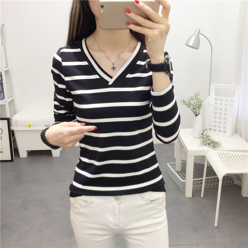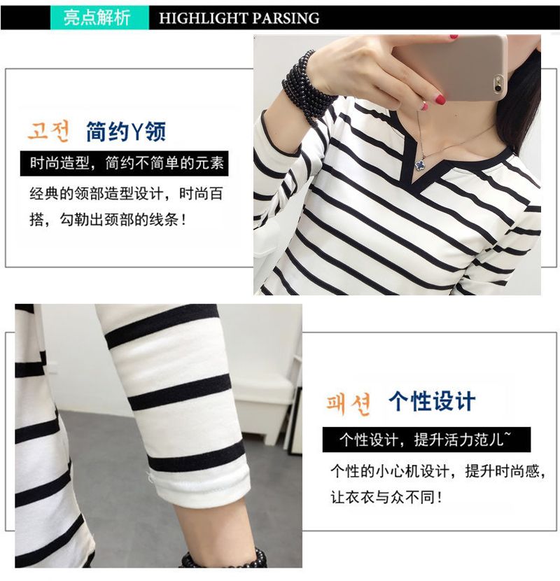 春秋款女装新款潮条纹百搭薄款长袖t恤修身v领上衣女圆领打底衫女