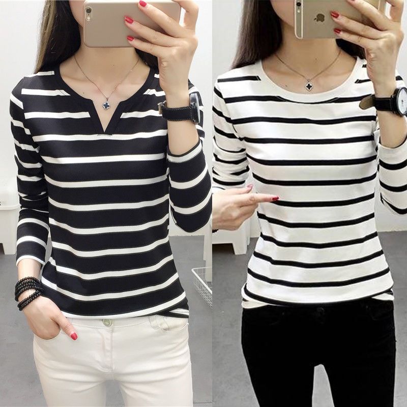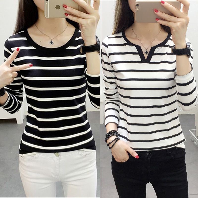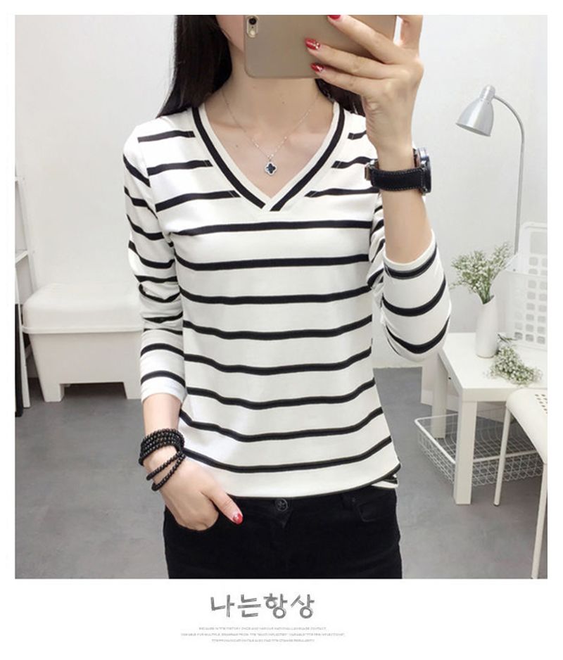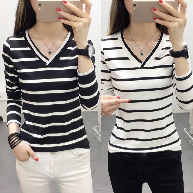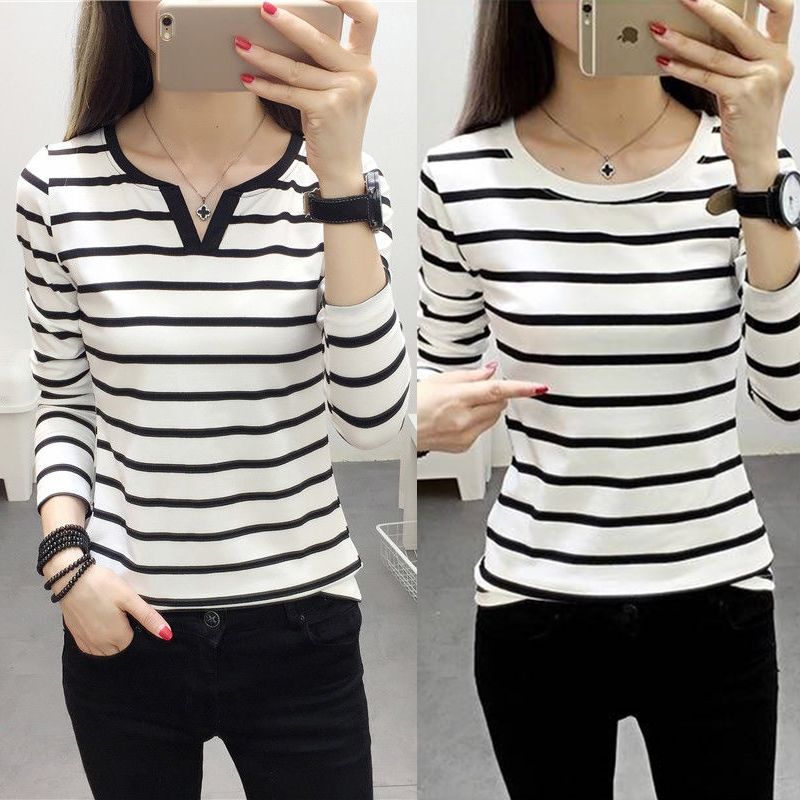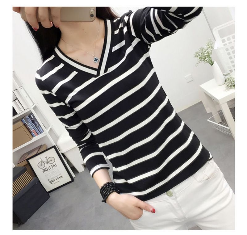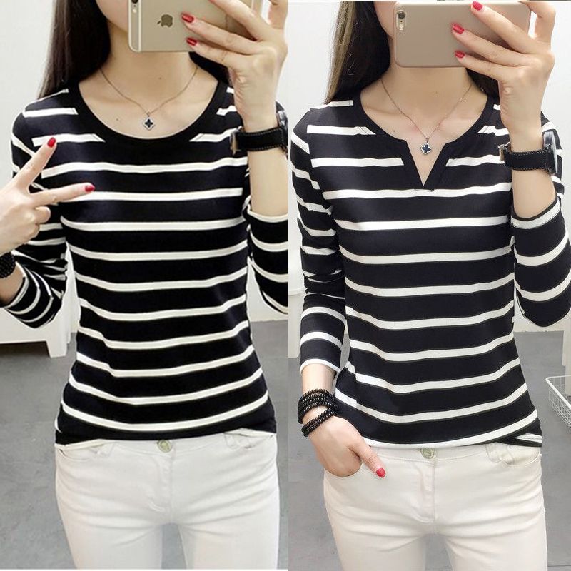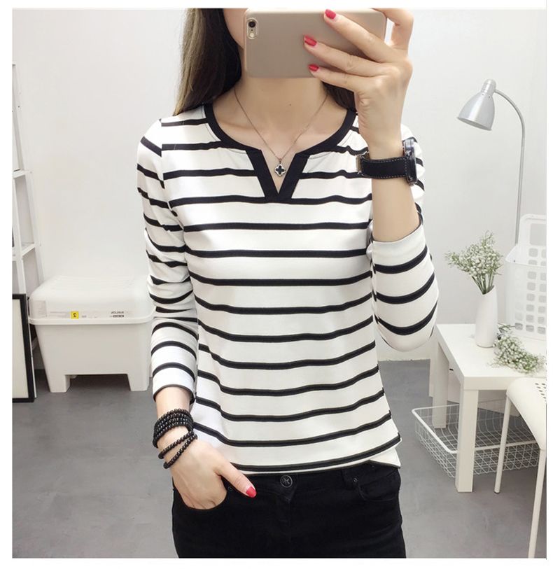 春秋款女装新款潮条纹百搭薄款长袖t恤修身v领上衣女圆领打底衫女