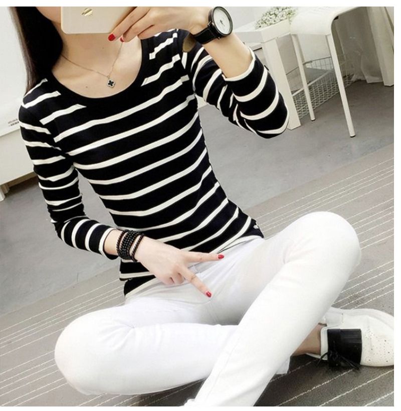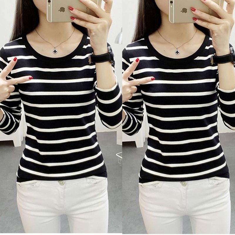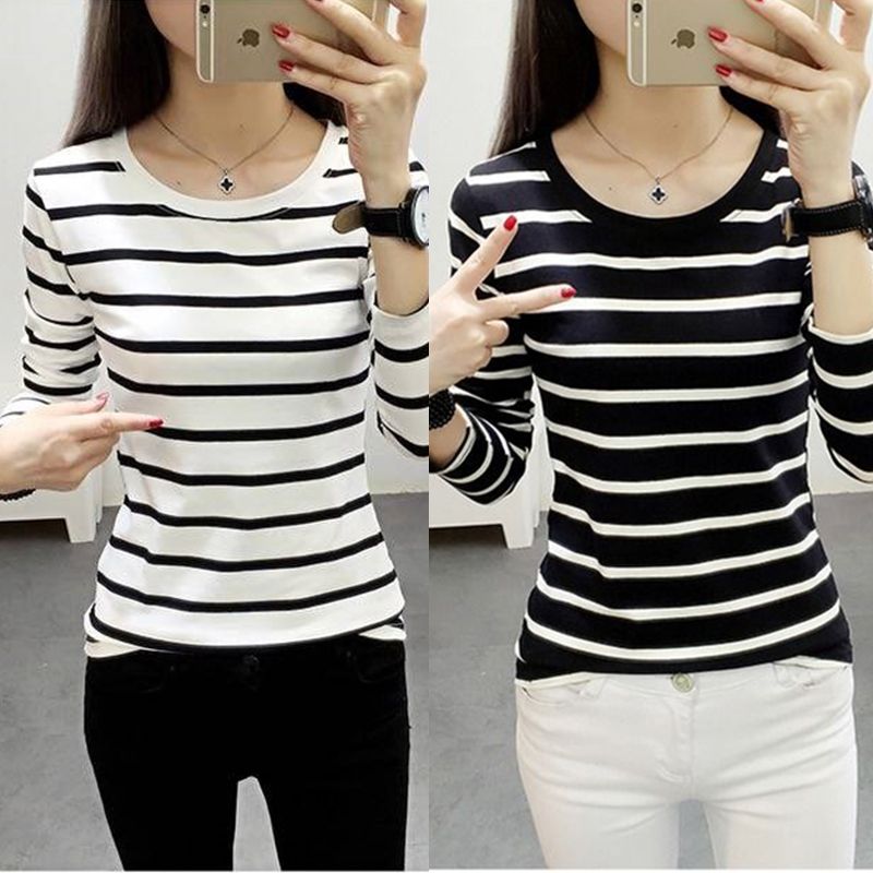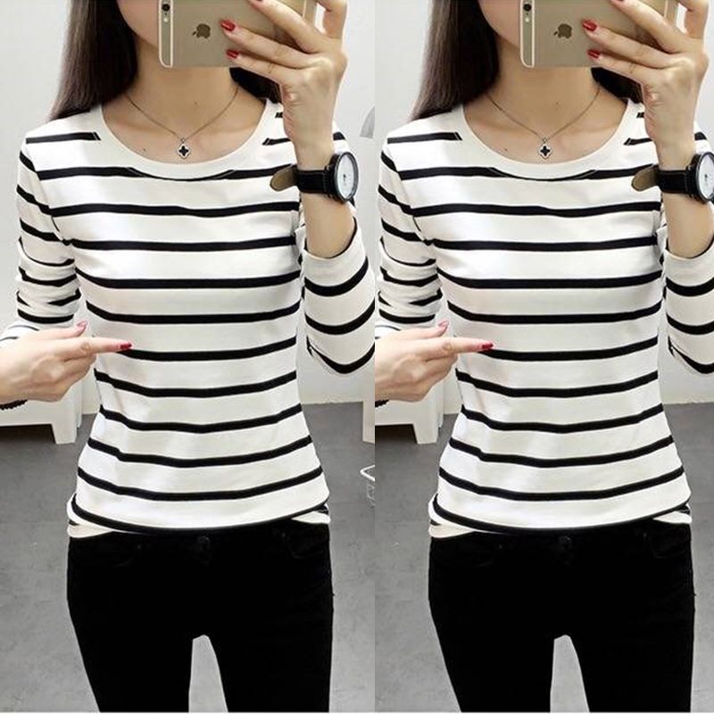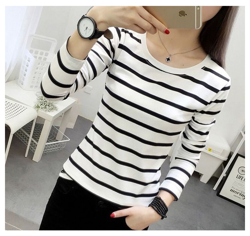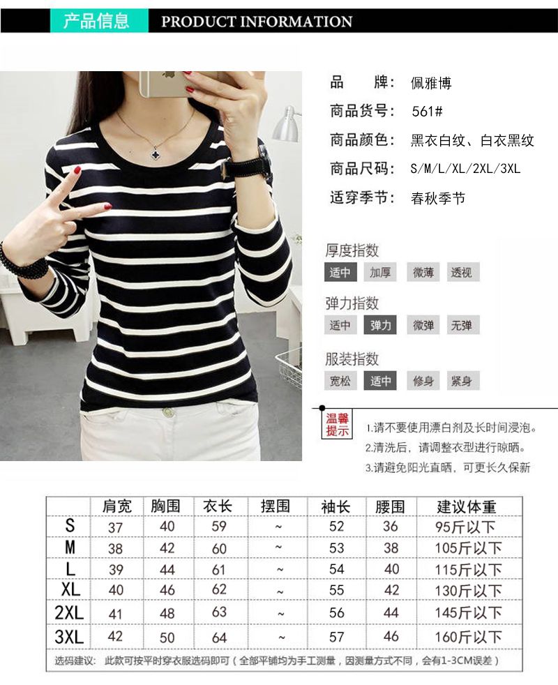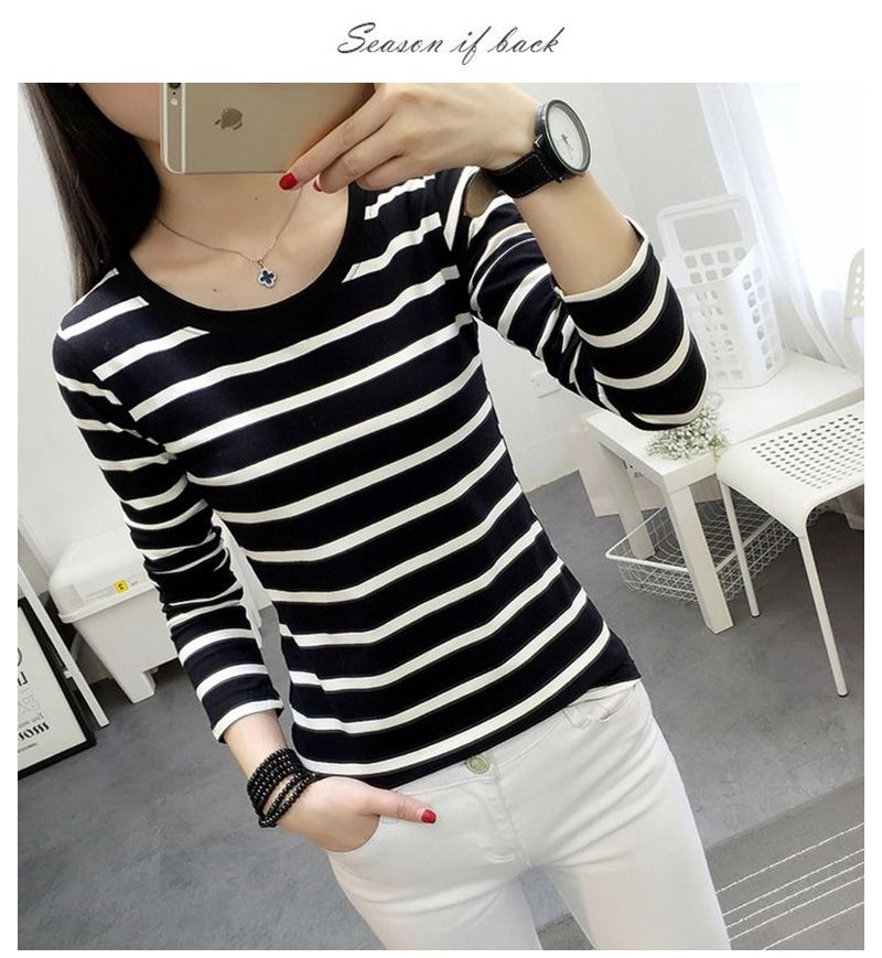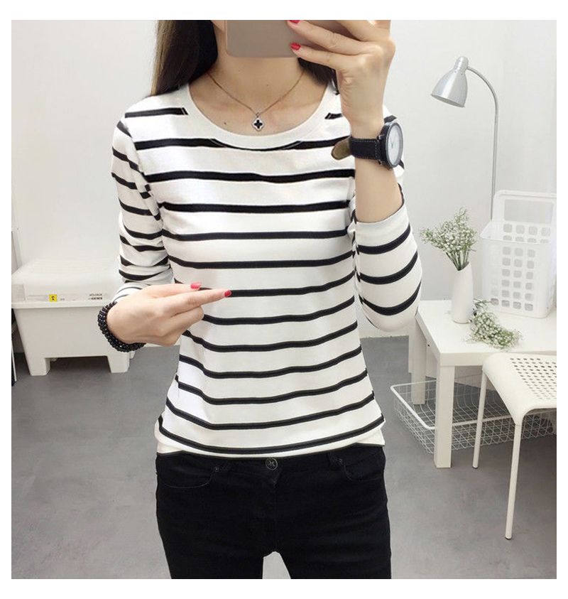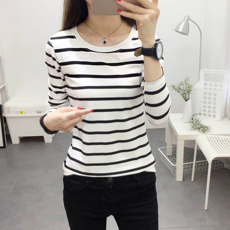 春秋款女装新款潮条纹百搭薄款长袖t恤修身v领上衣女圆领打底衫女