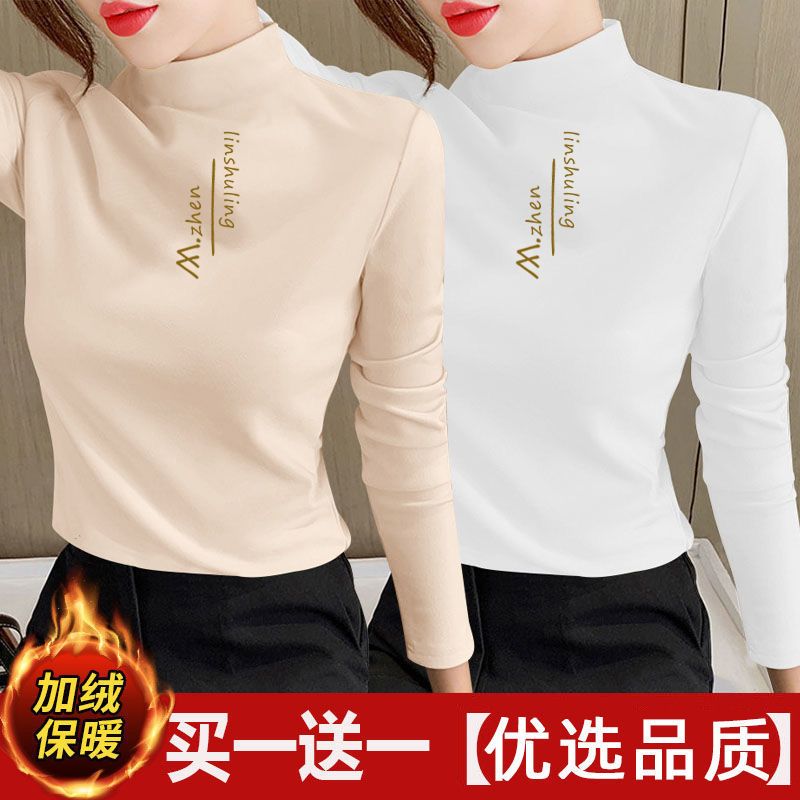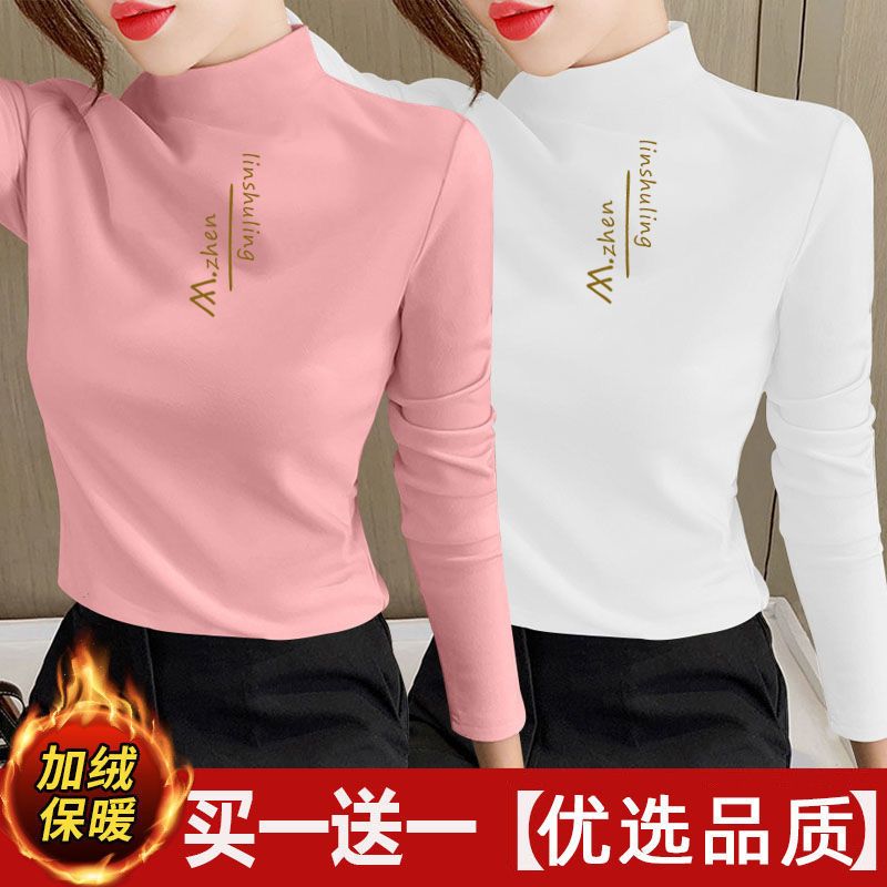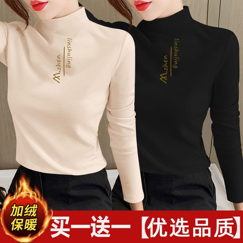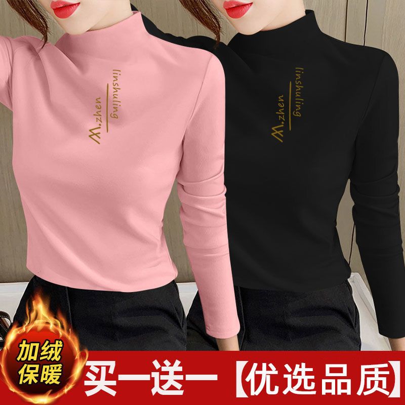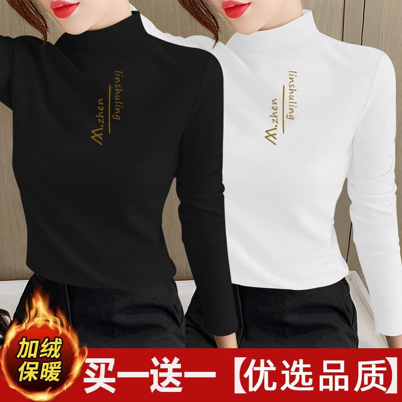 单/两件装 双面德绒印花半高领秋冬保暖打底衫修身百搭长袖t恤女