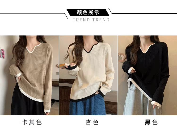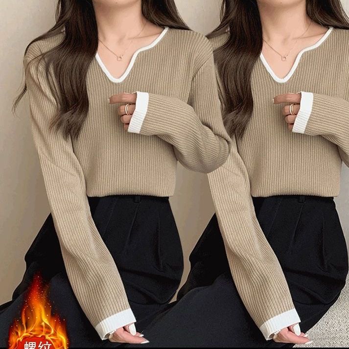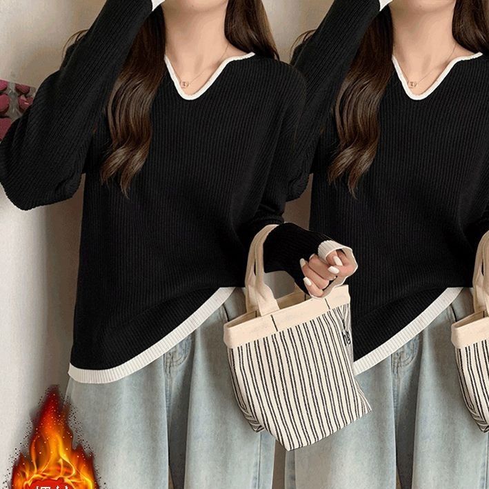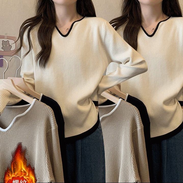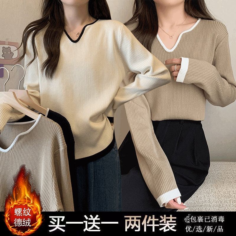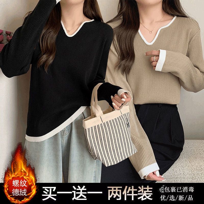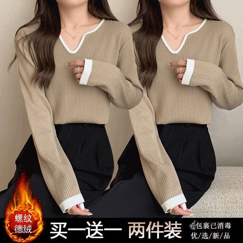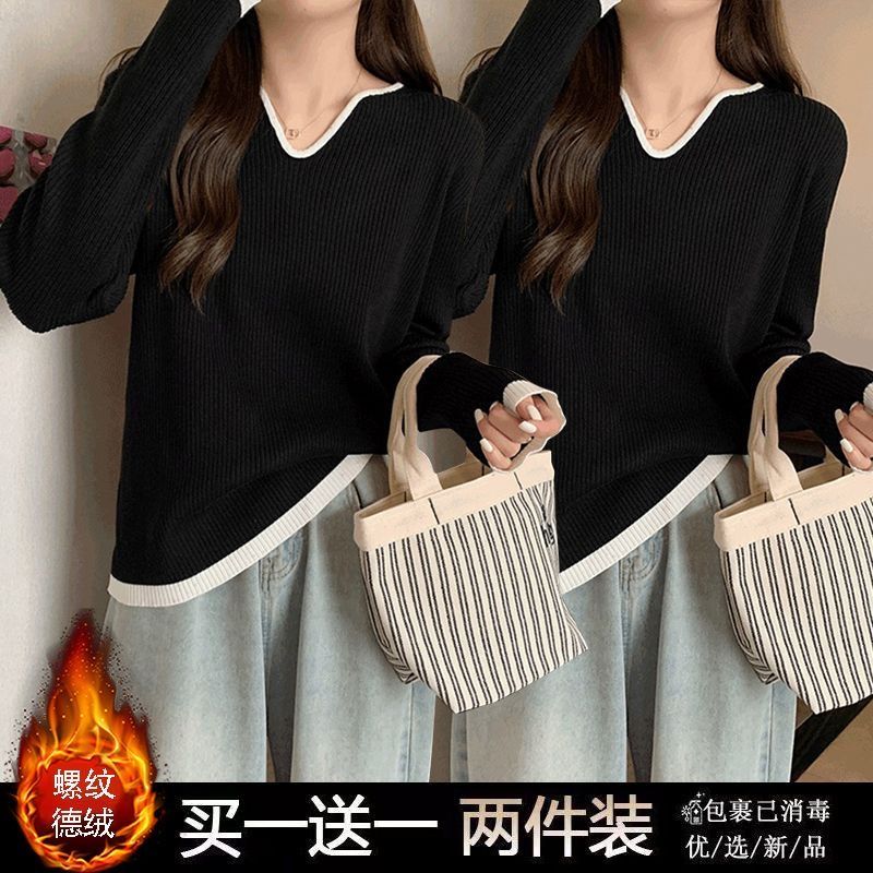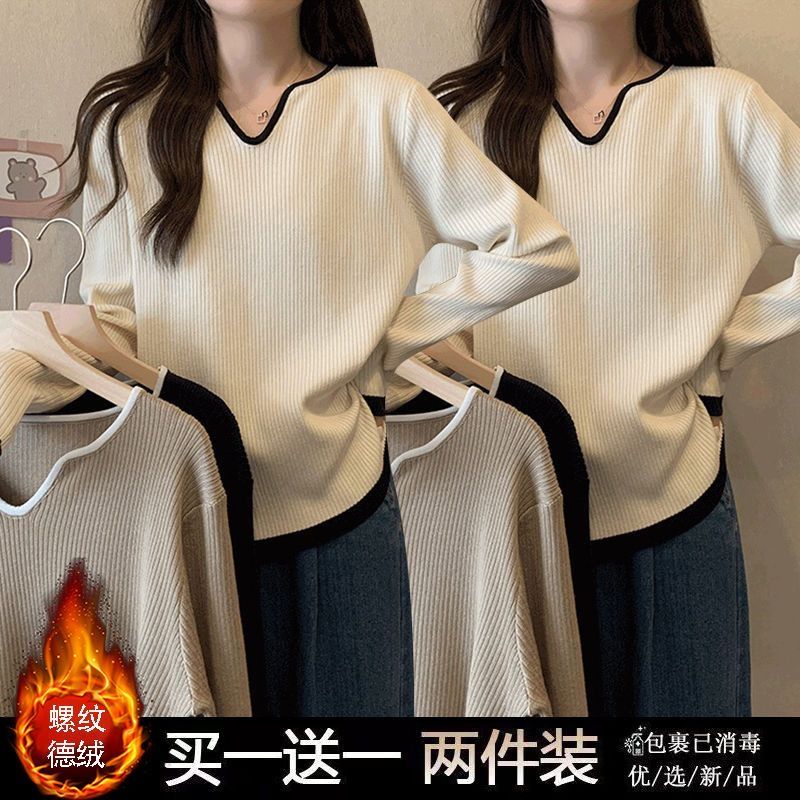 单/两件德绒v领宽松遮肉显瘦保暖打底衫女秋冬大码时尚百搭上衣潮