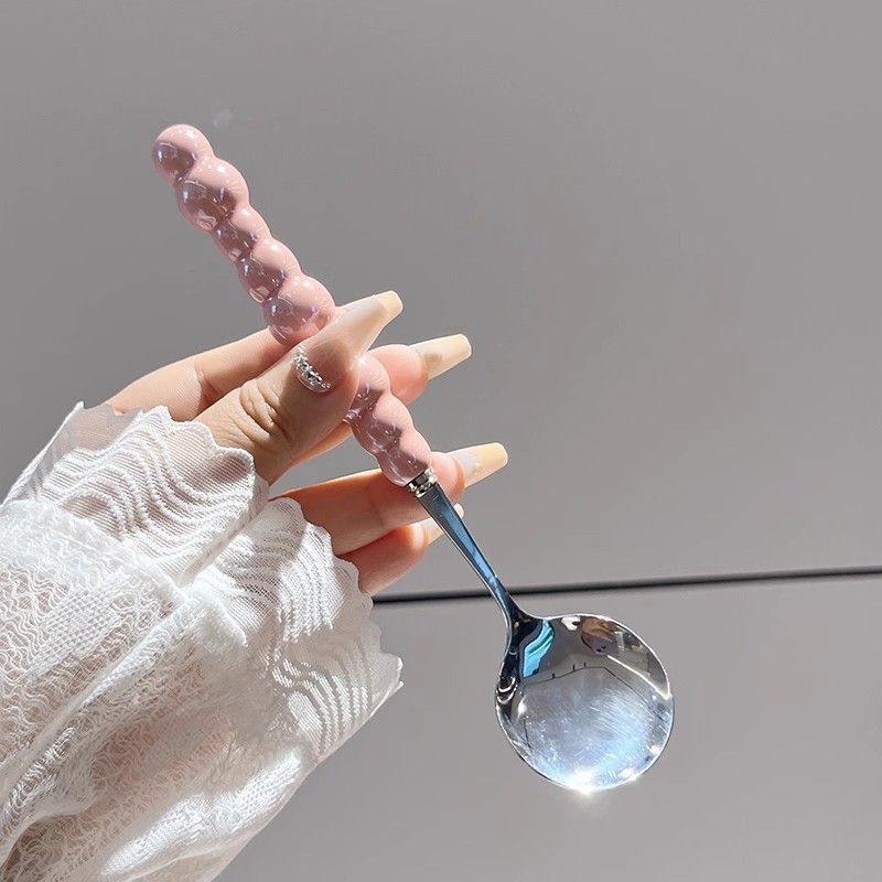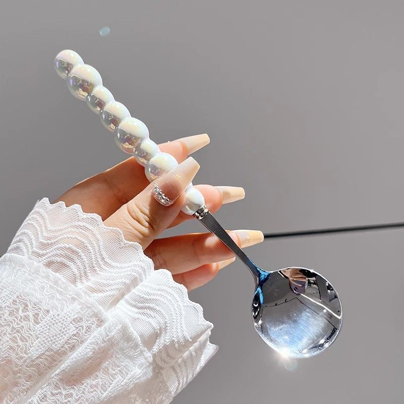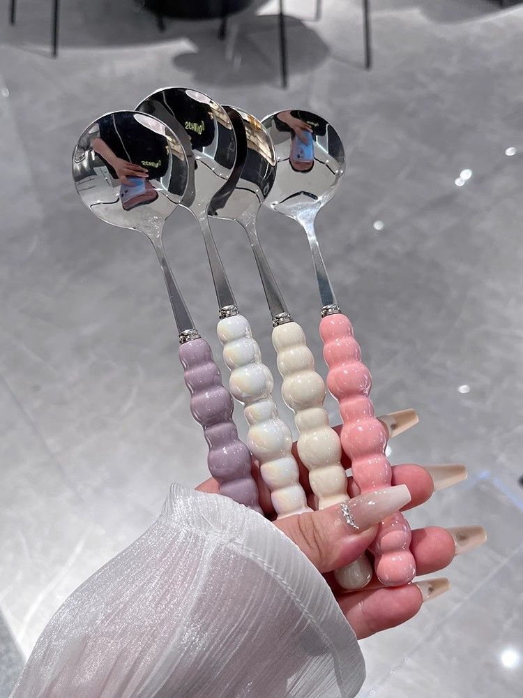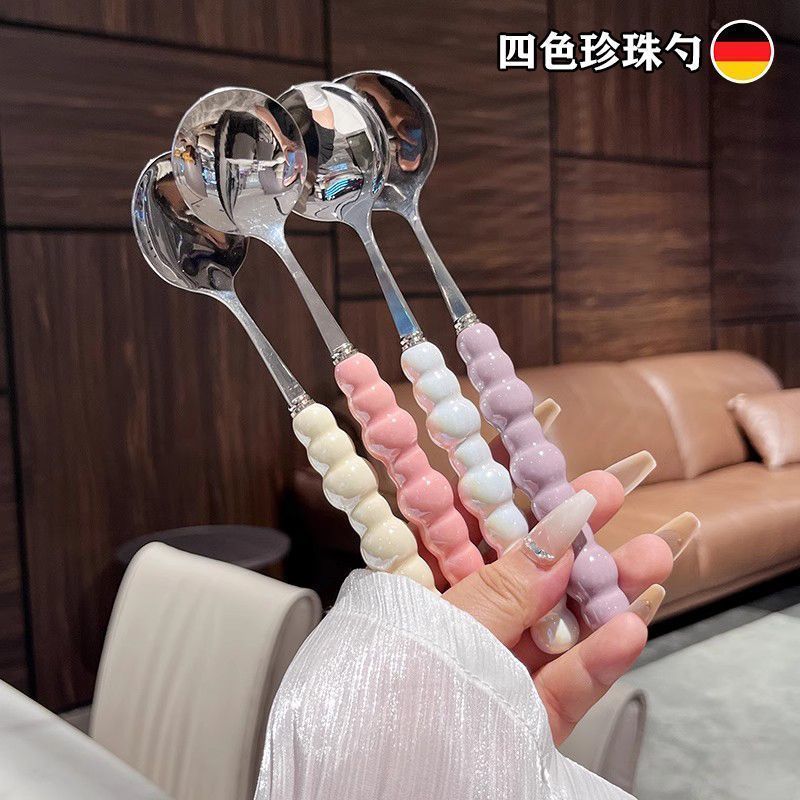 少女珍珠四色仿陶瓷手柄不锈钢勺子304家用长柄调羹吃饭圆勺汤勺
