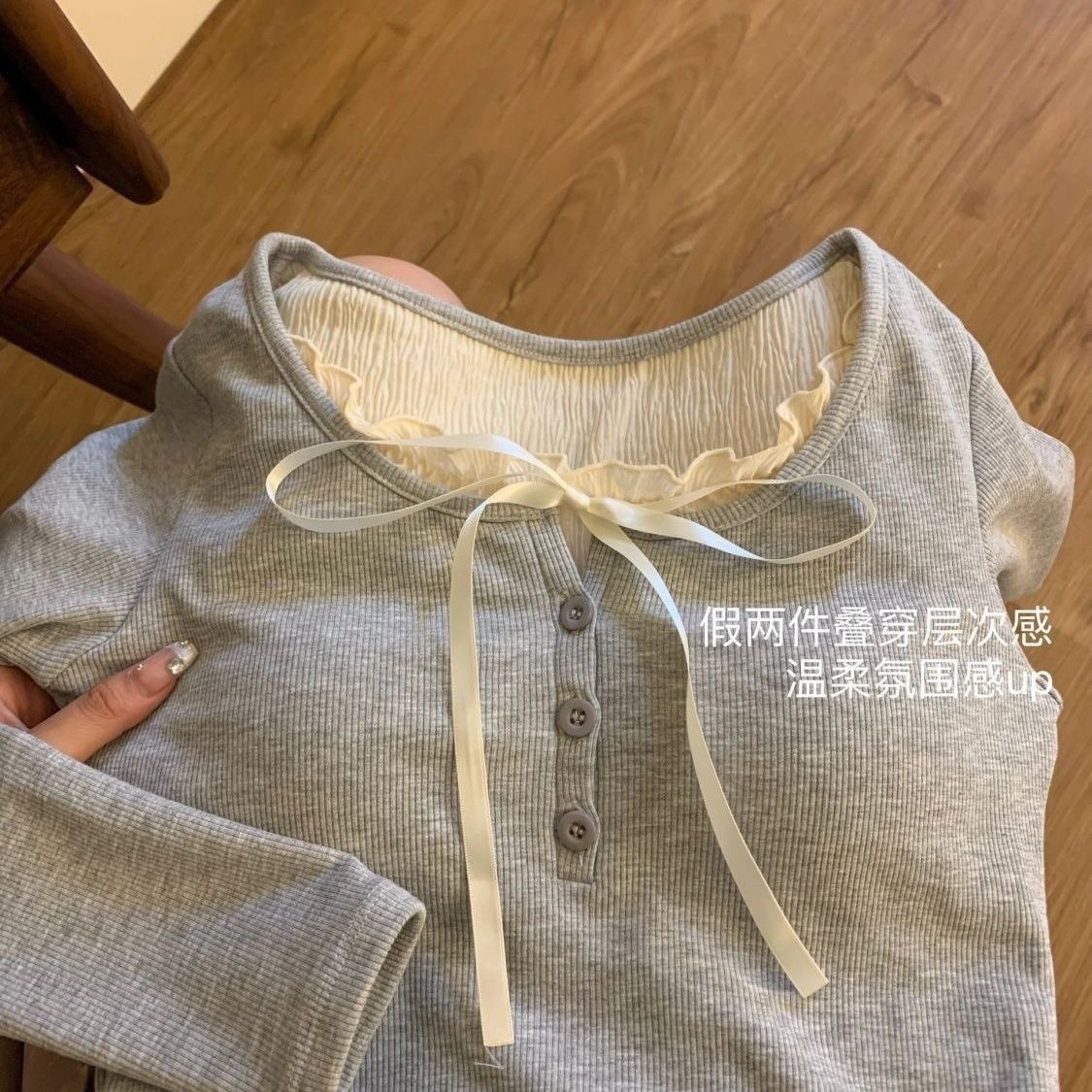 纯欲天花板保暖内衣假两件打底衫木耳边内搭长袖T恤女上衣潮流ins