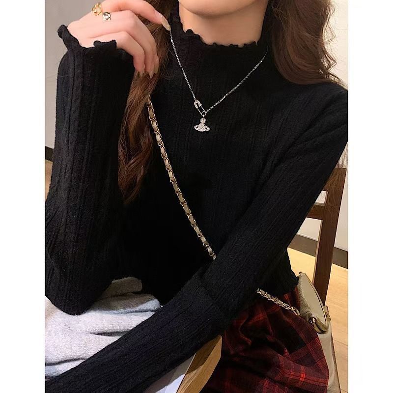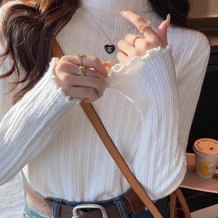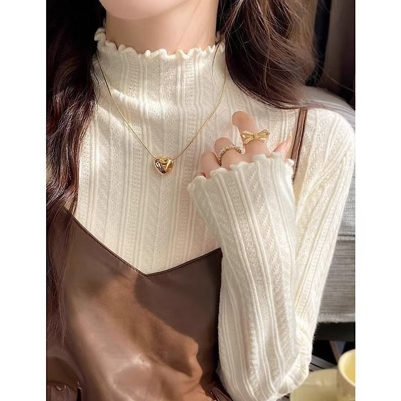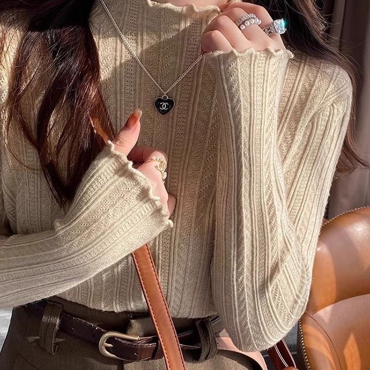 杏色半高领毛衣打底衫女秋冬内搭2024年新款秋冬木耳边针织衫上衣