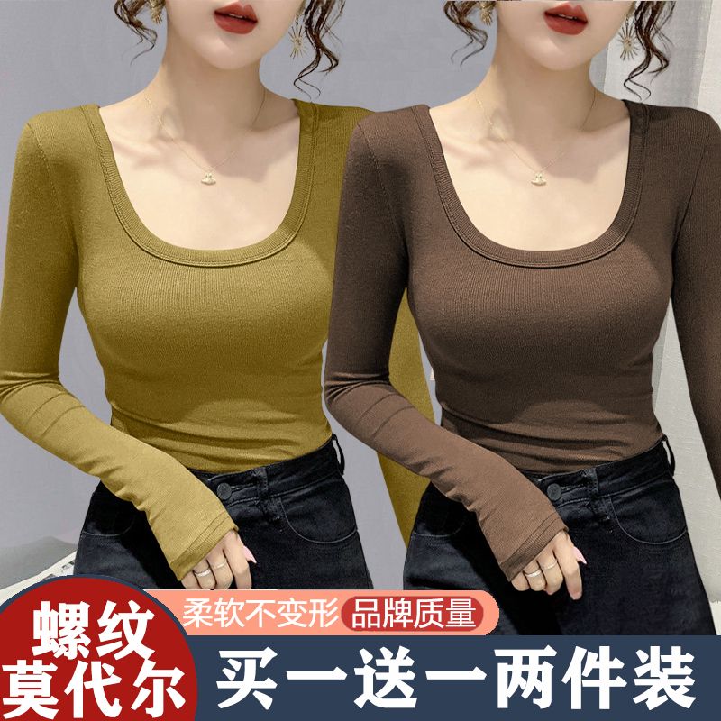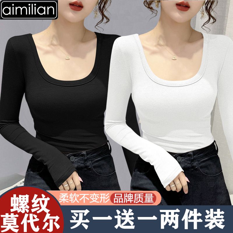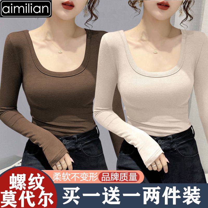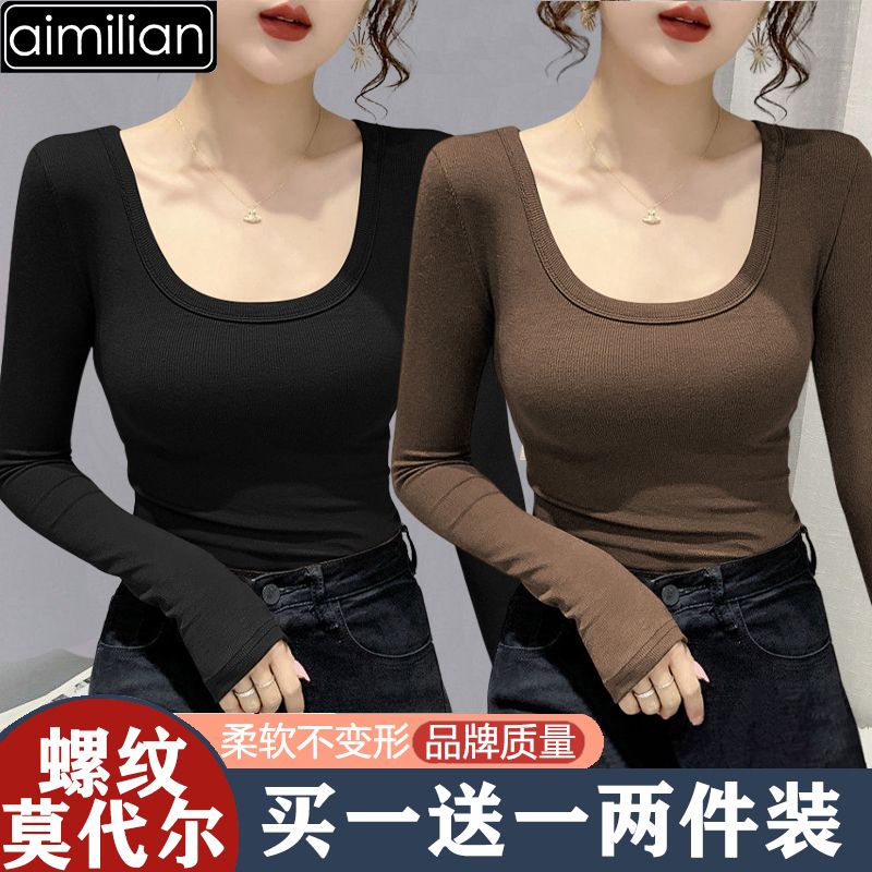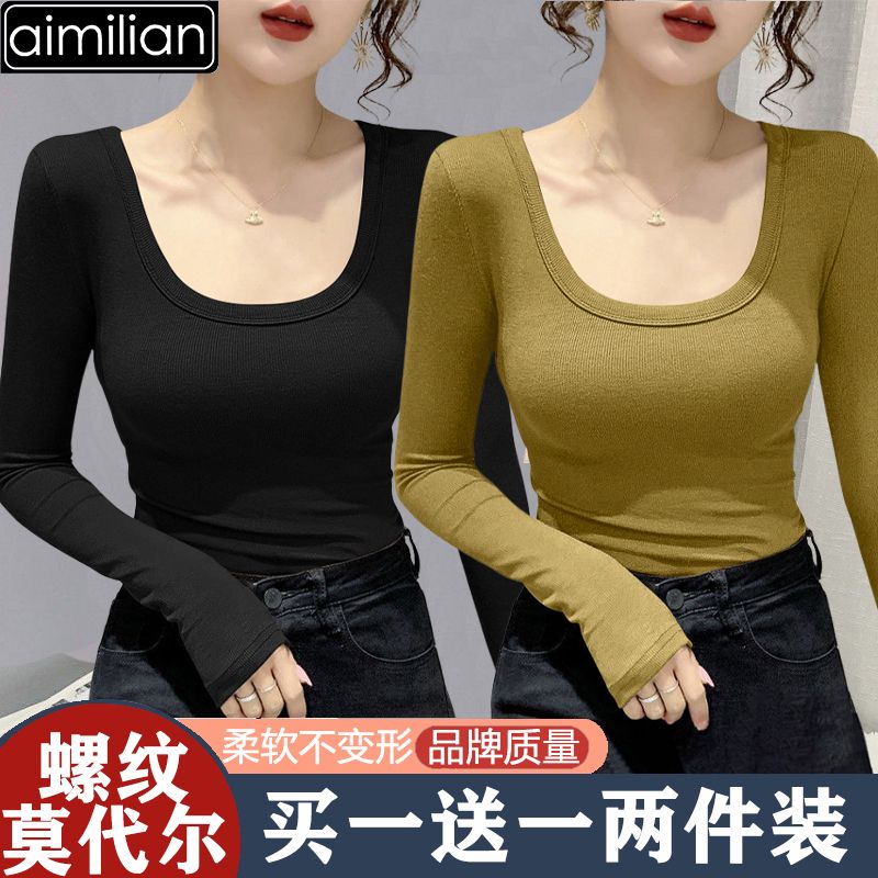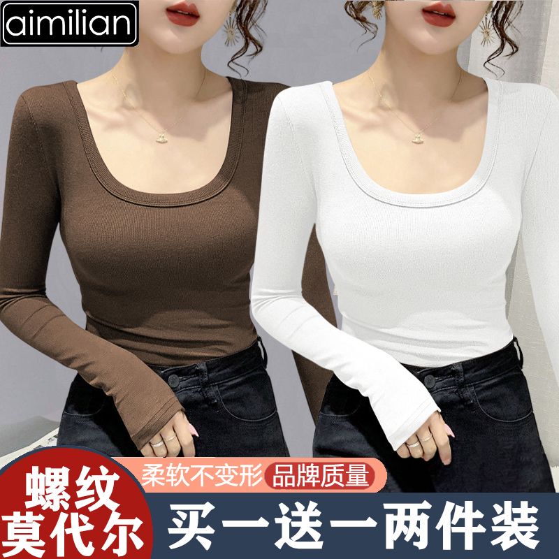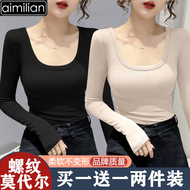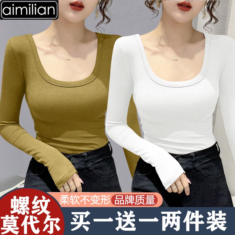 aimilian莫代尔螺纹圆领长袖打底衫女春秋洋气修身显瘦内搭上衣服