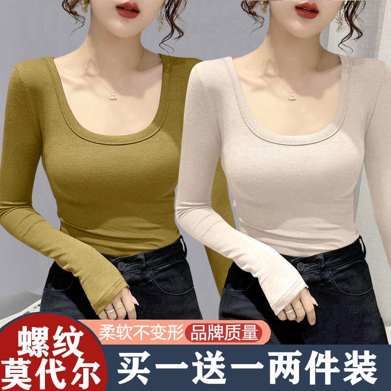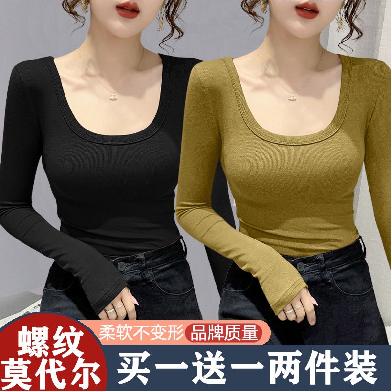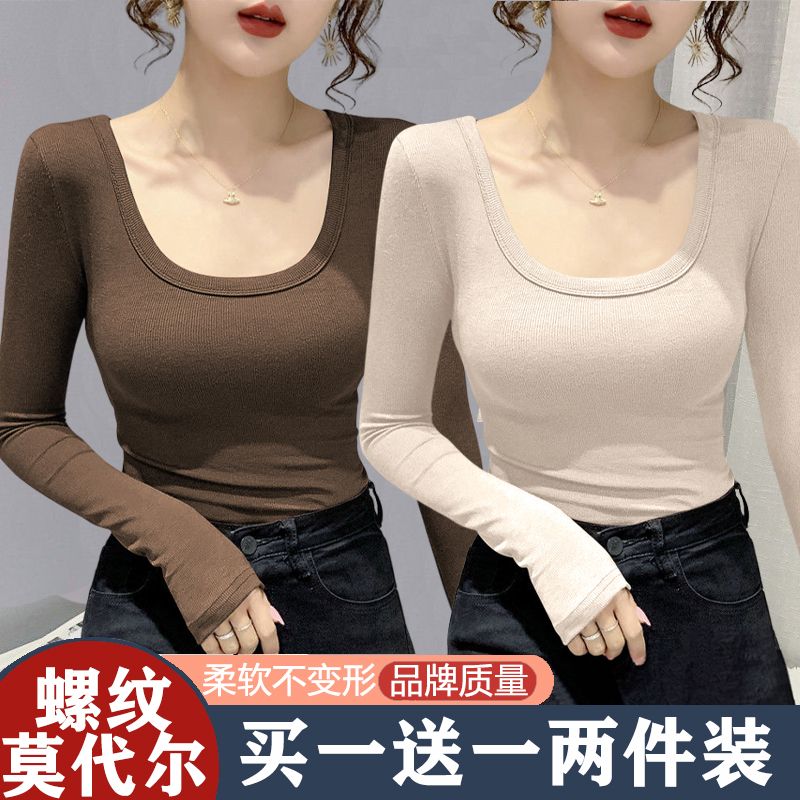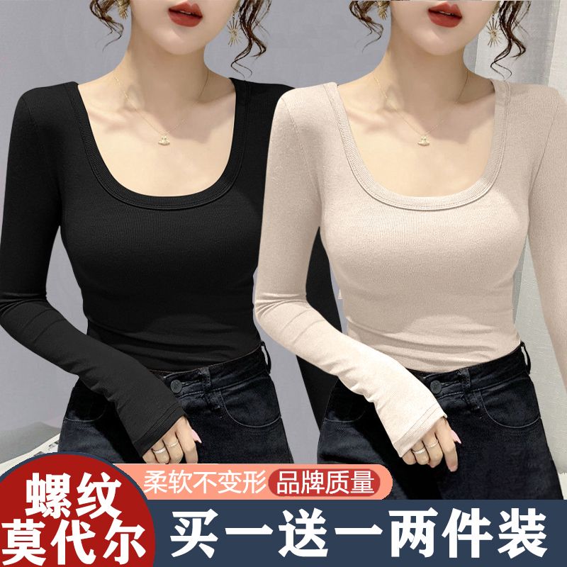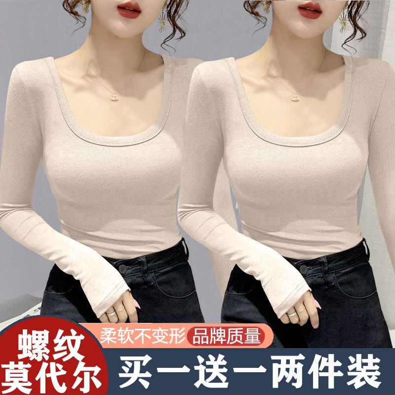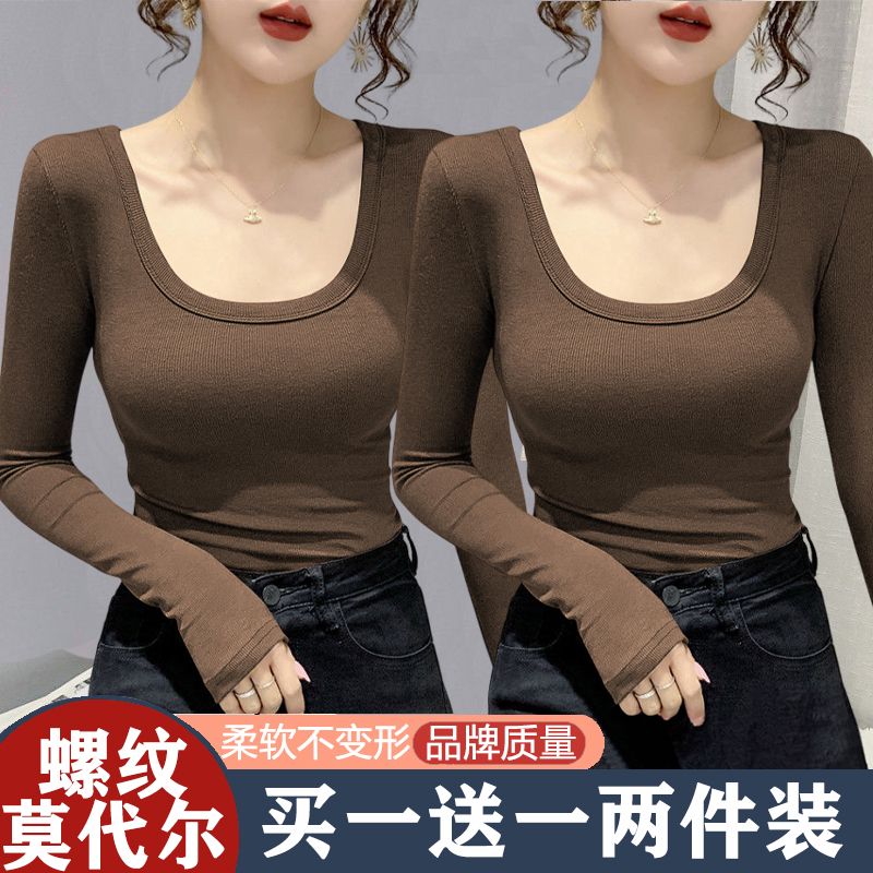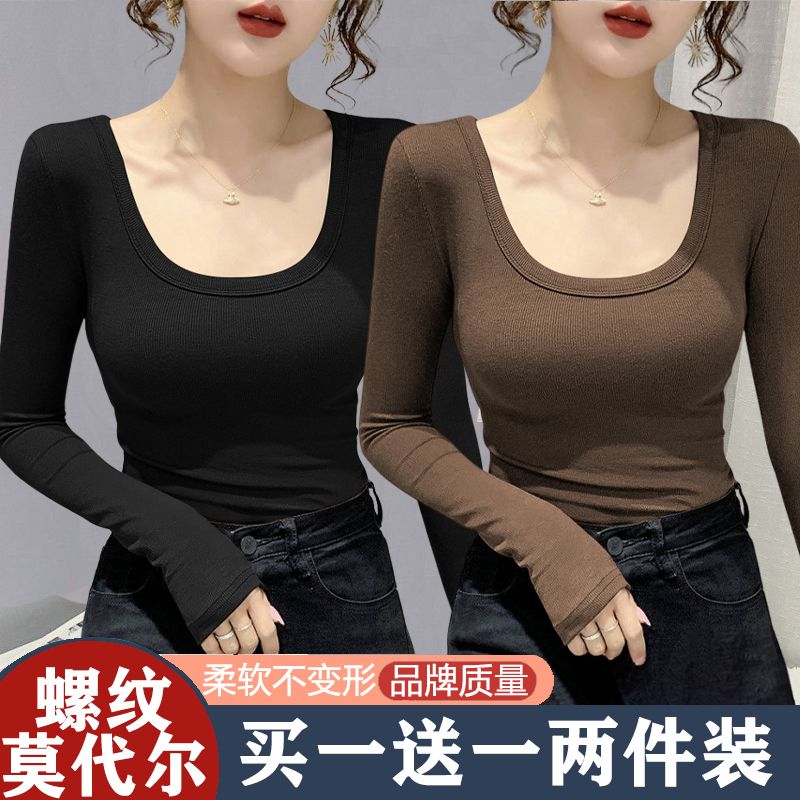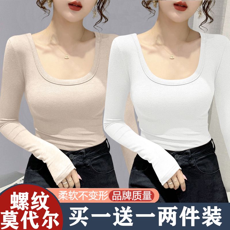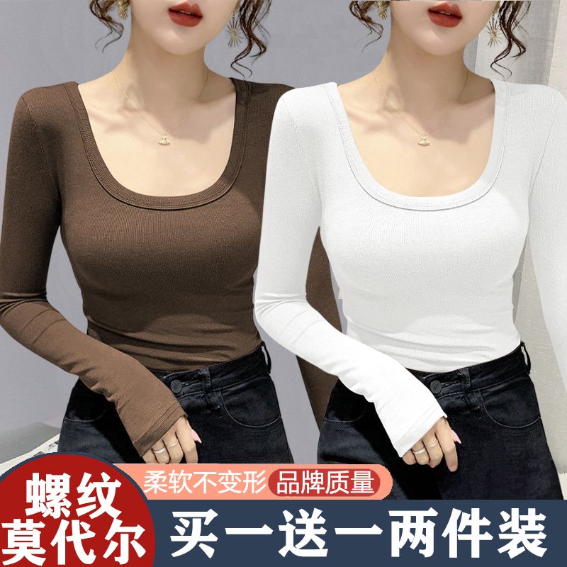 aimilian莫代尔螺纹圆领长袖打底衫女春秋洋气修身显瘦内搭上衣服