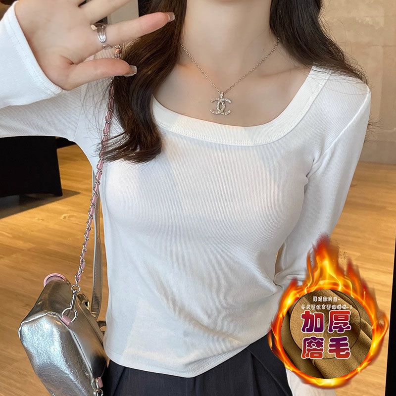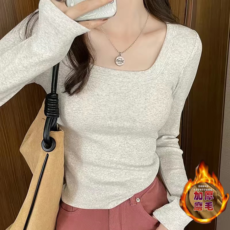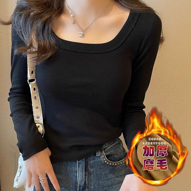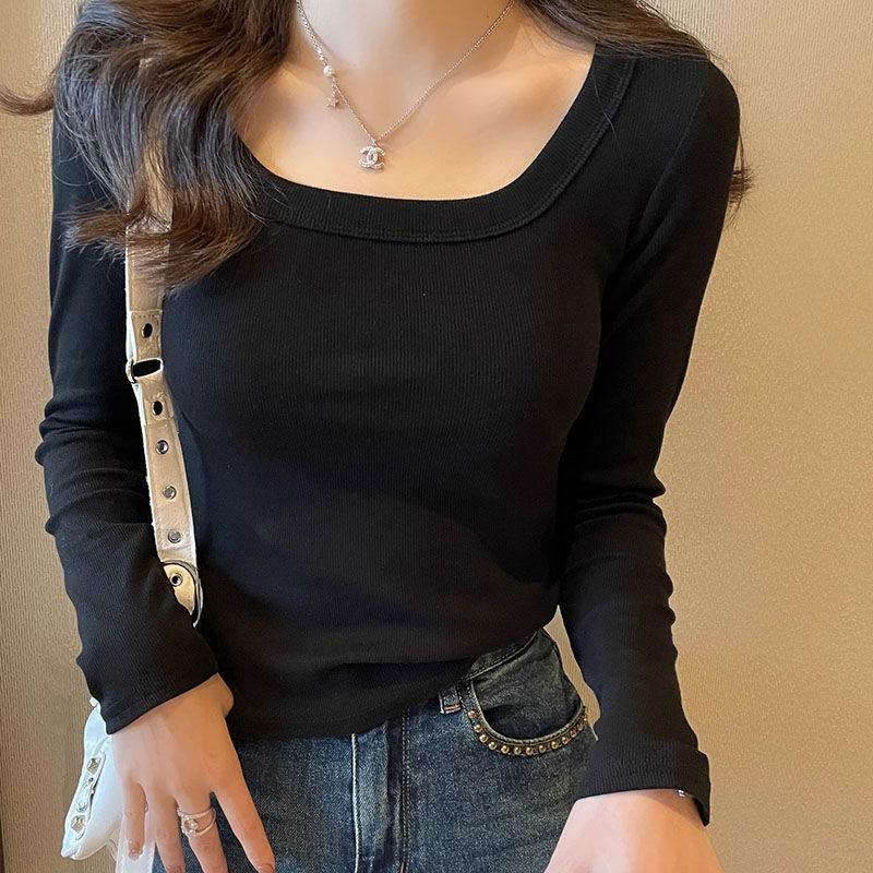 方领正肩2024秋冬纯棉韩版简约上衣t恤女纯色修身显瘦长袖打底衫