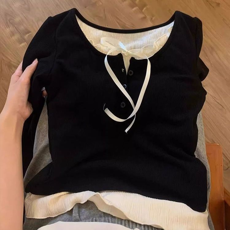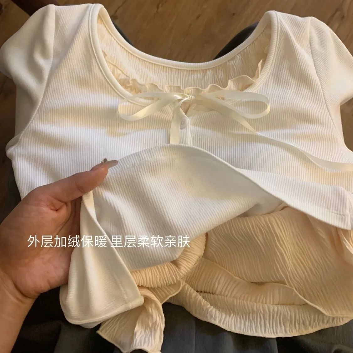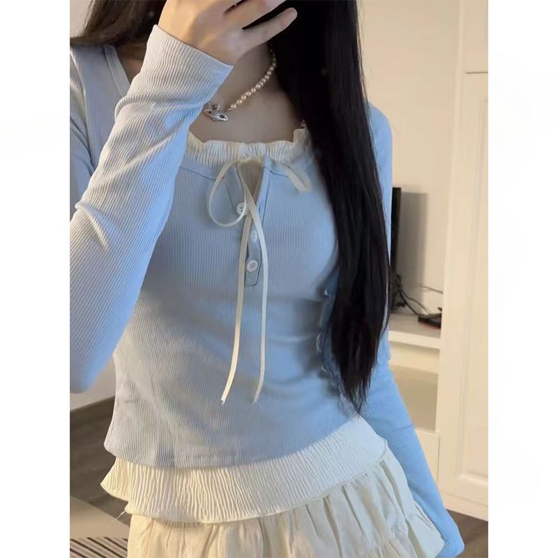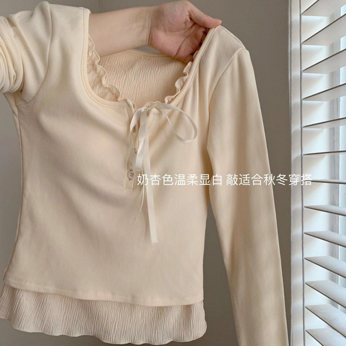 长袖芭蕾新款甜美蝴蝶结耳边绑带T恤秋冬打底修身设计上衣两件