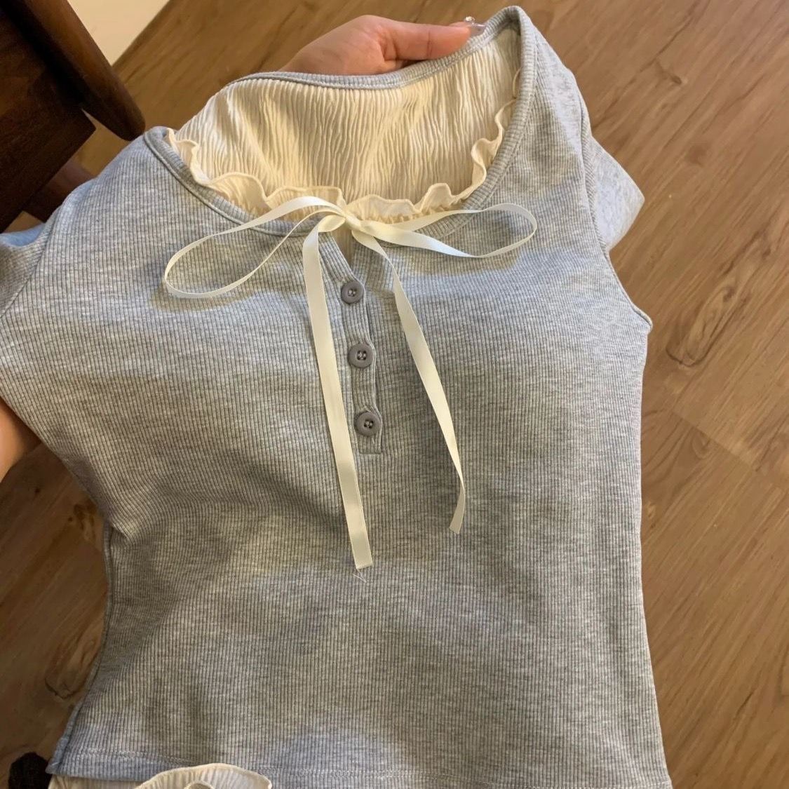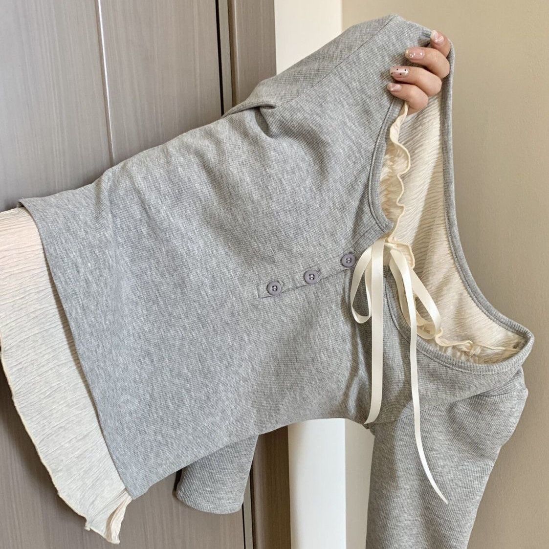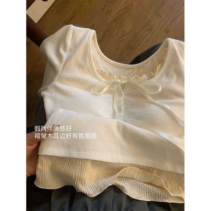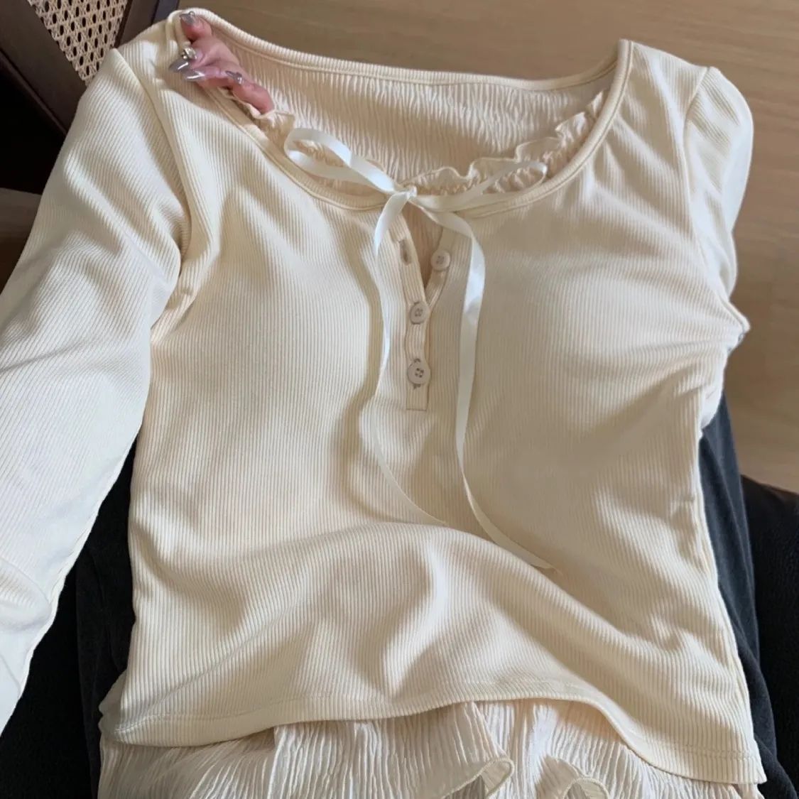 长袖芭蕾新款甜美蝴蝶结耳边绑带T恤秋冬打底修身设计上衣两件