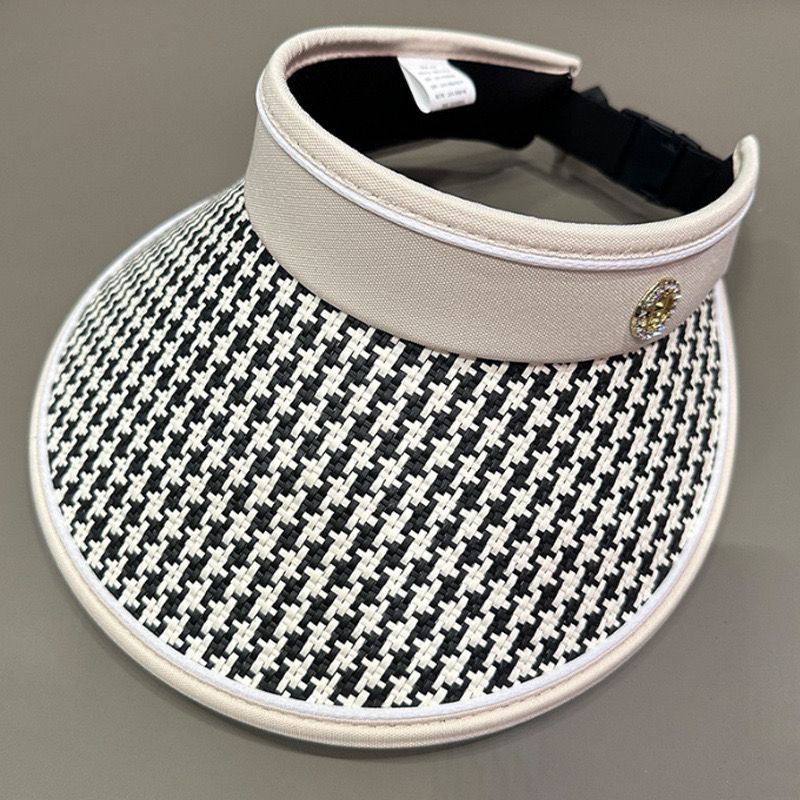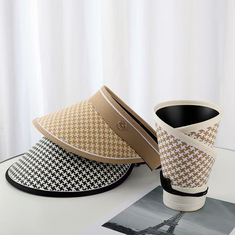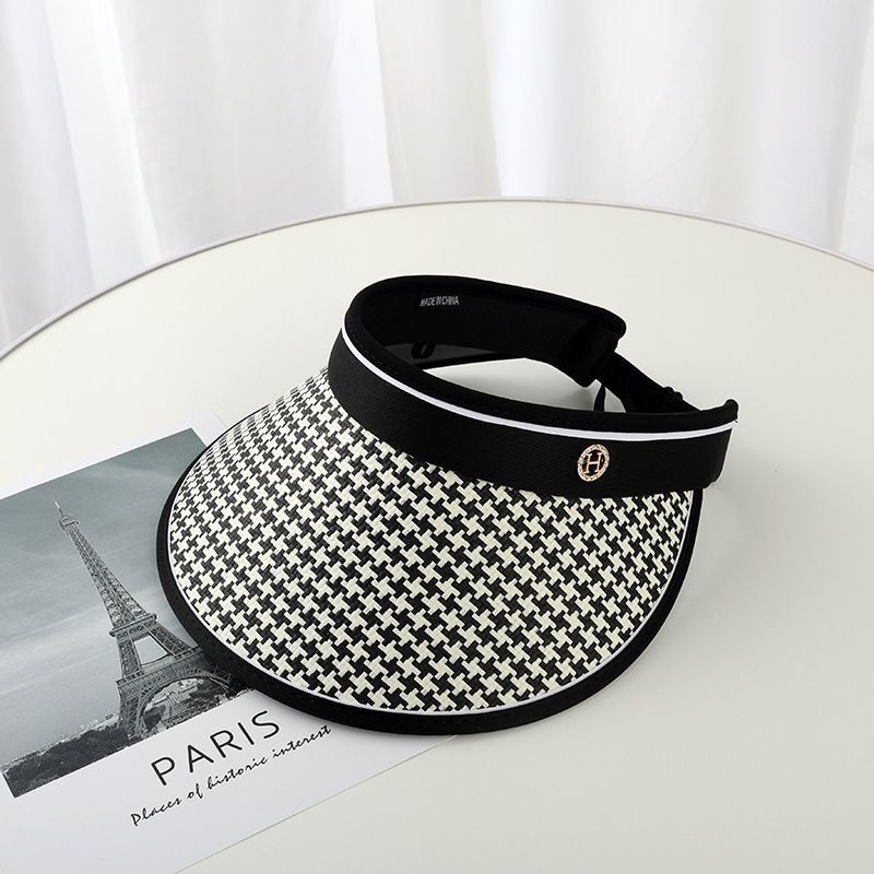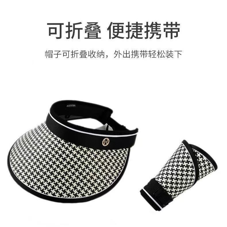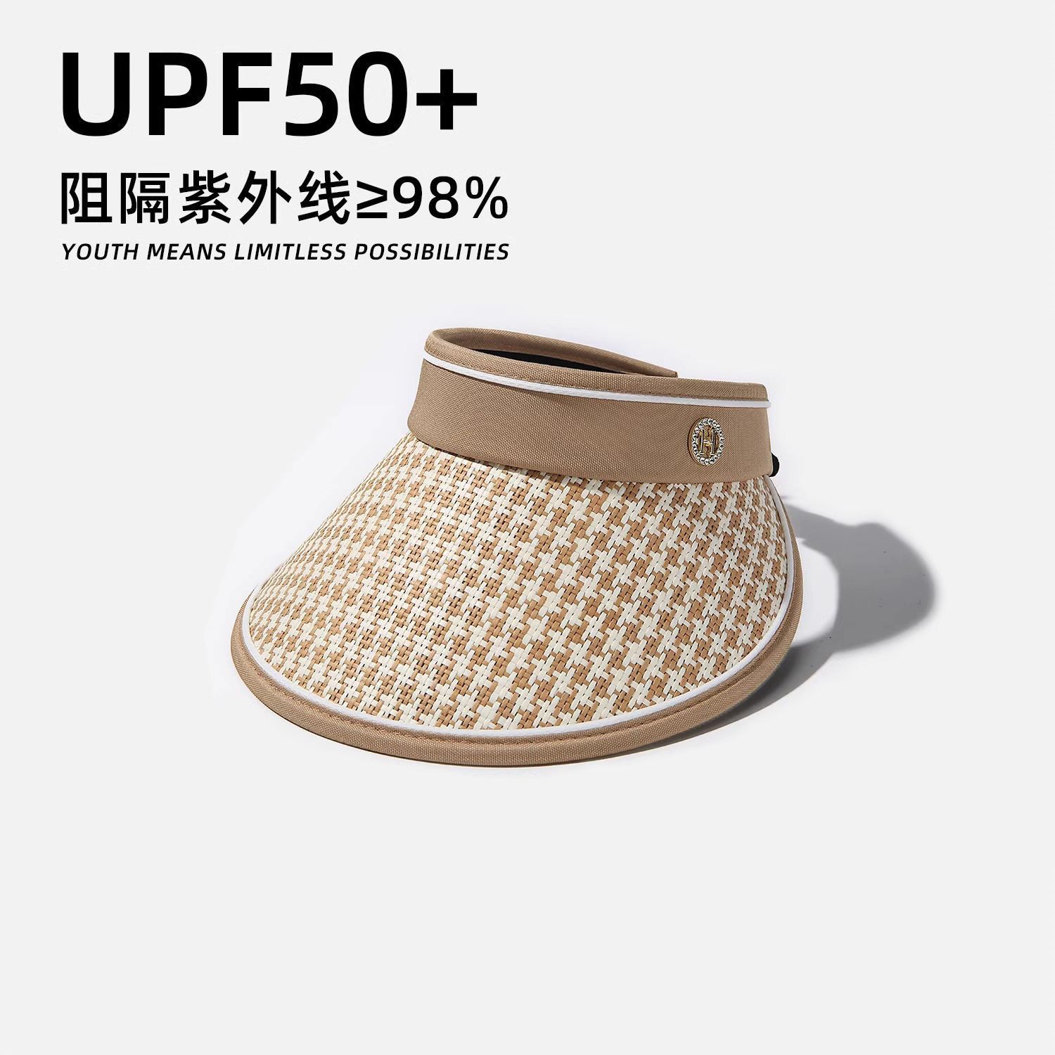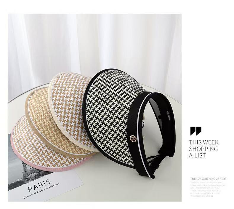 夏季大檐千鸟格太阳帽户外遮阳帽空顶防晒帽子草编防紫外线遮阳帽