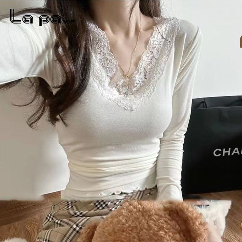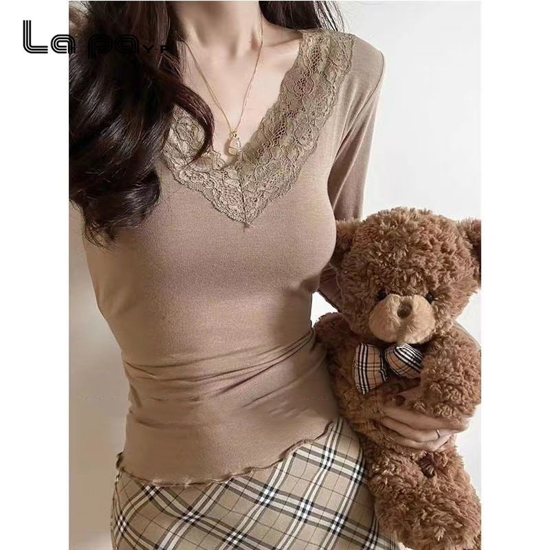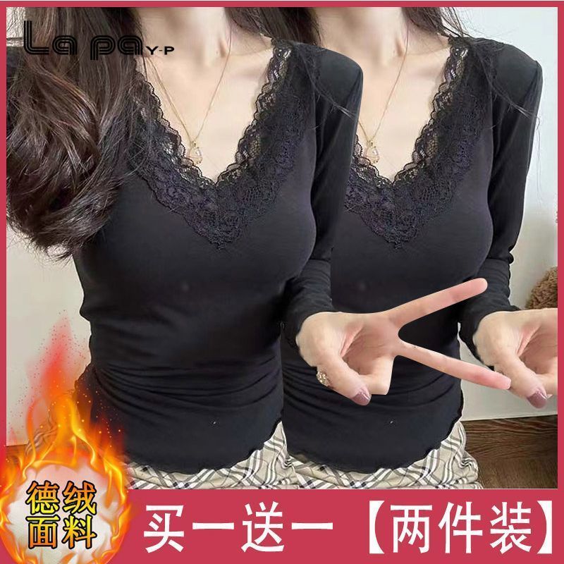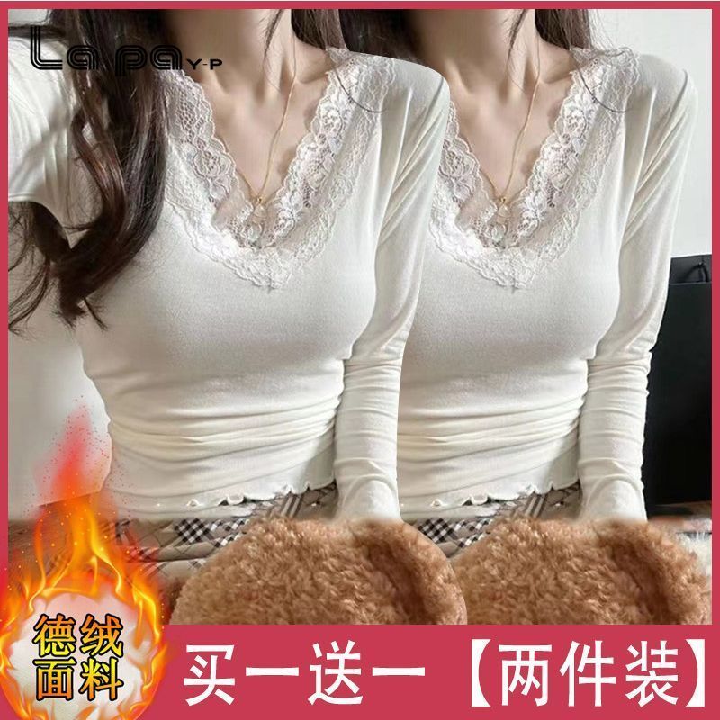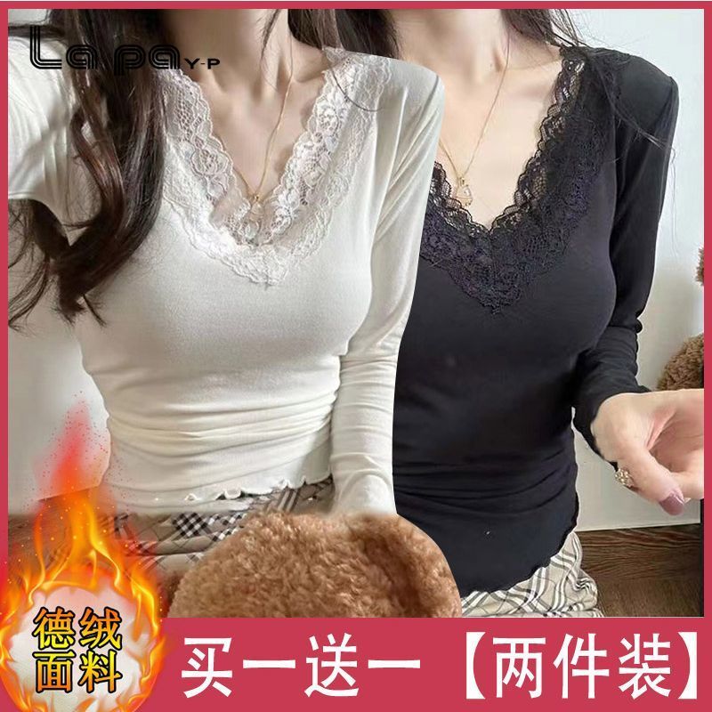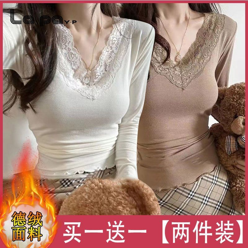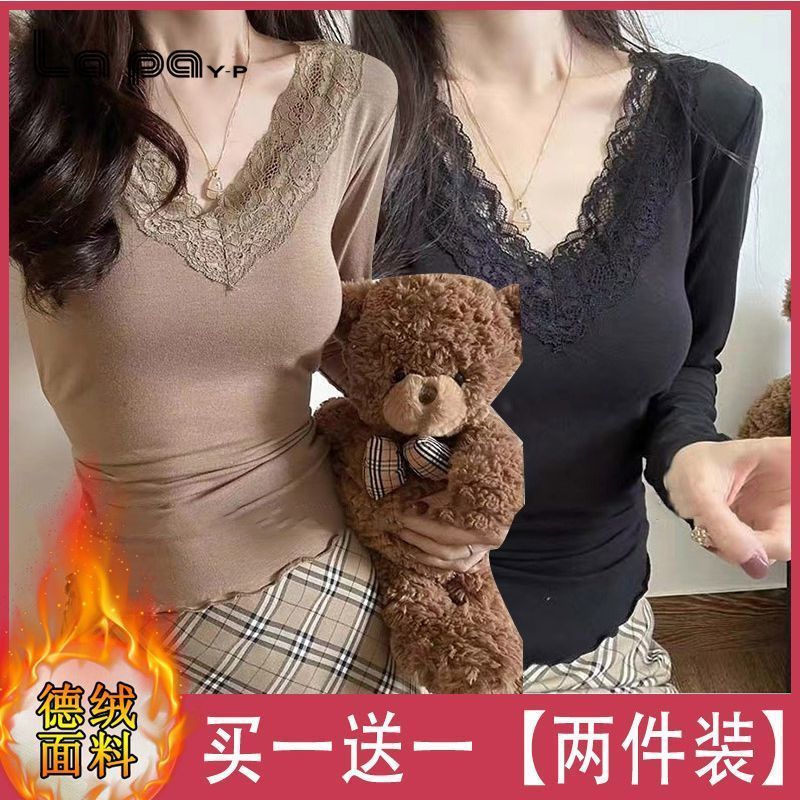 单/两件装德绒蕾丝V领长袖T恤女秋冬新款保暖内搭打底衫纯欲上衣