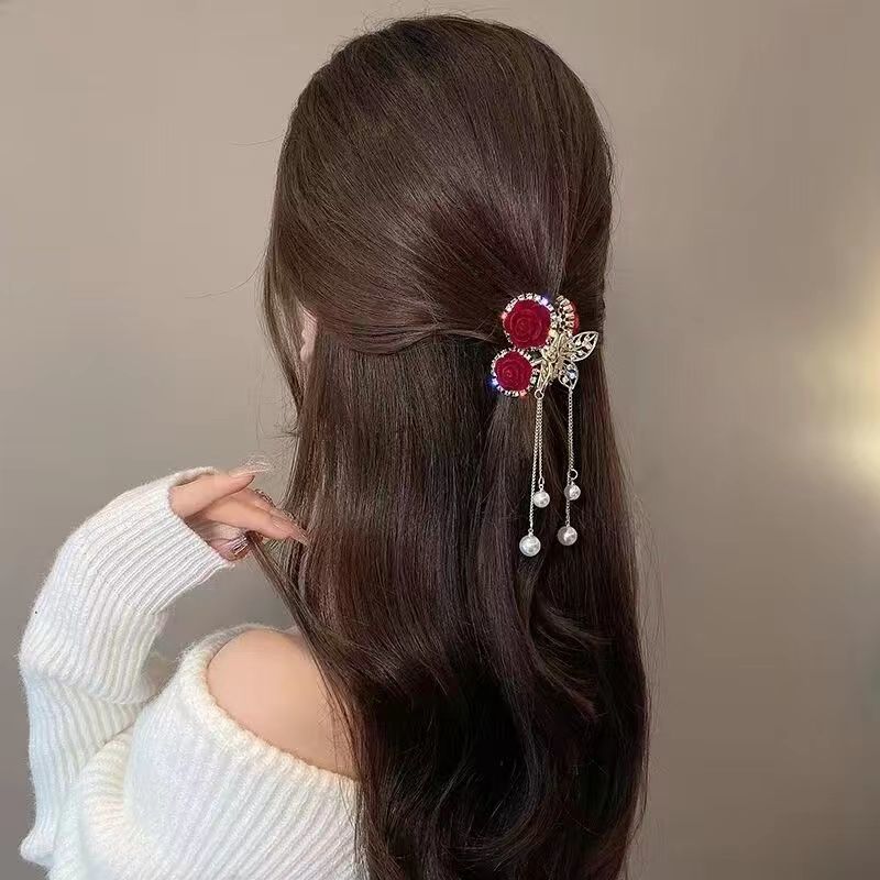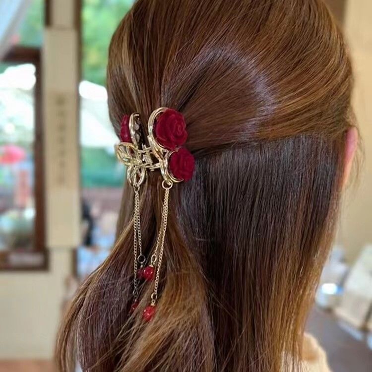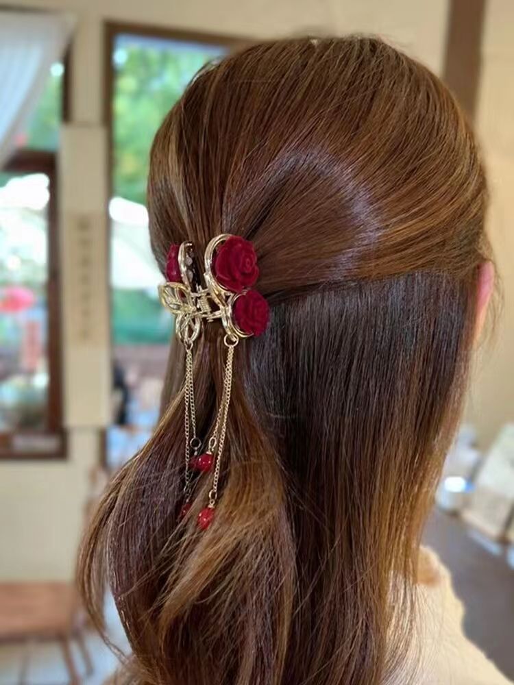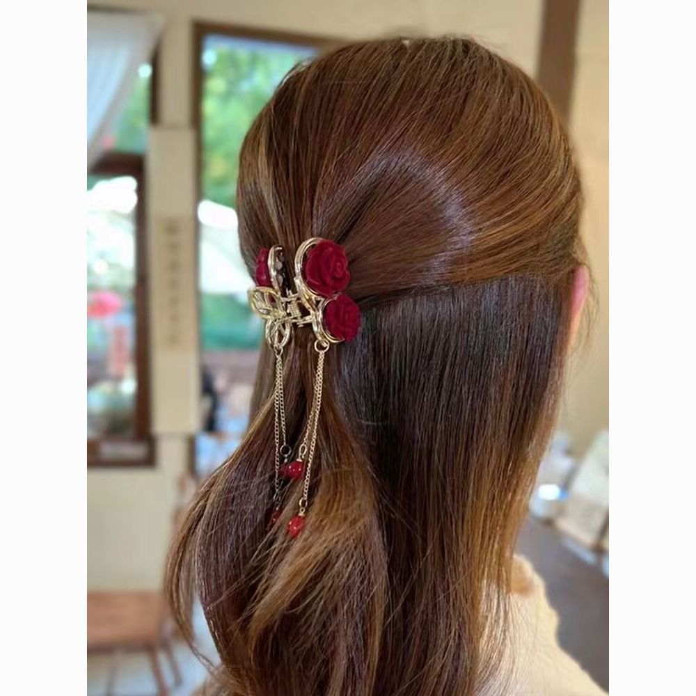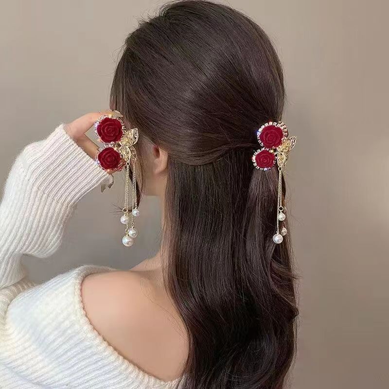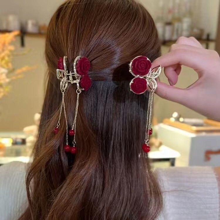 红色玫瑰花樱桃流苏小抓夹后脑勺半扎顶夹发饰植绒高马尾发夹女