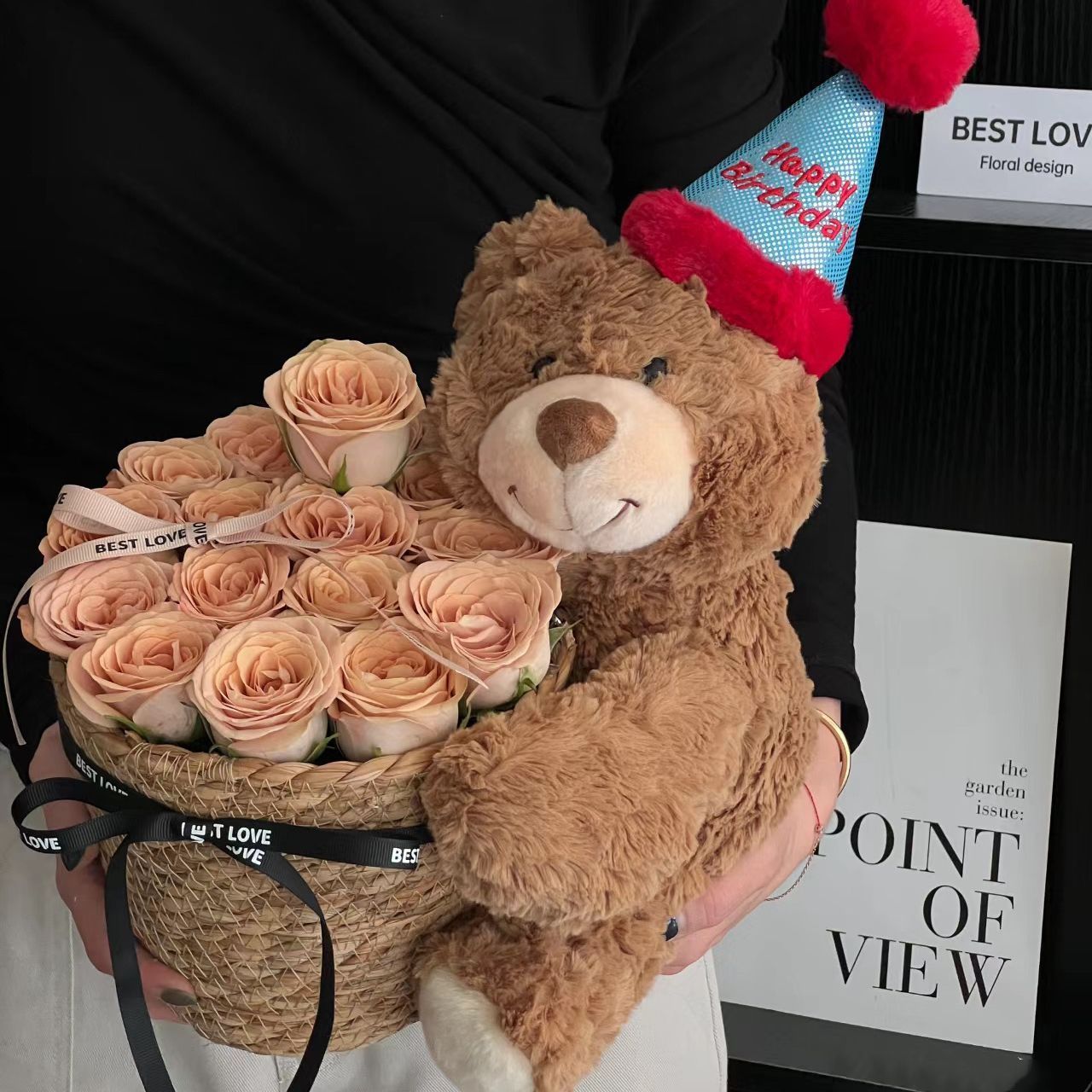 | 38cm birthday bear +11 flower baskets + gift bag lights(38cm生日小熊+11朵花篮+礼袋灯) | USD $7.29 | 999999 piece available |