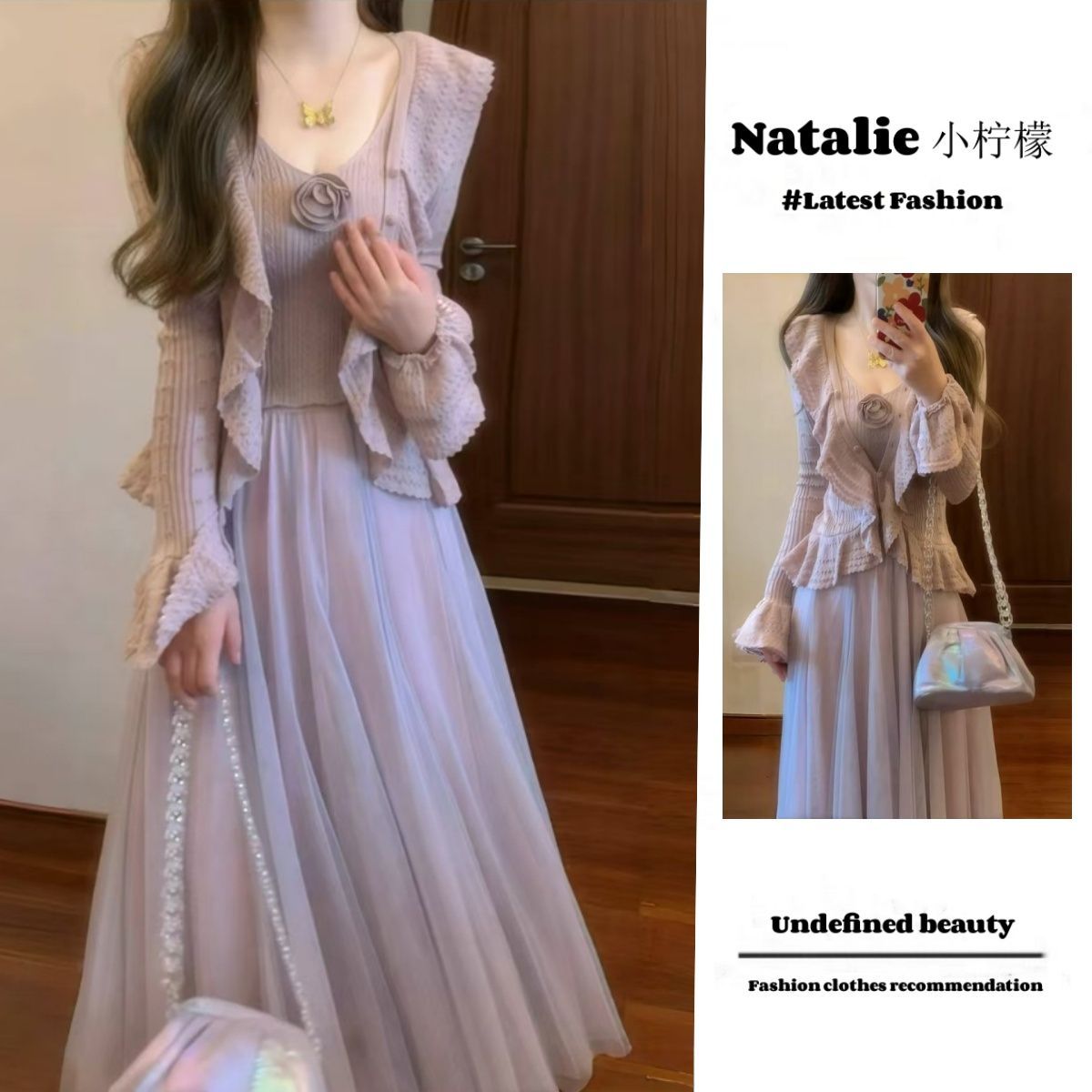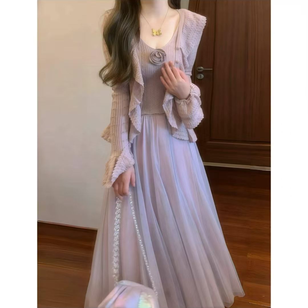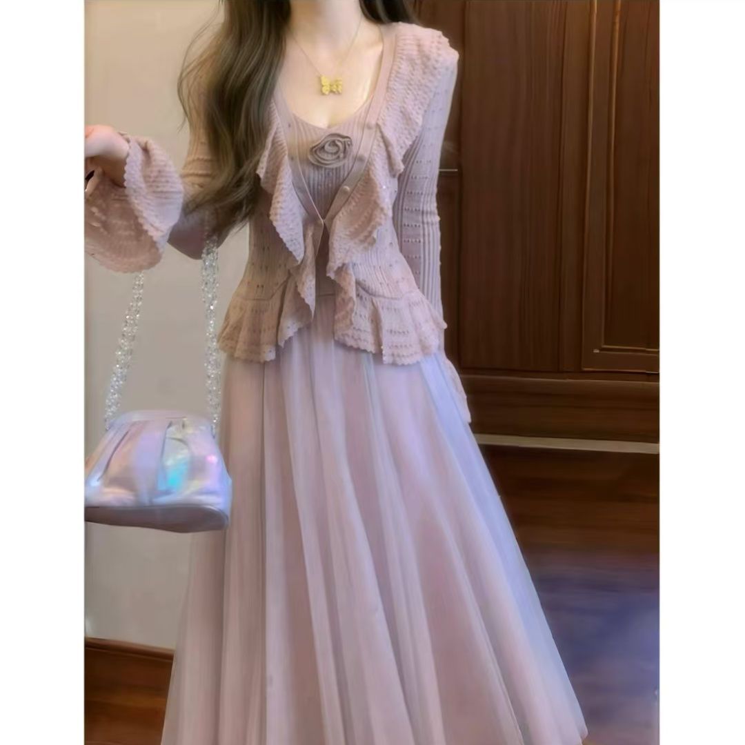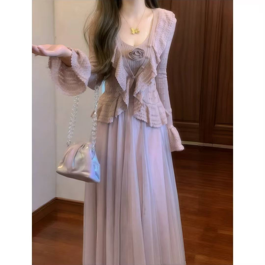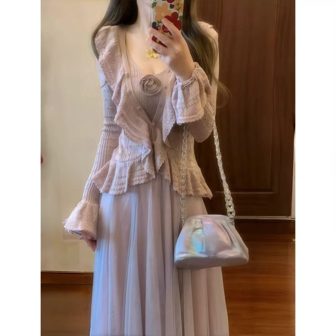 韩版秋季重工钩花针织开衫+吊带上衣+网纱半身裙仙气套装裙ins风