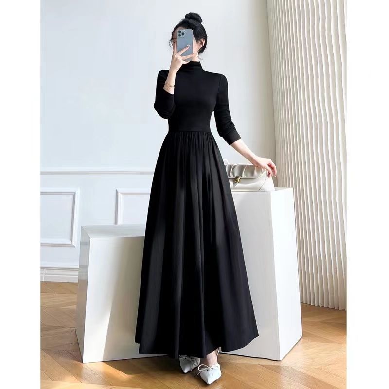 法式半高领拼接黑色连衣裙冬裙显瘦高级感气质内搭入秋长裙