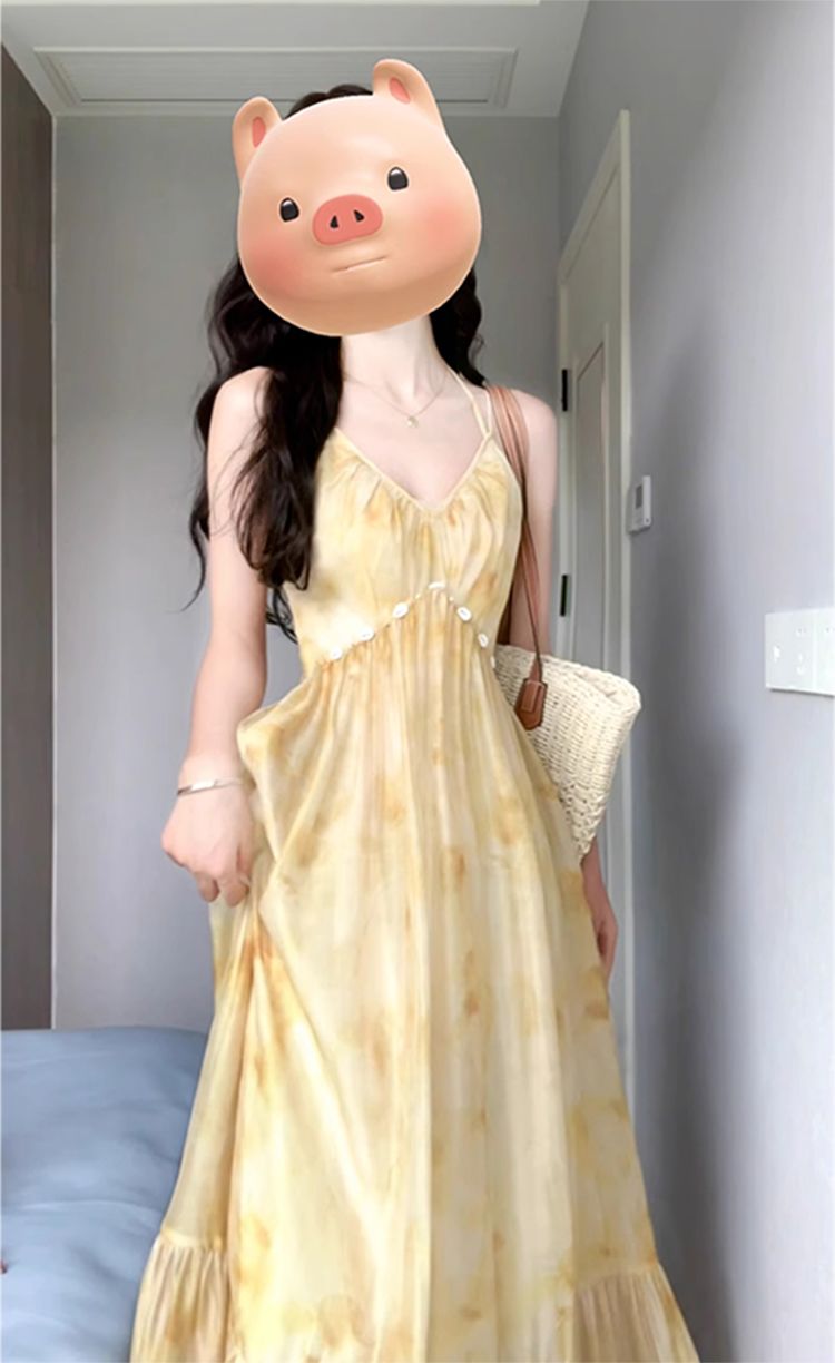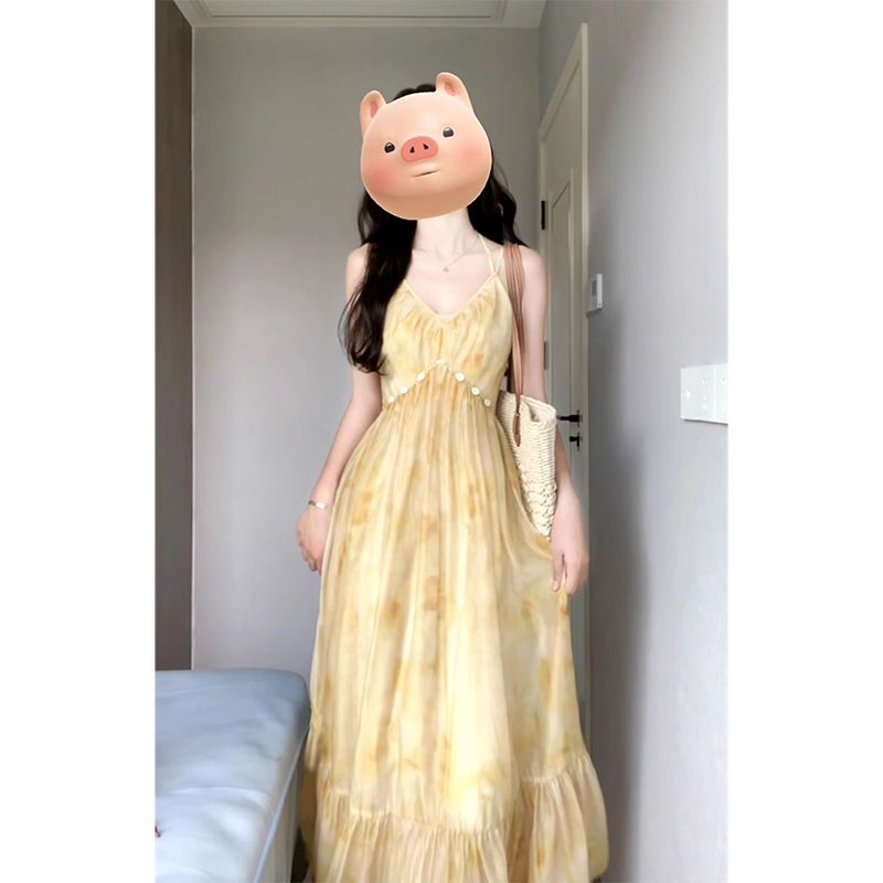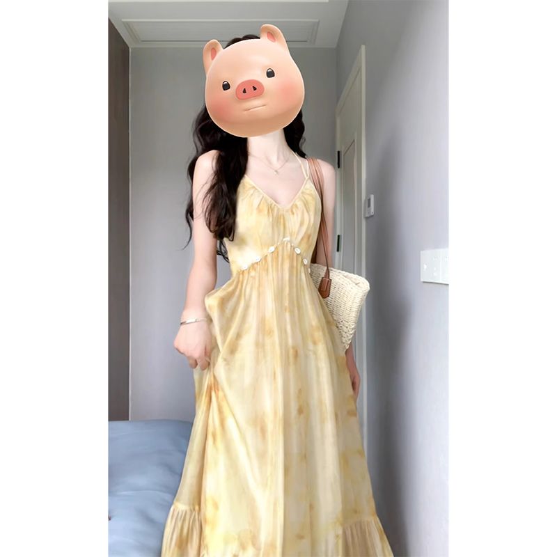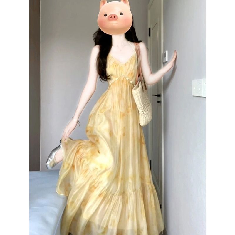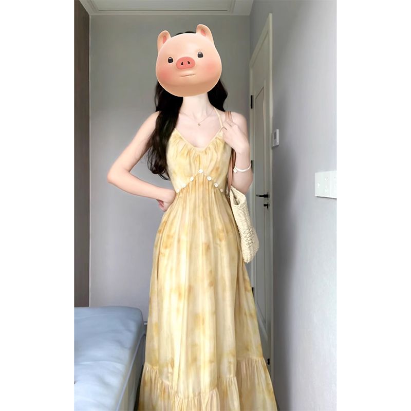 茶歇法式黄色晕染吊带连衣裙女夏季2024新款漂亮独特海边度假长裙