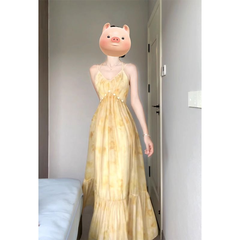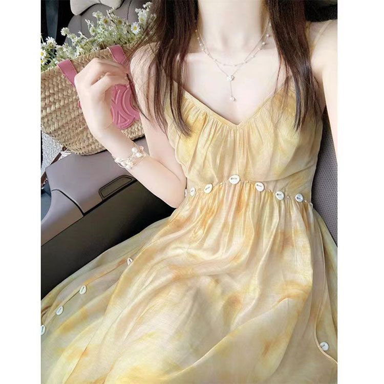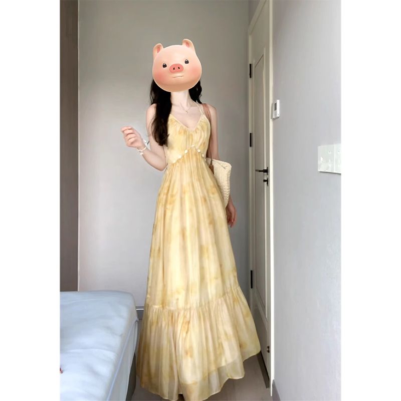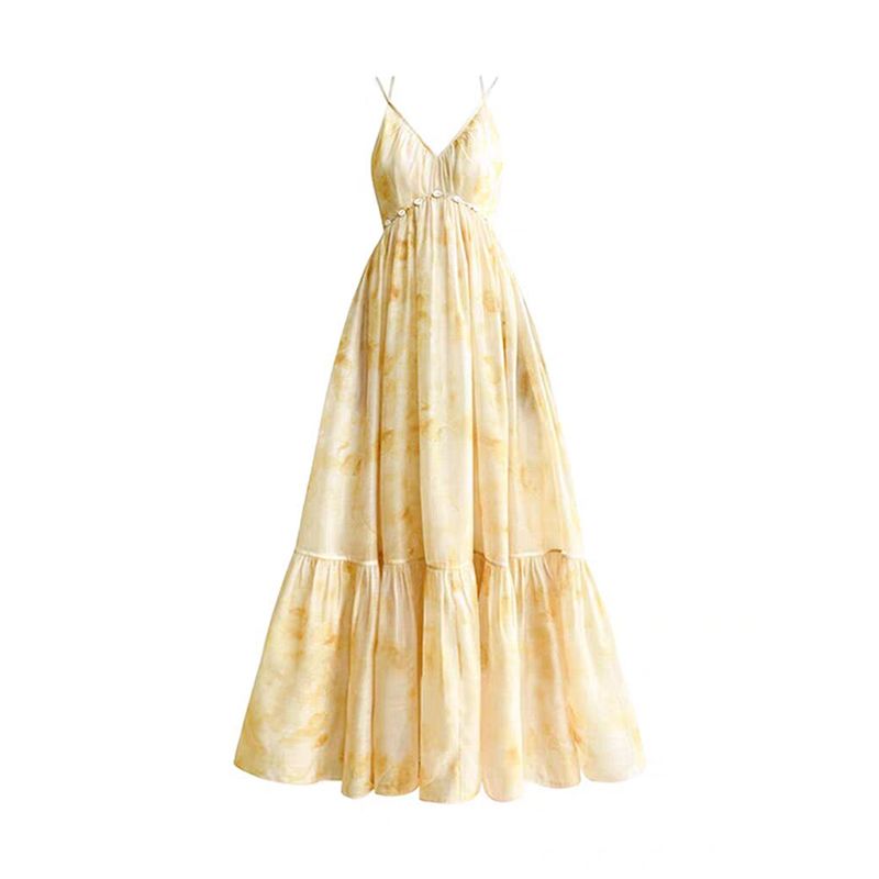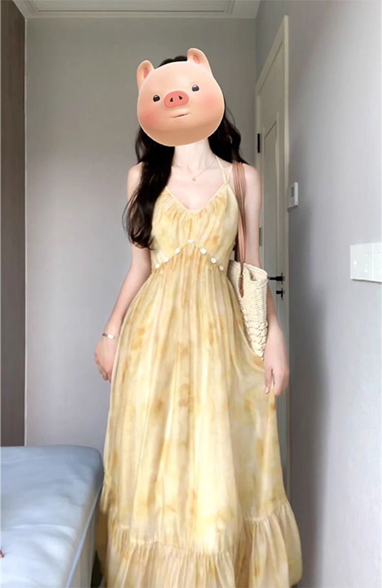 茶歇法式黄色晕染吊带连衣裙女夏季2024新款漂亮独特海边度假长裙