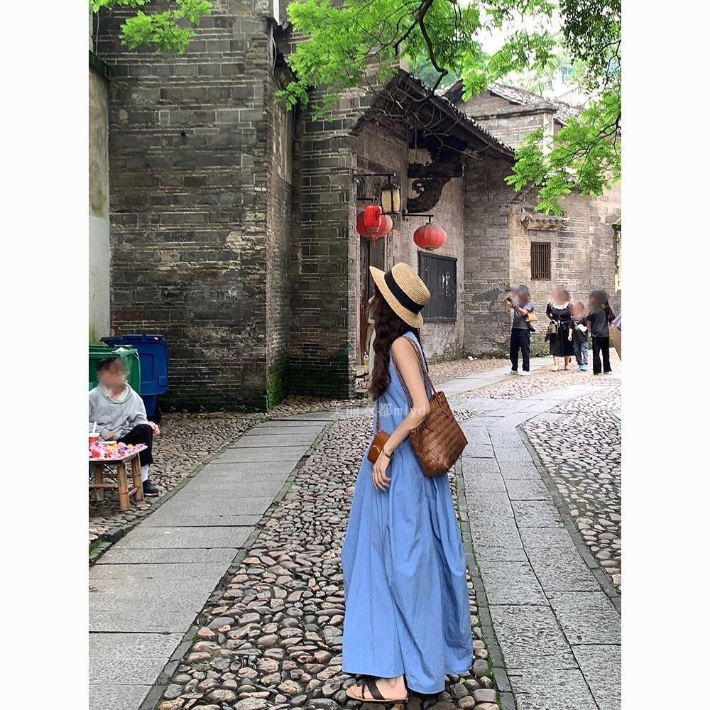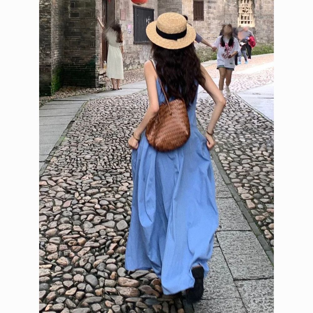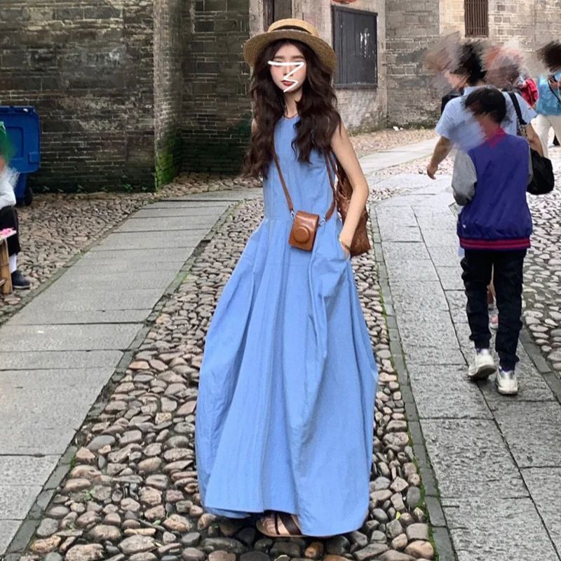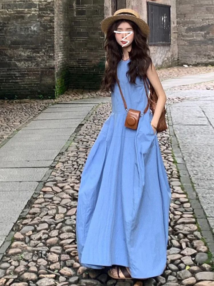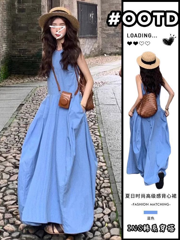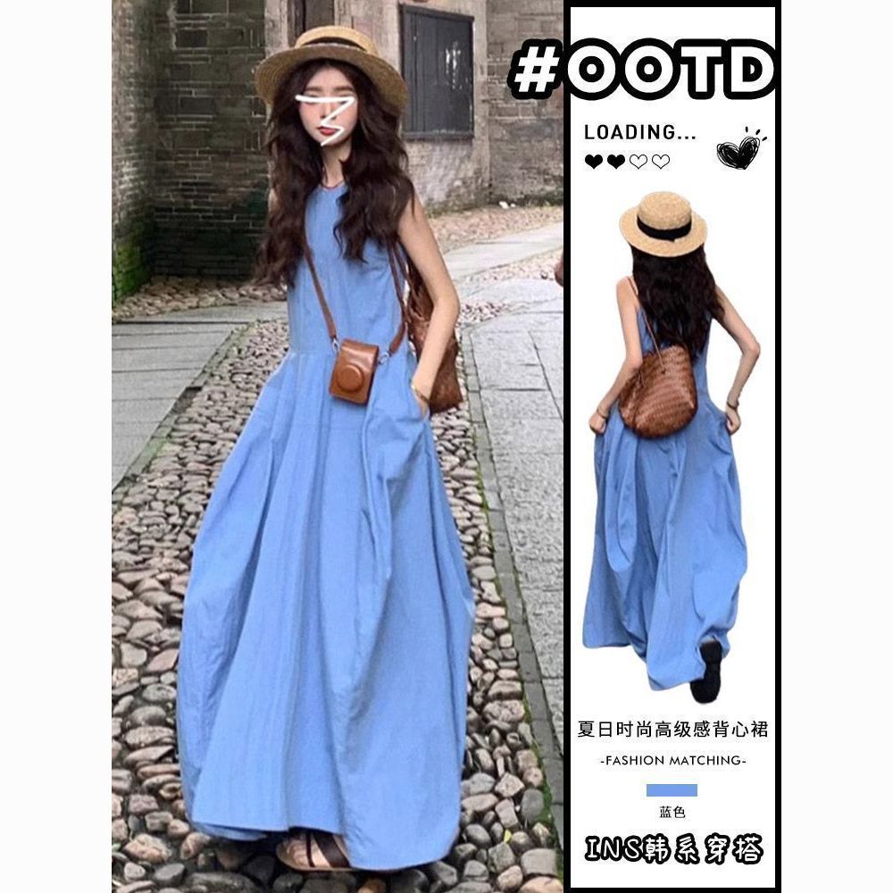超好看小众大码法式气质蓝色连衣裙女夏宽松显瘦度假风无袖背心裙
