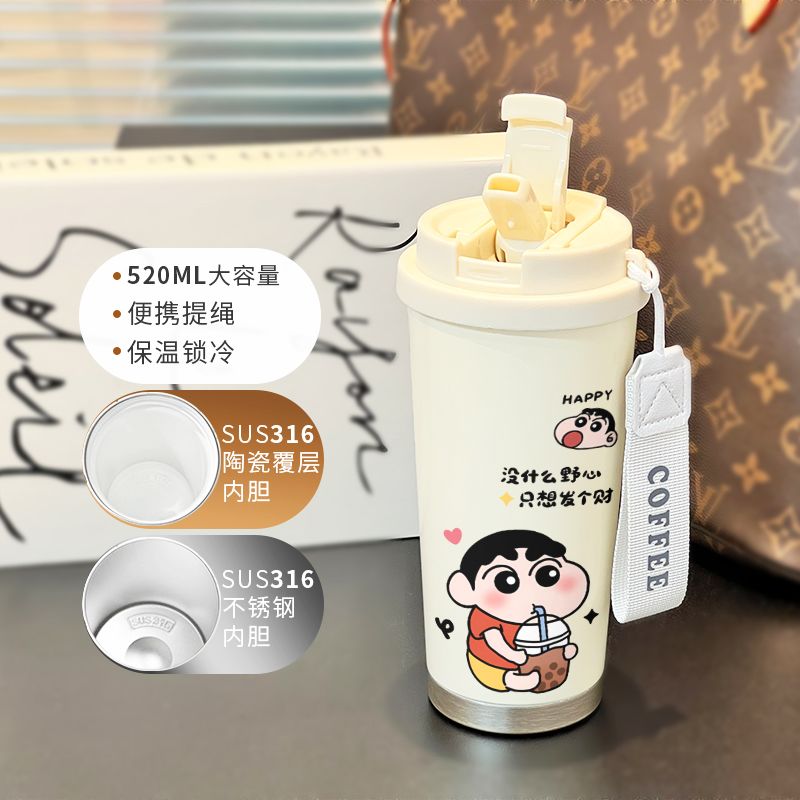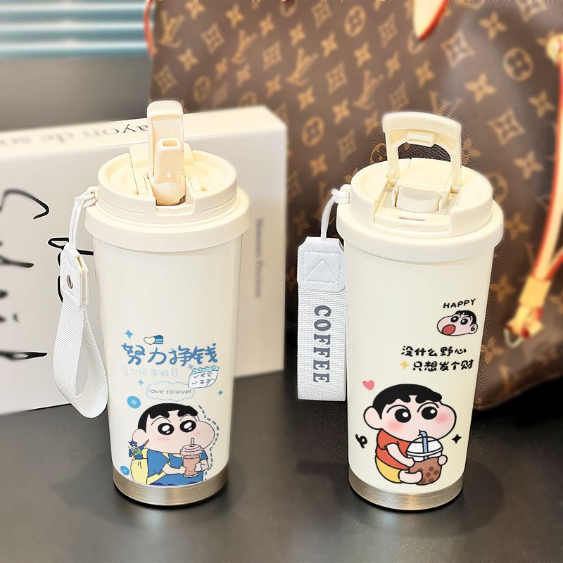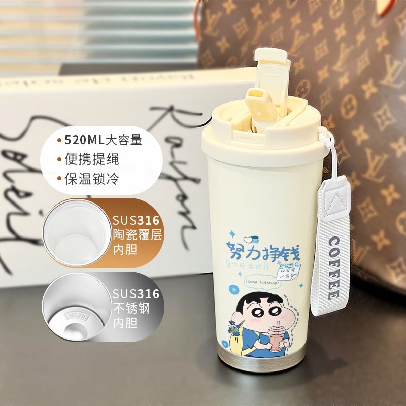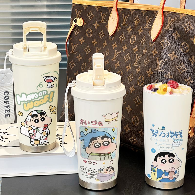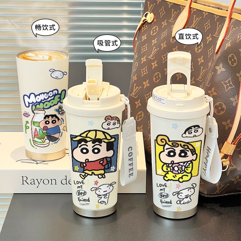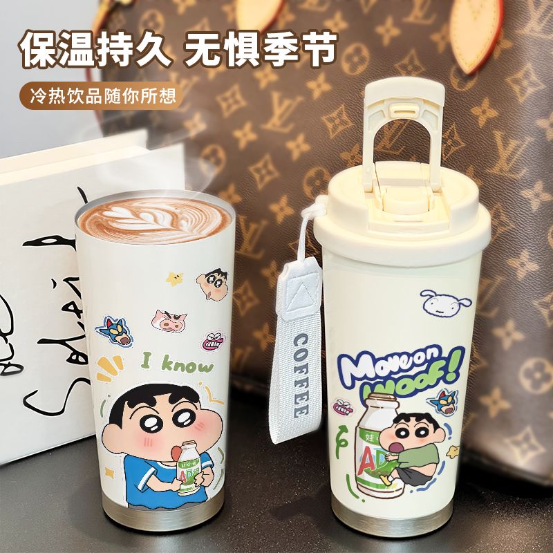 蜡笔小新保温吸管水杯女大容量高颜值外带杯不锈钢保冷双饮咖啡杯