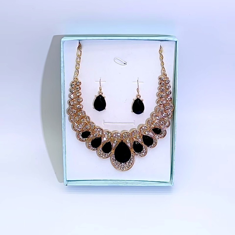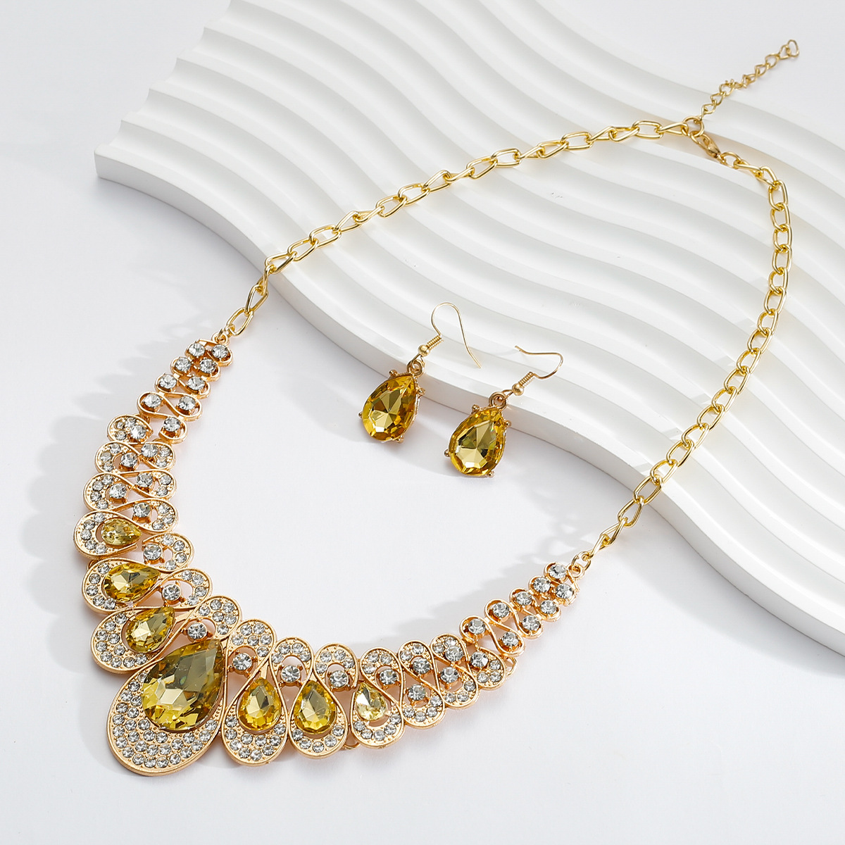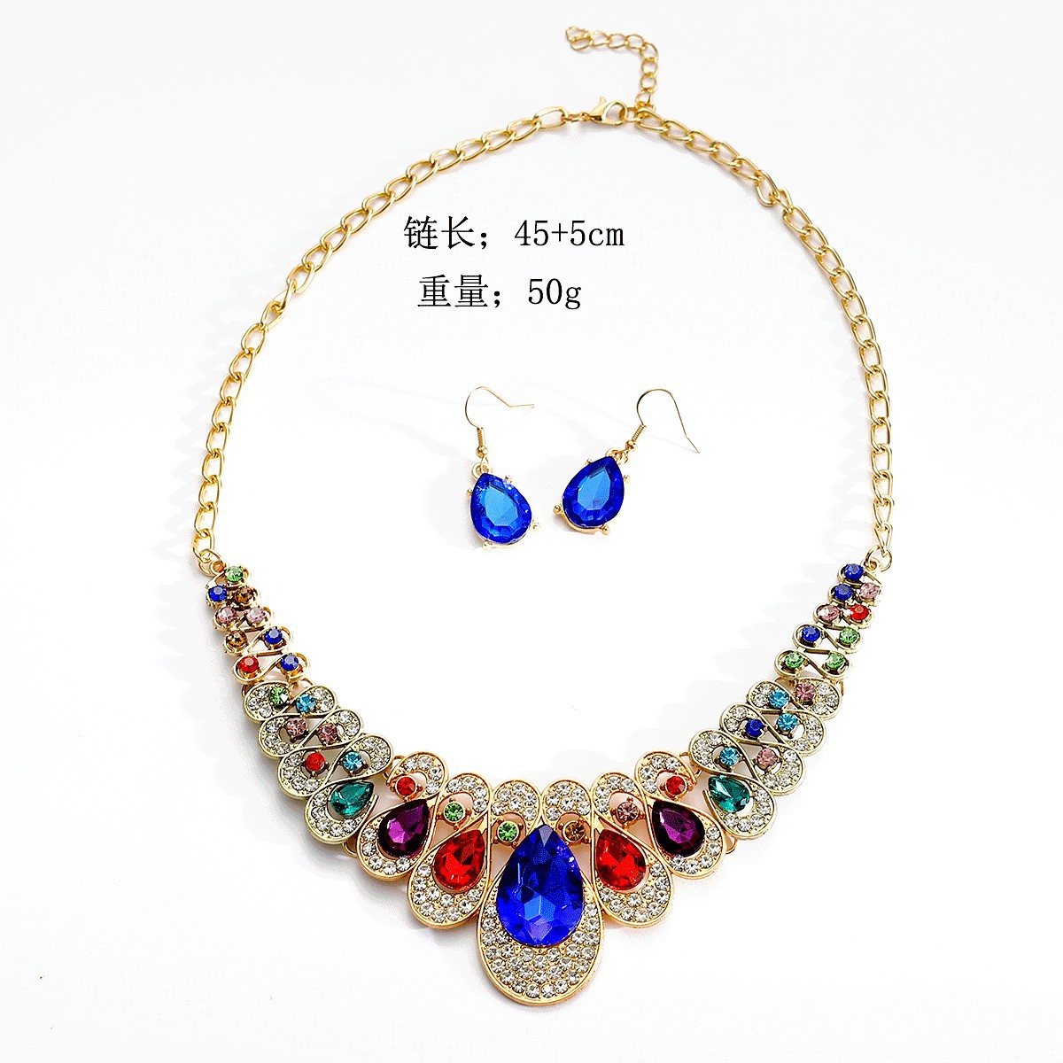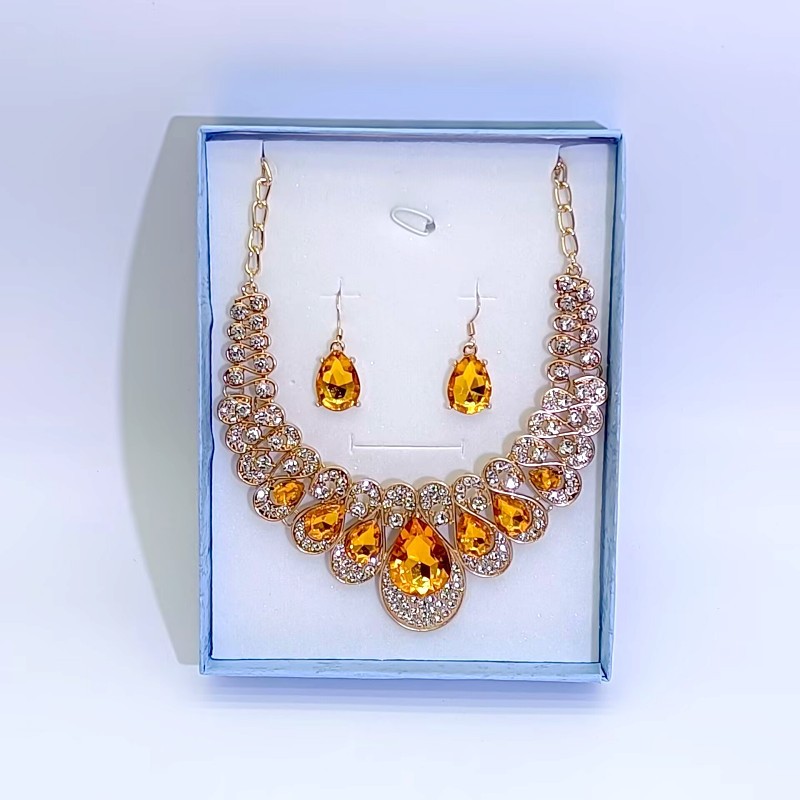 跨境欧美气质时尚夸张金属闪钻水滴宝石项链耳环套装婚礼新娘套装