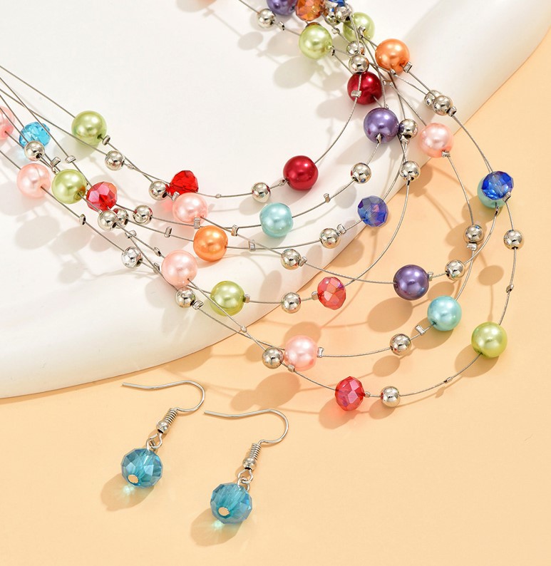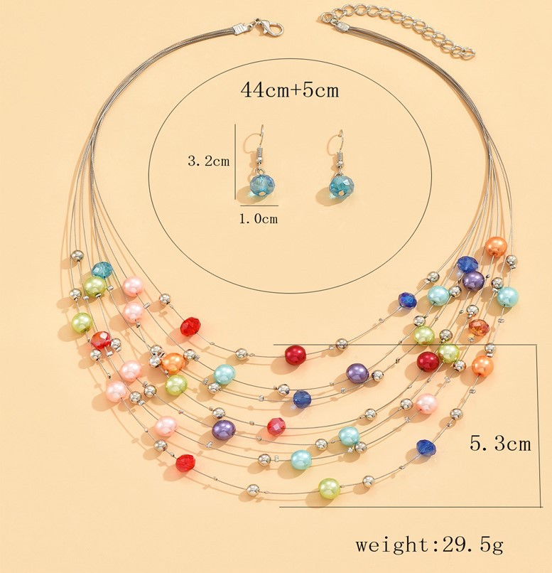 跨境欧美热销时尚百搭波西米亚风彩色珍珠水晶串珠多层项链女套装