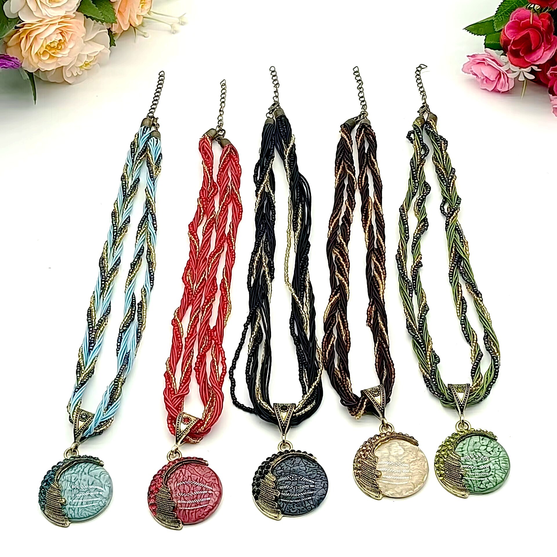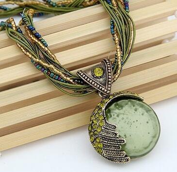 跨境欧美爆款时尚波西米亚编织米珠项链复古镶钻吊坠毛衣链批发