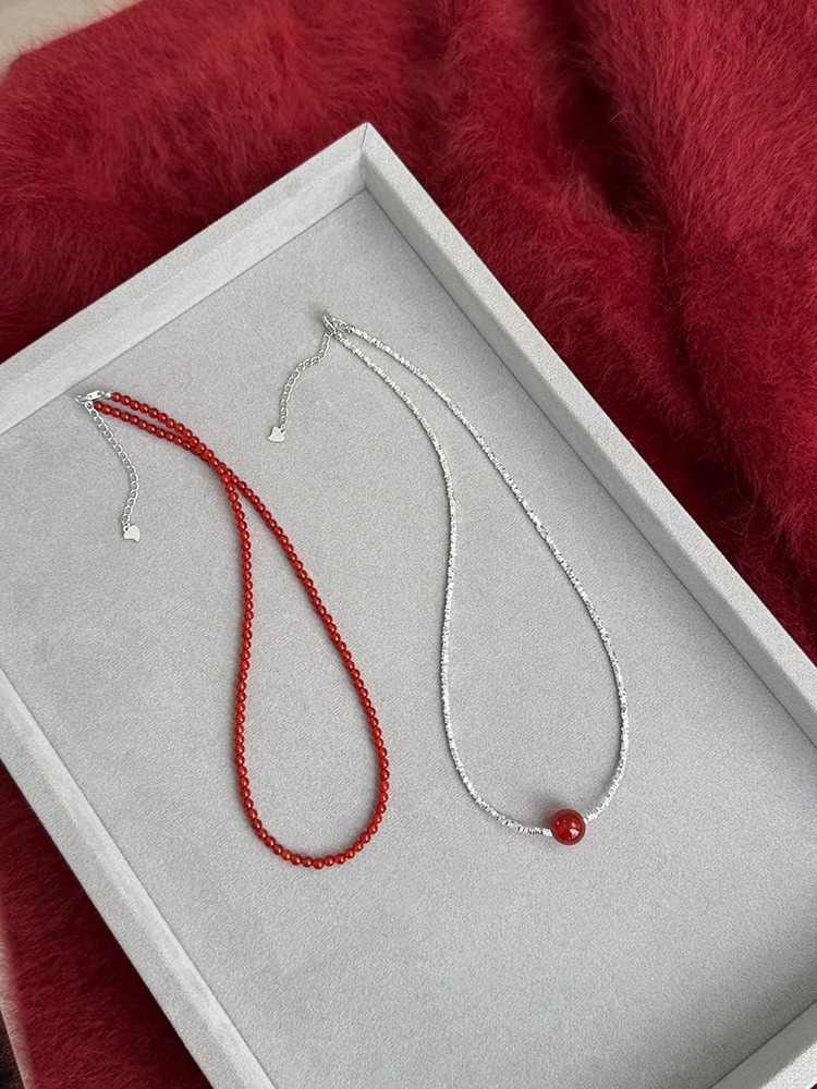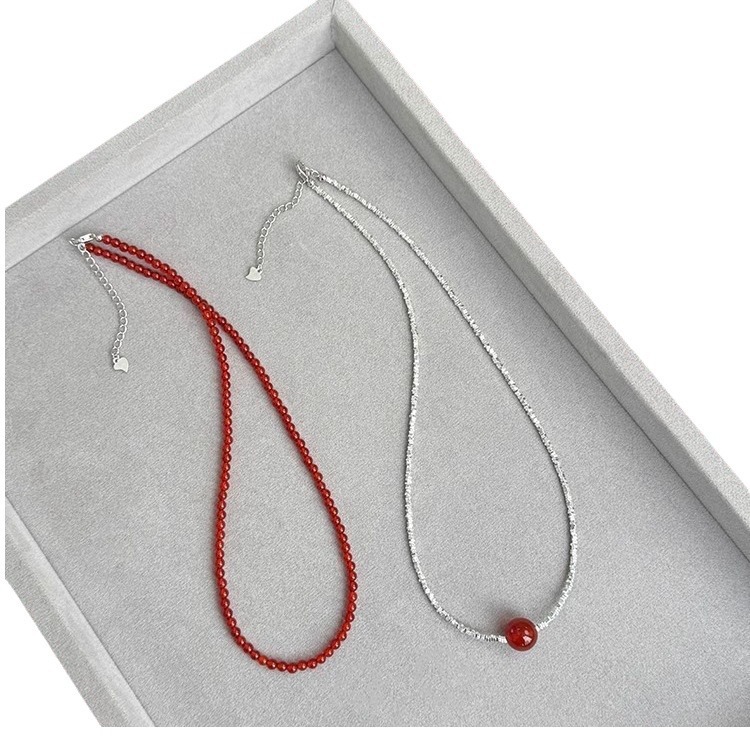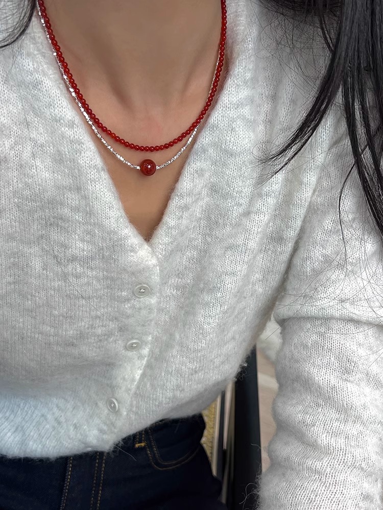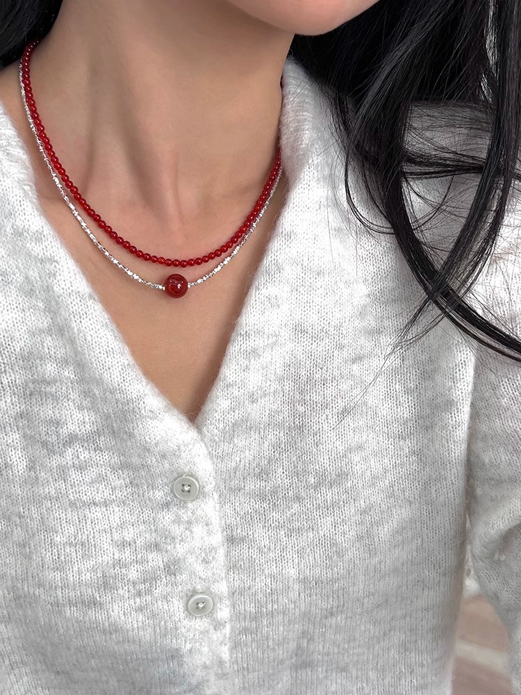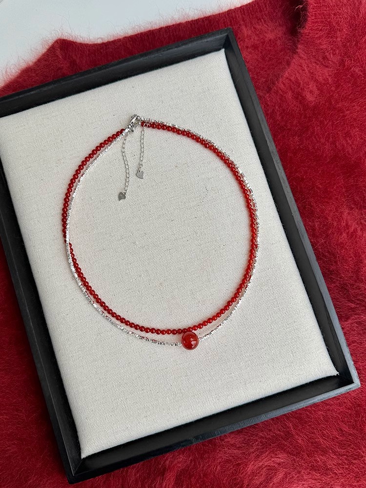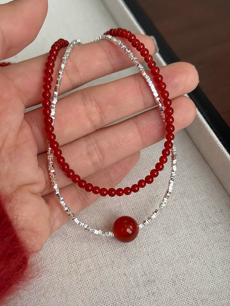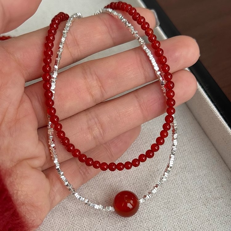925银红玛瑙碎银子叠戴本命年项链轻奢小众颈链新中式锁骨链