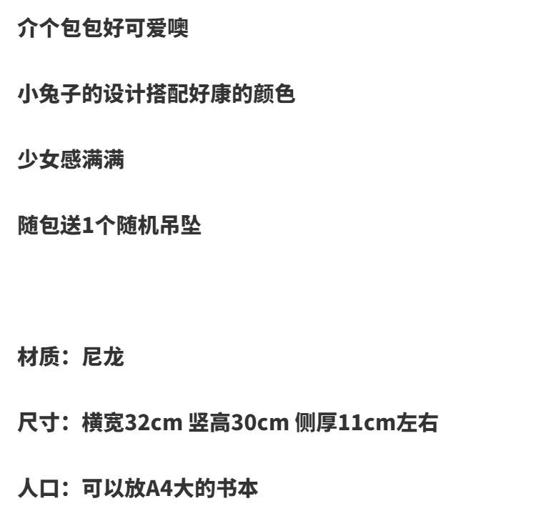 | bag for free 1 pendant + bunny pendant(包包送1吊坠+小兔子挂件) | USD $6.9 | 999999 piece available |