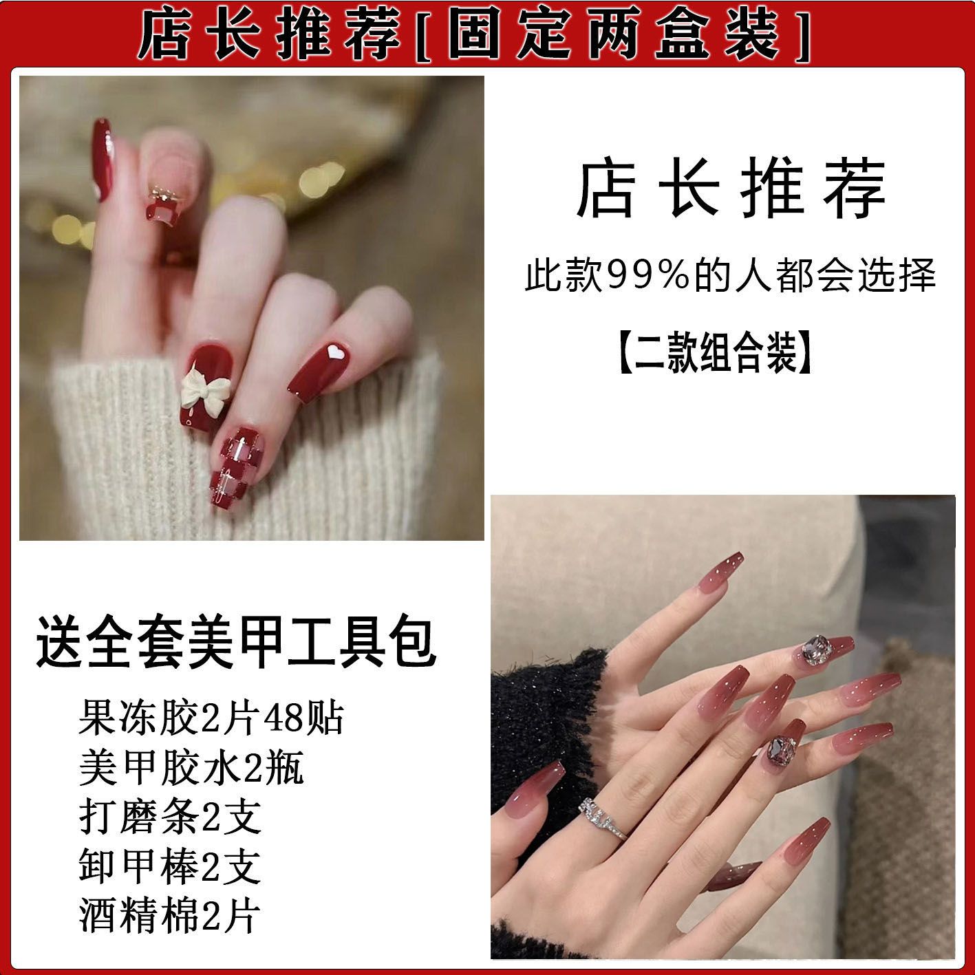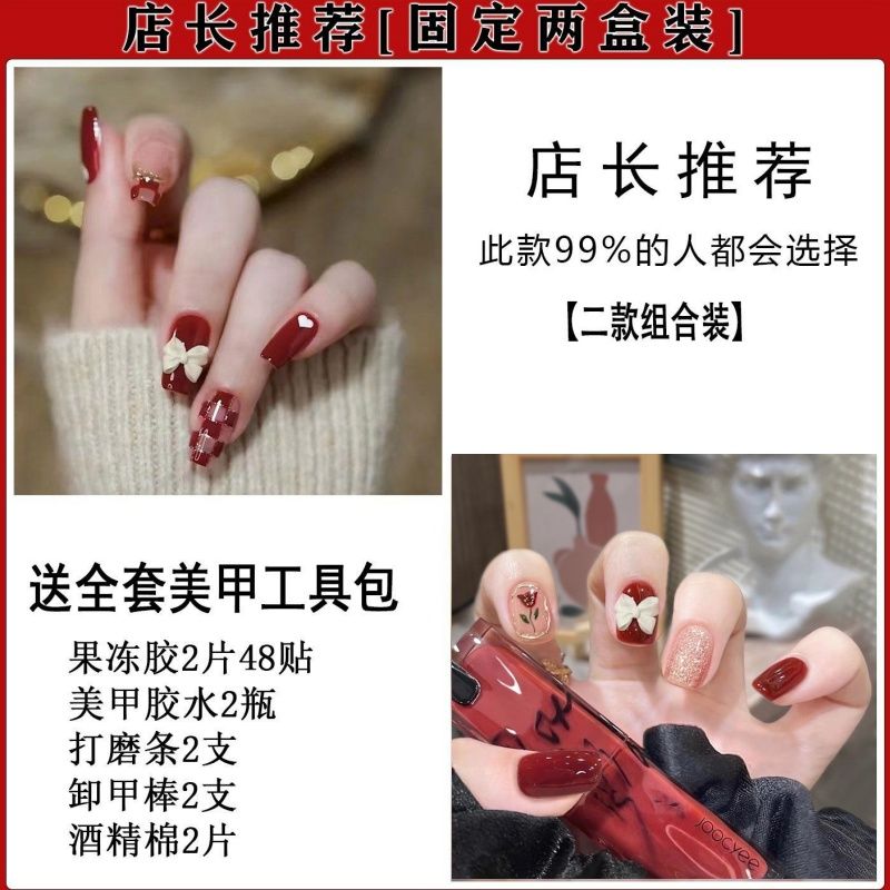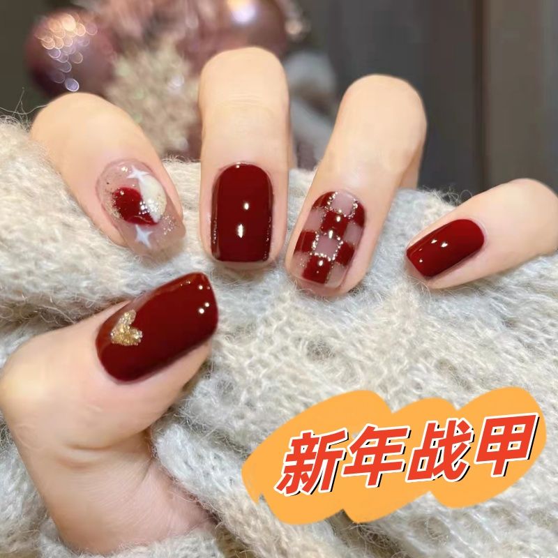 新年美甲穿戴甲红色棋盘指甲贴秋冬穿戴甲美甲贴片酒红新娘美甲片