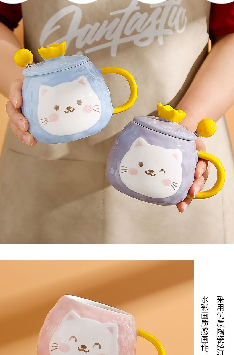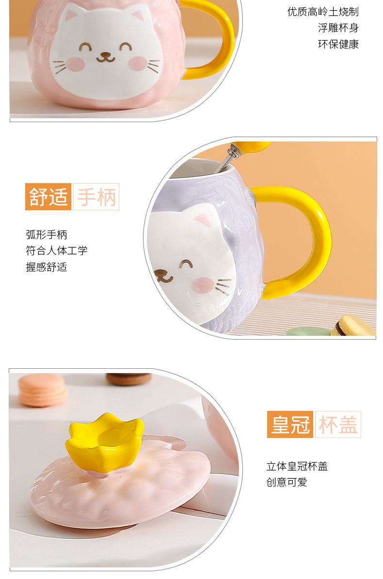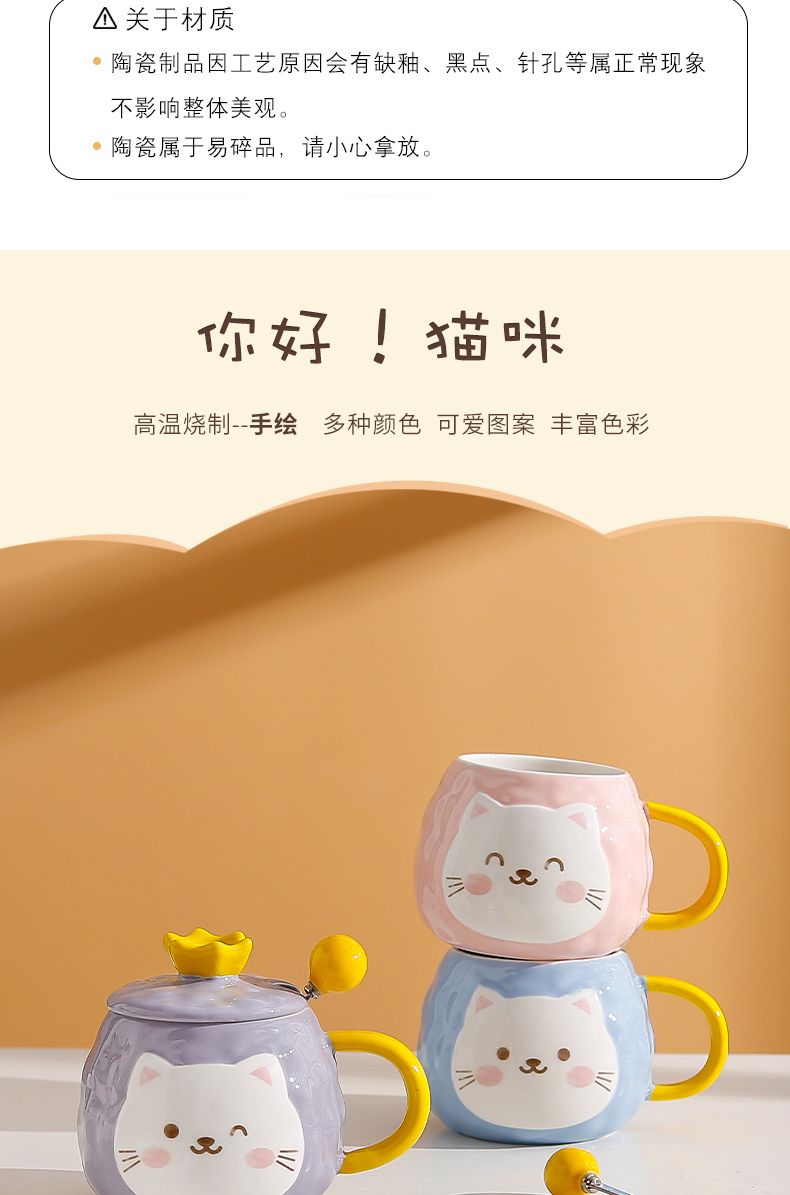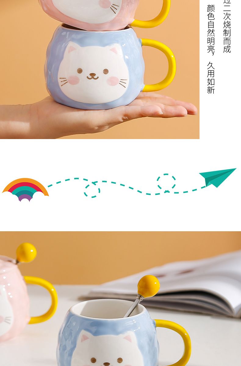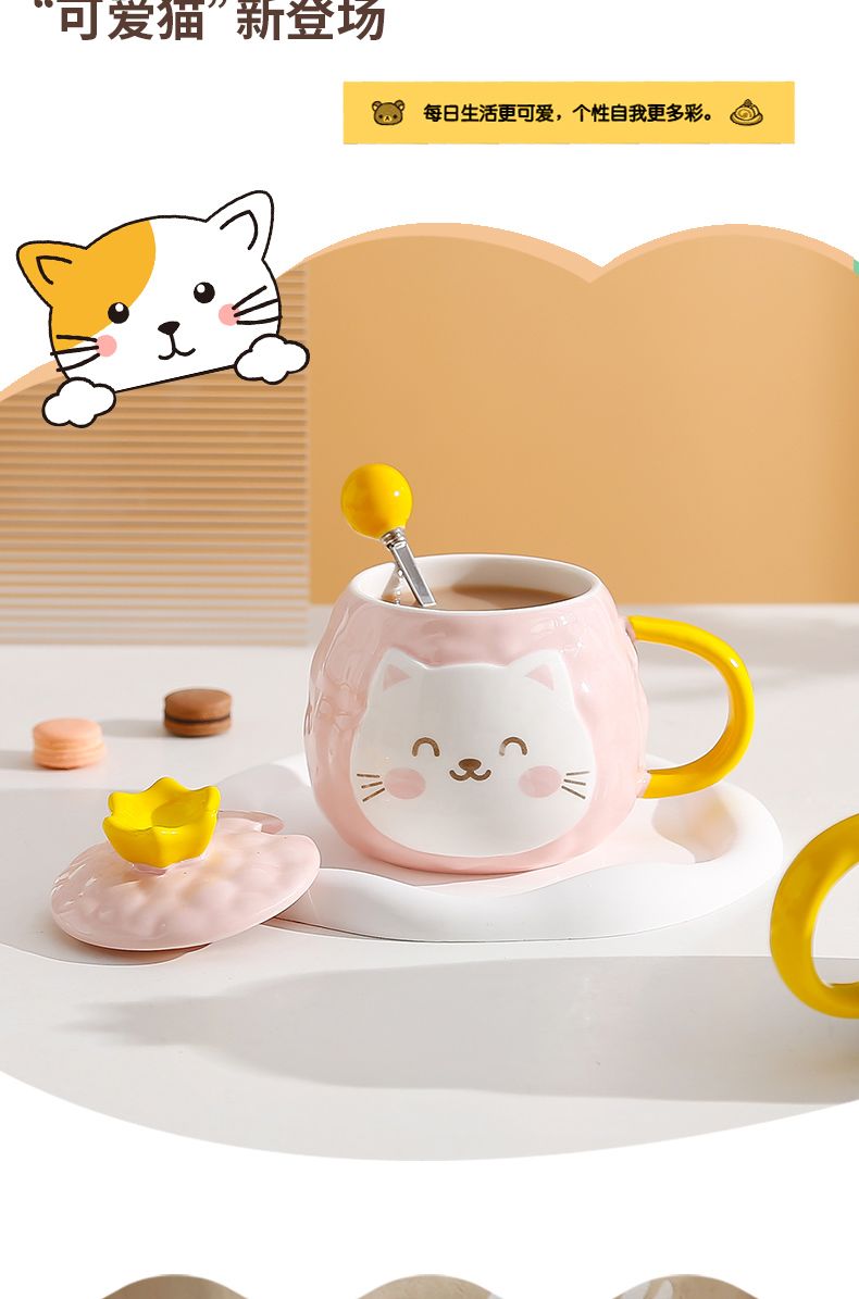 猫咪陶瓷杯子超萌小猫有盖喝水杯女上班族创意设计感马克杯带盖勺