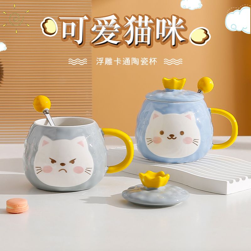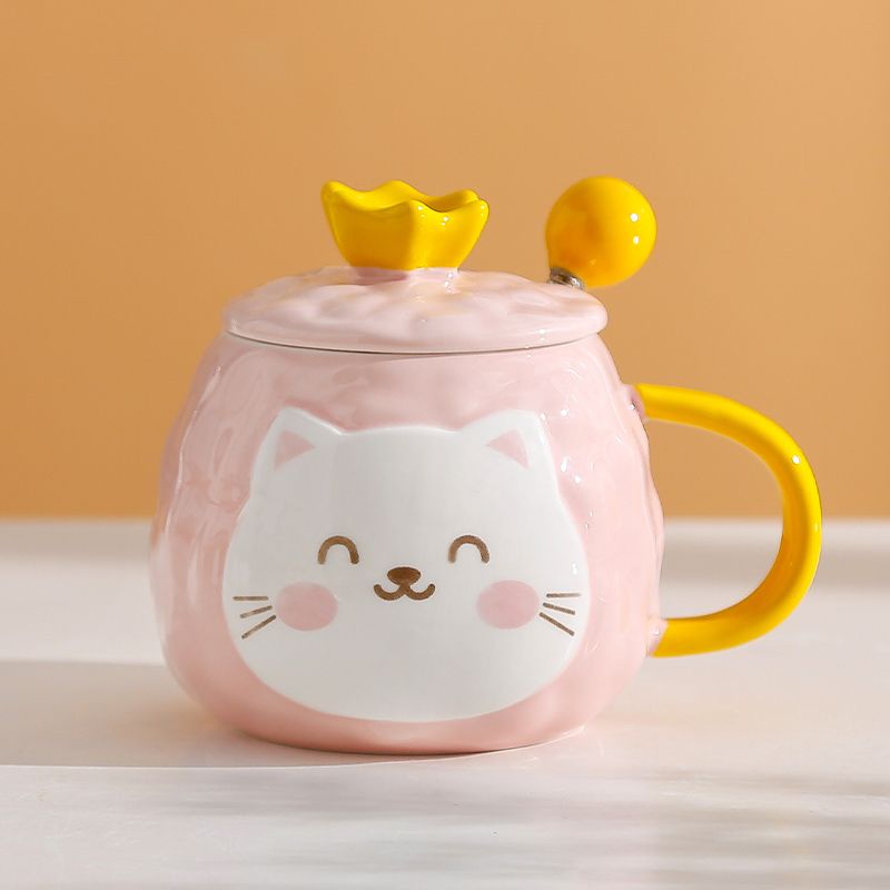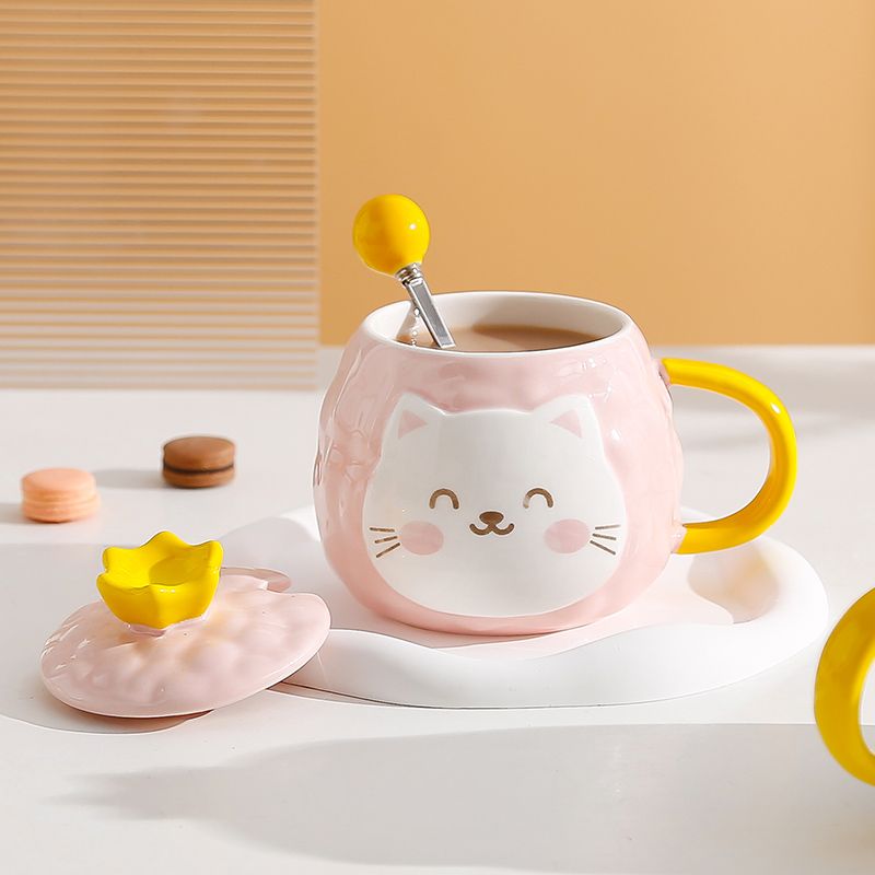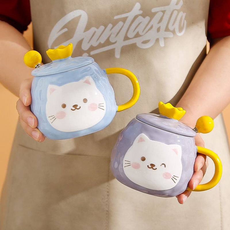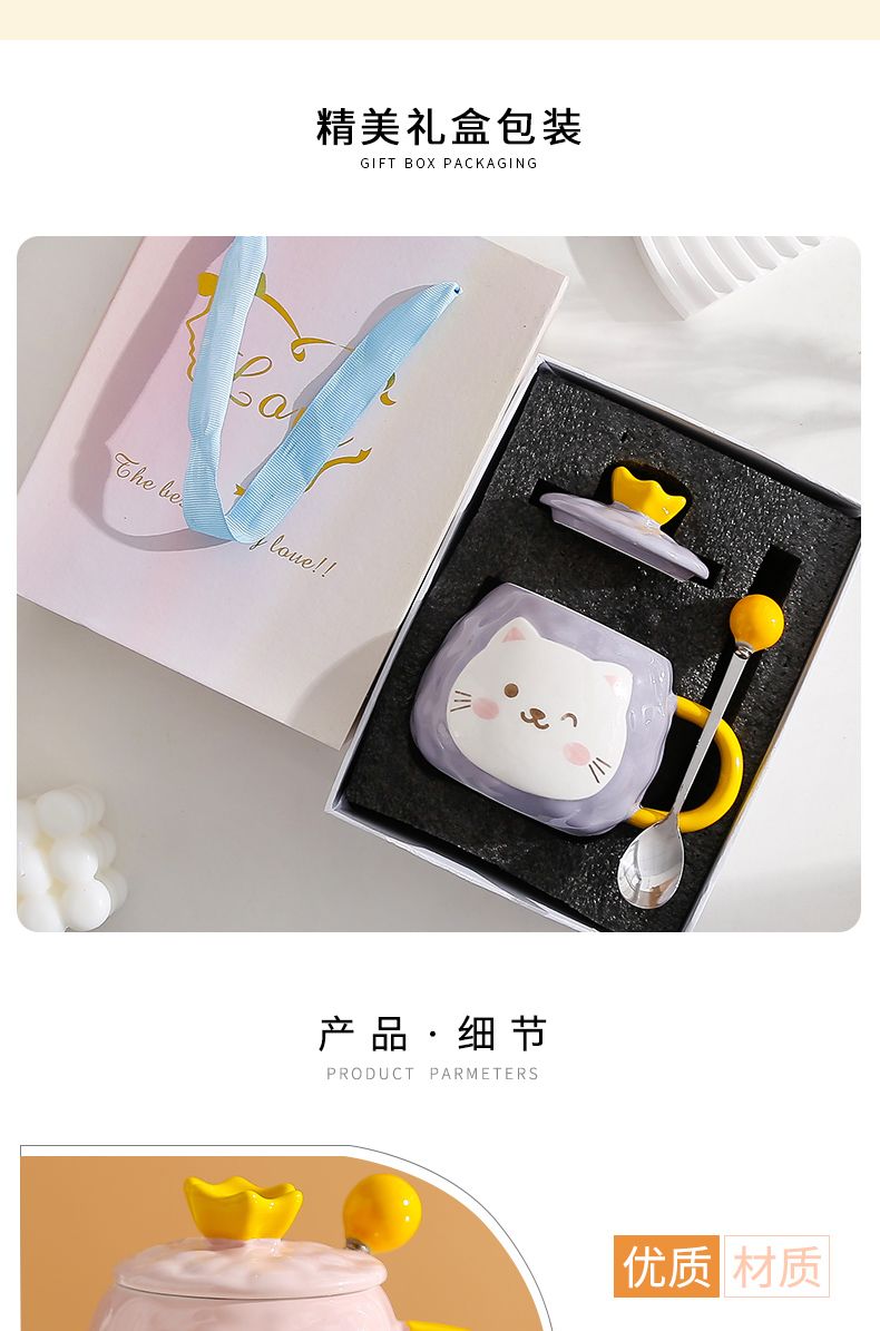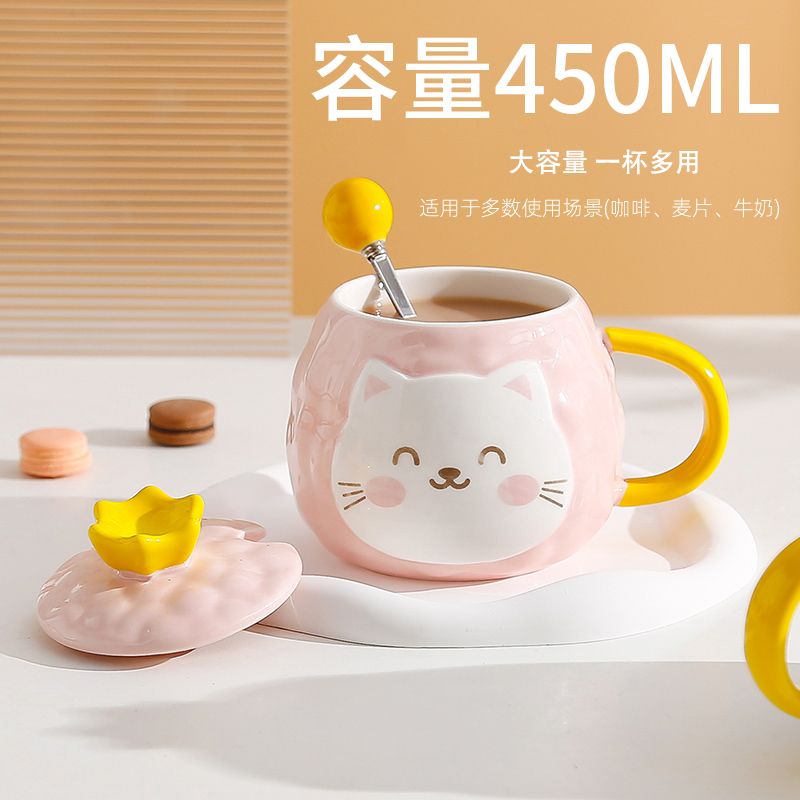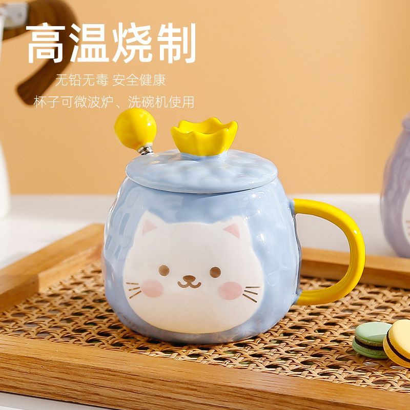 猫咪陶瓷杯子超萌小猫有盖喝水杯女上班族创意设计感马克杯带盖勺
