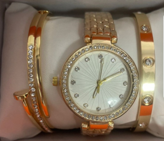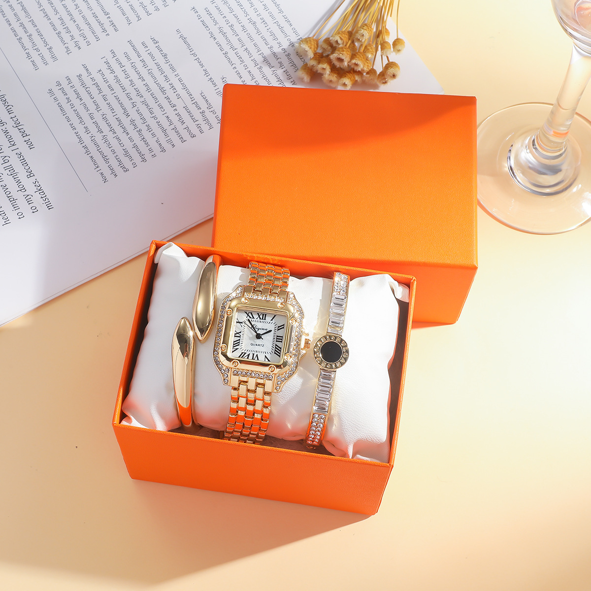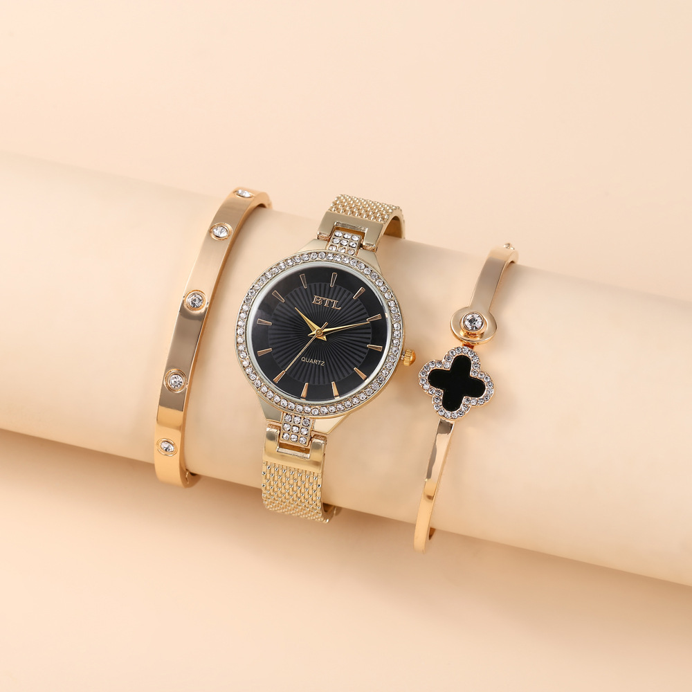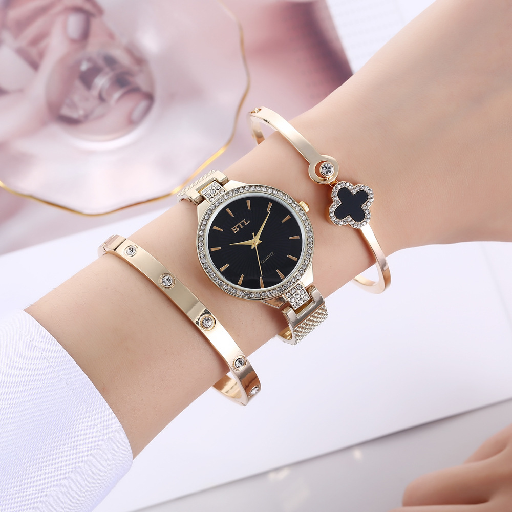 女士钛钢精美个性气质休闲细带网带石英手表+手镯套装(3pcs/set)