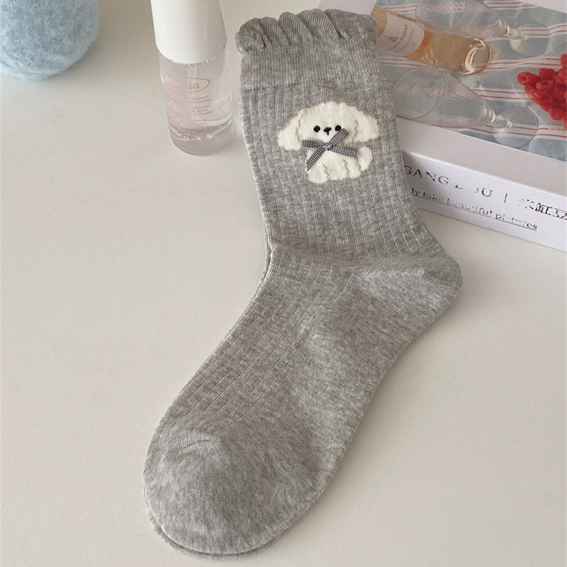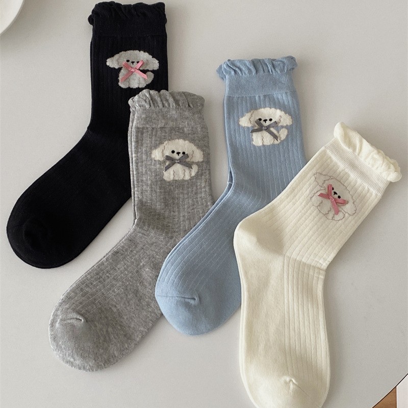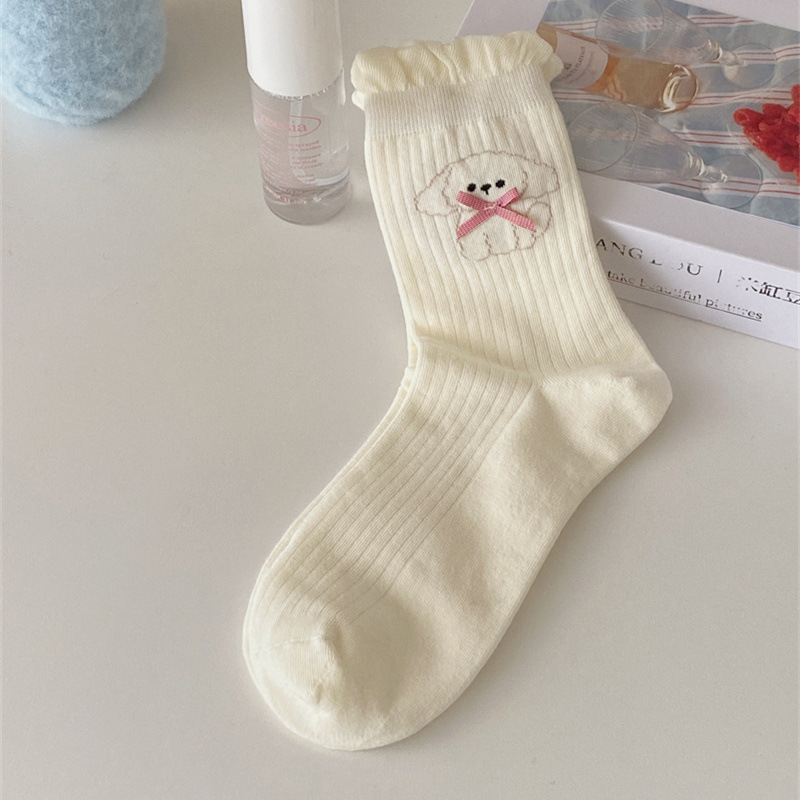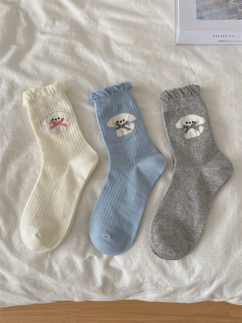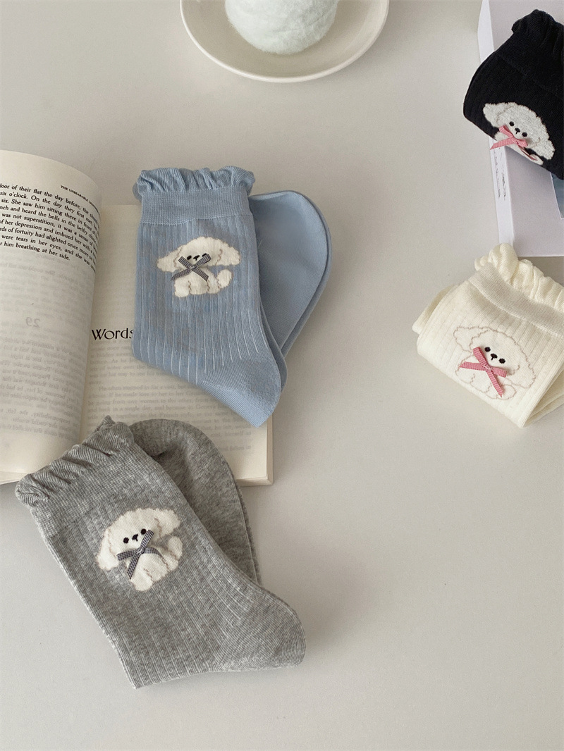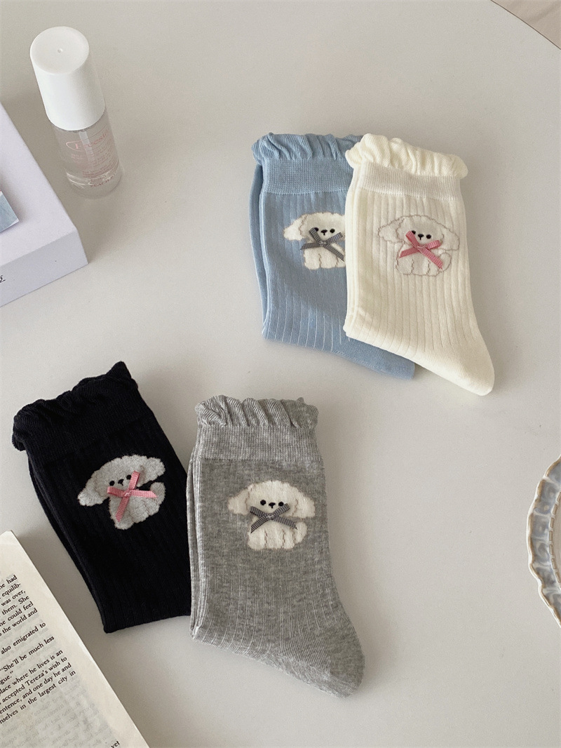 袜子女春夏薄款可爱狗狗女中筒袜日系泡泡口花边卡通女袜堆堆袜棉