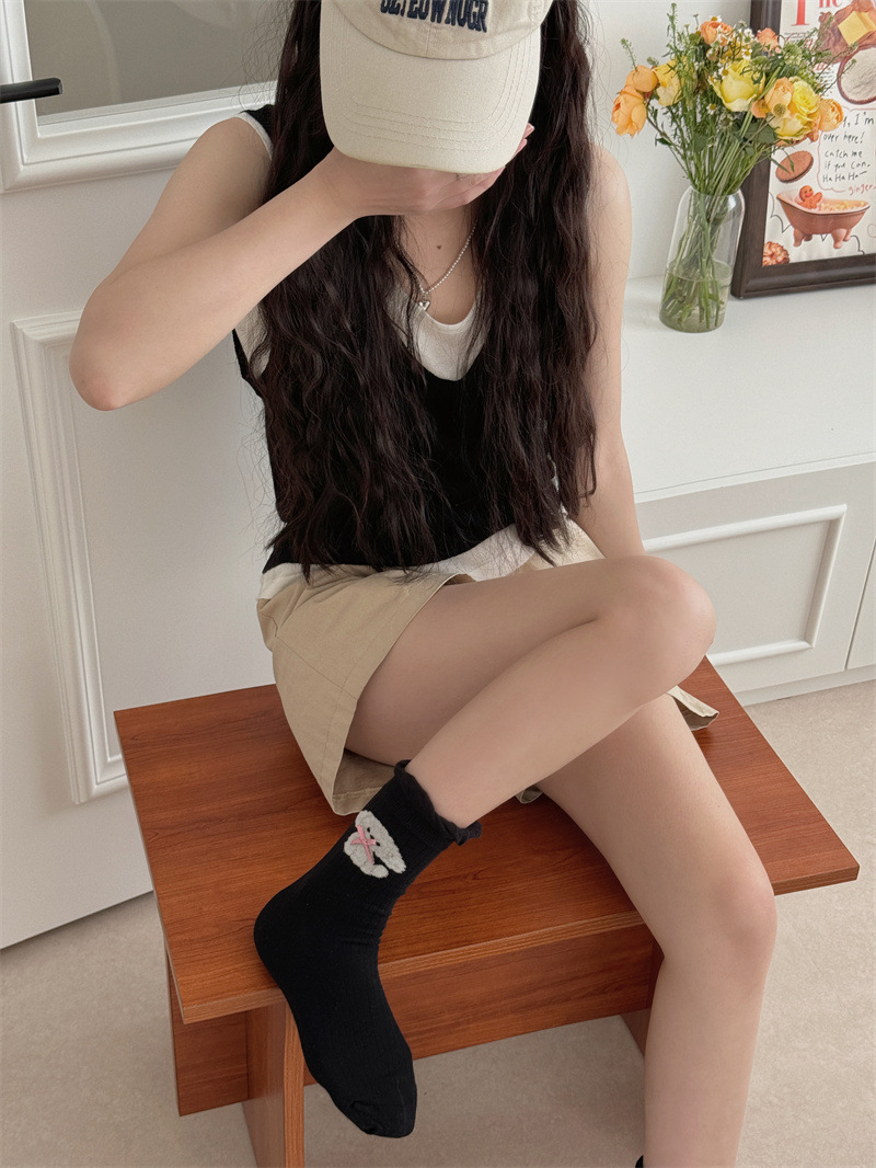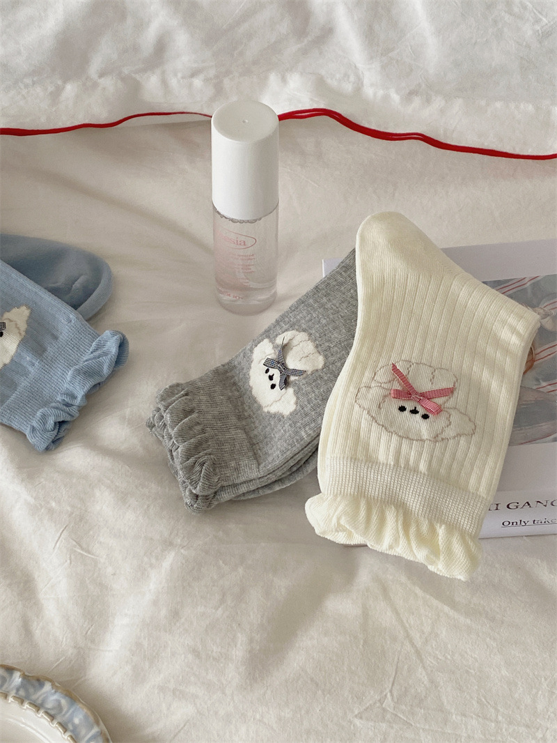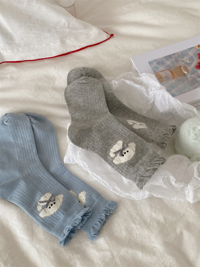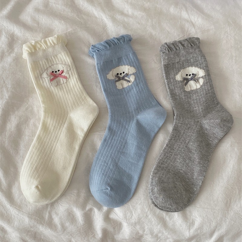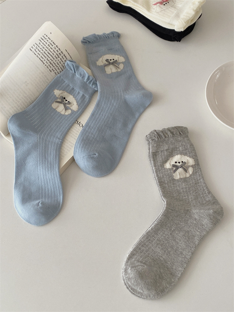 袜子女春夏薄款可爱狗狗女中筒袜日系泡泡口花边卡通女袜堆堆袜棉