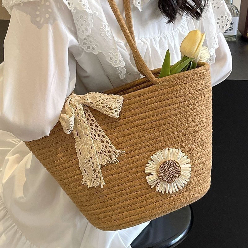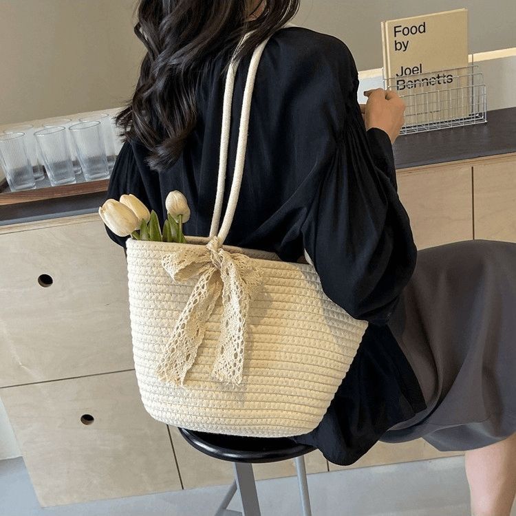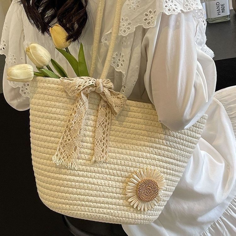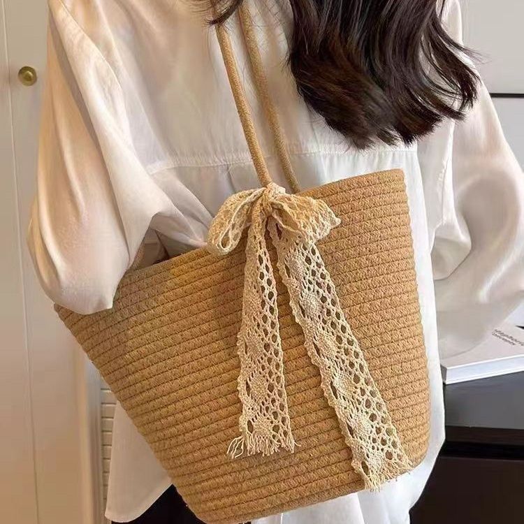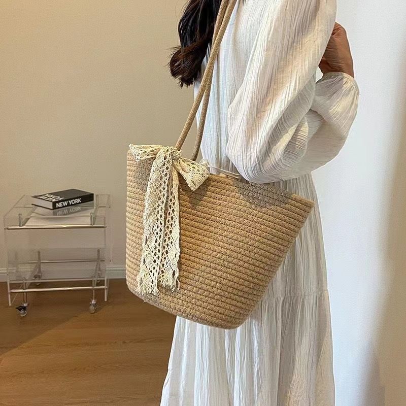 时尚编织单肩新款女包2024大容量棉绳托特度假沙滩夏季小众草编包