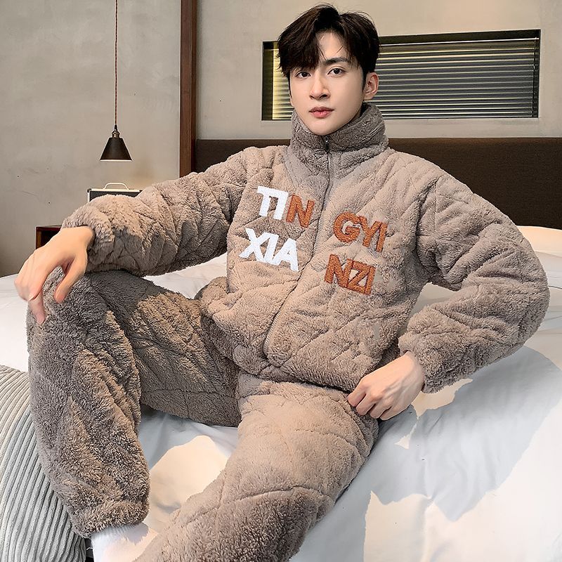 男士睡衣冬季三层加厚加绒夹棉珊瑚绒法兰绒秋冬款保暖家居服套装
