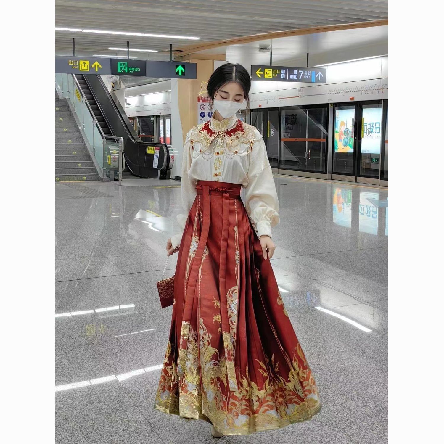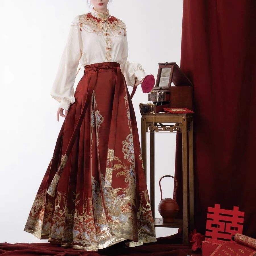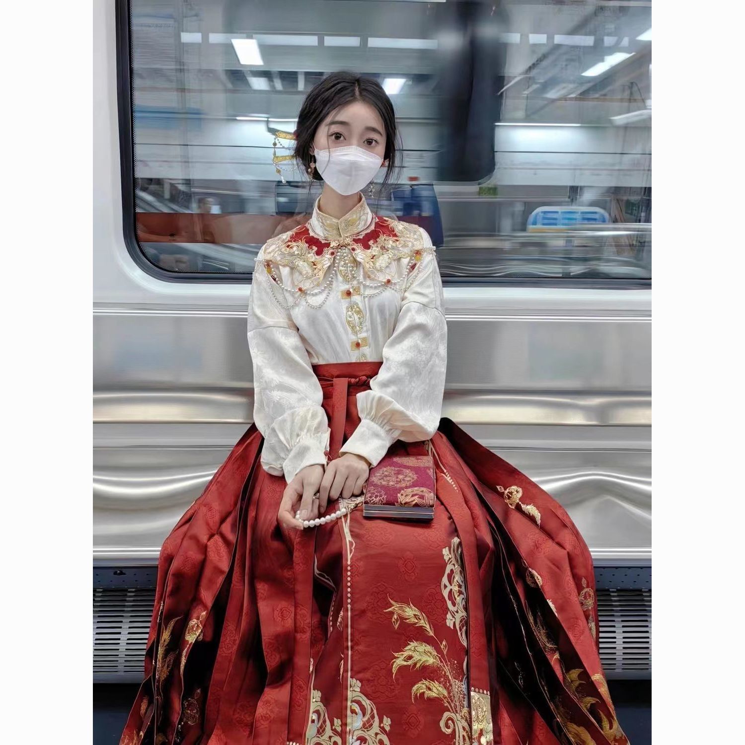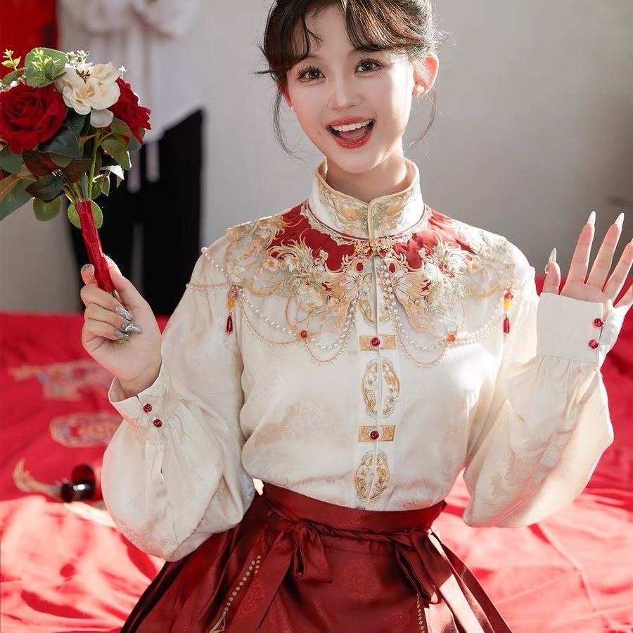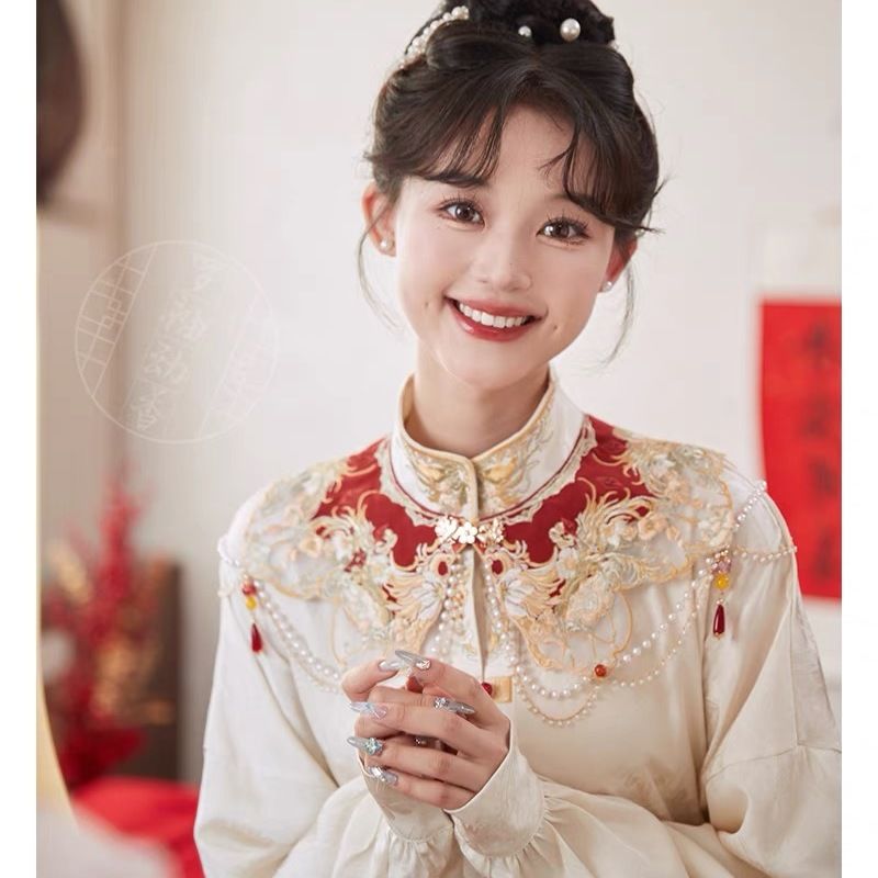 一堂缔约国风重工马面刺绣裙云肩汉服云肩敬酒订婚红色中式套装