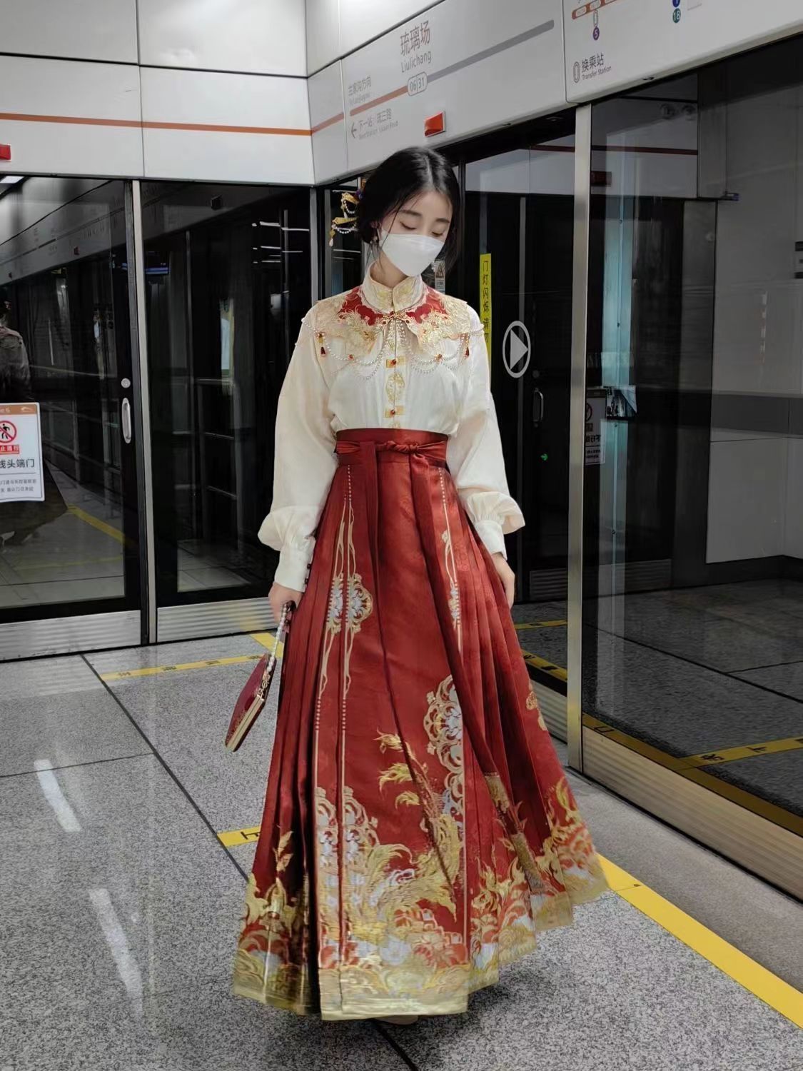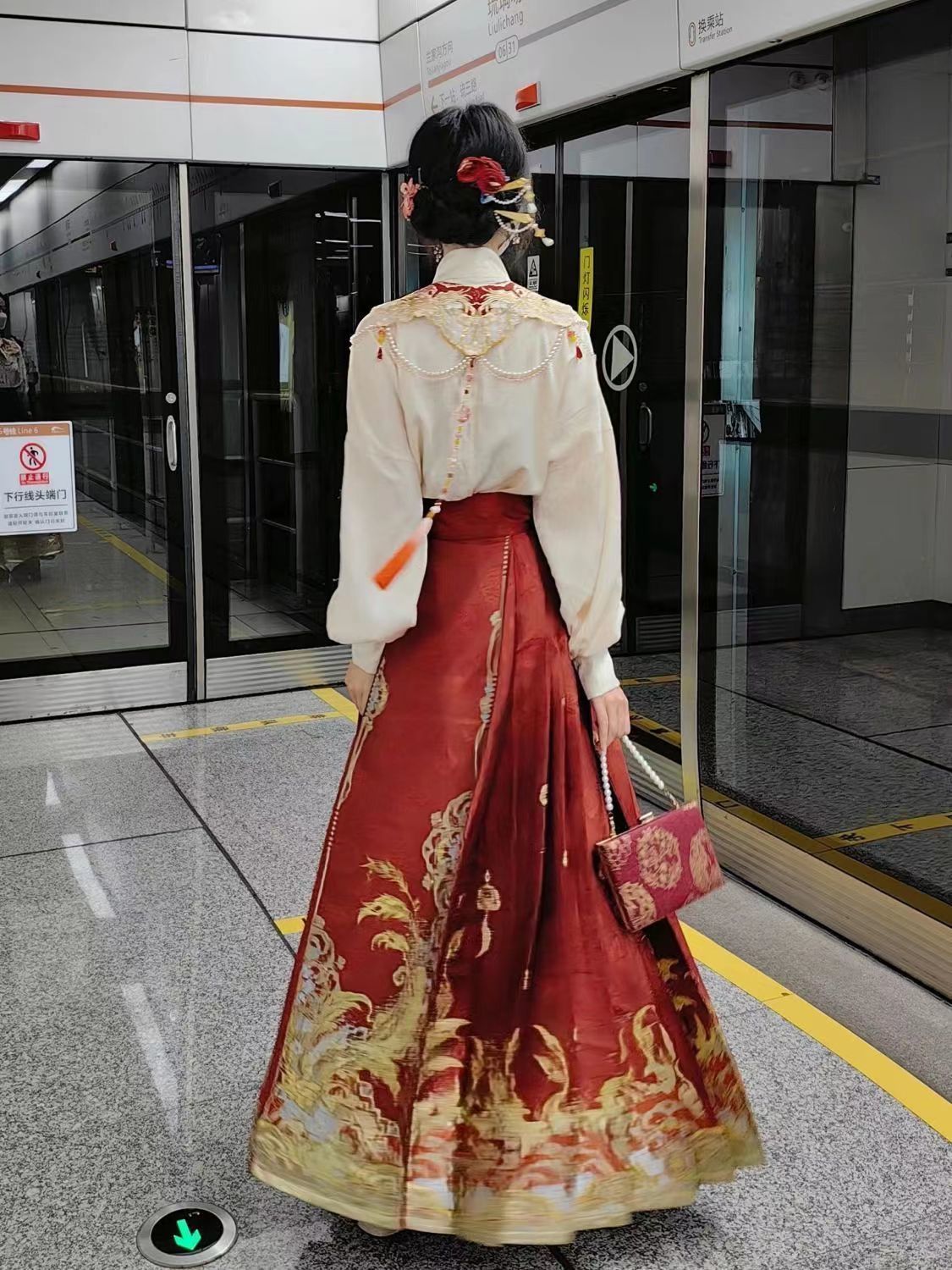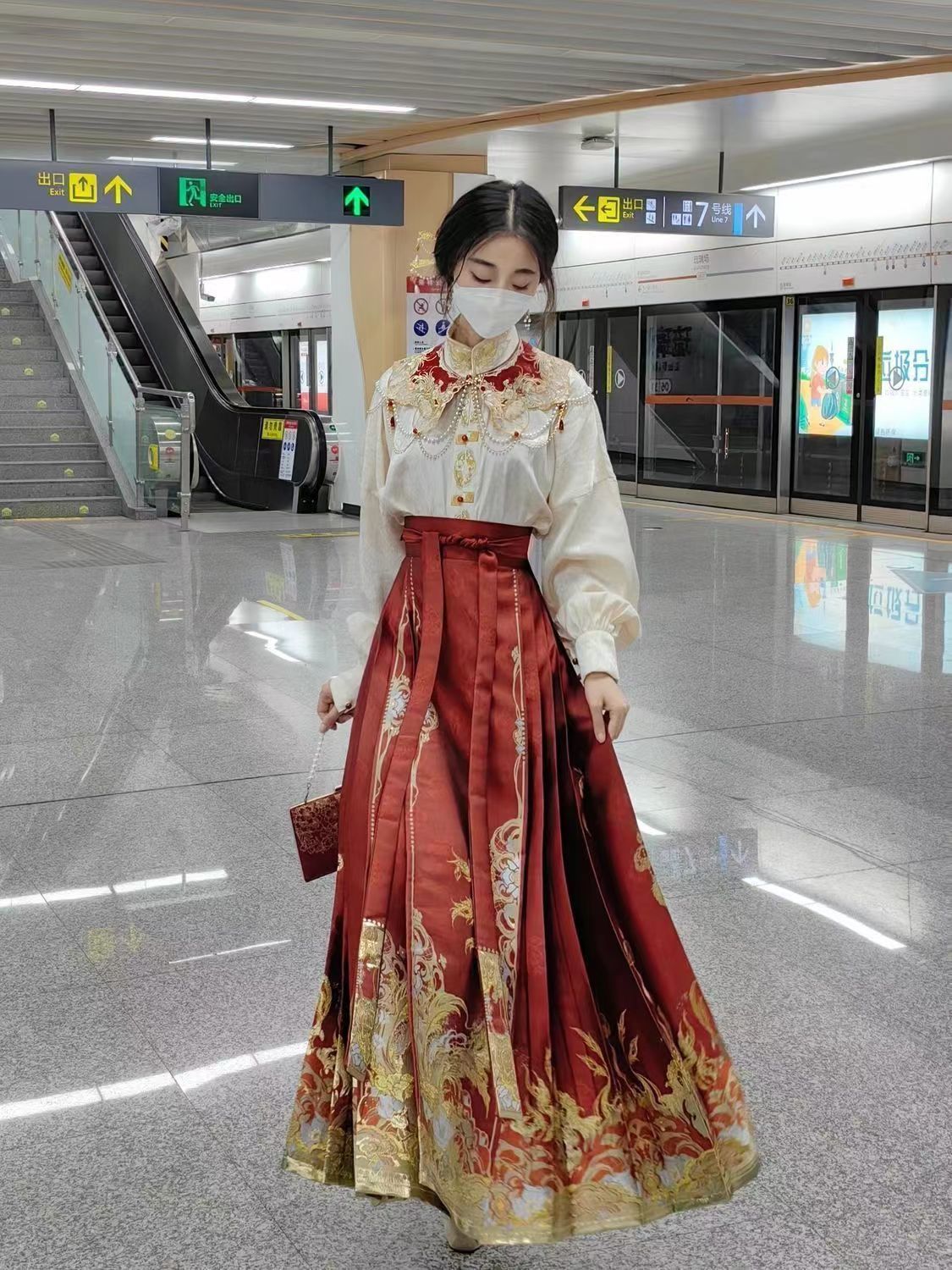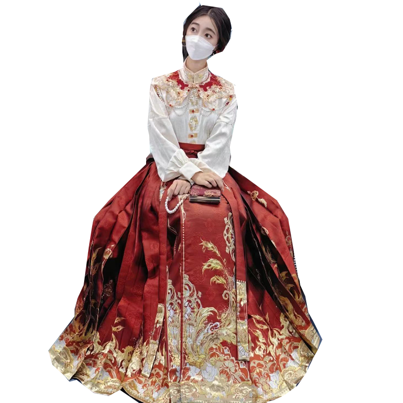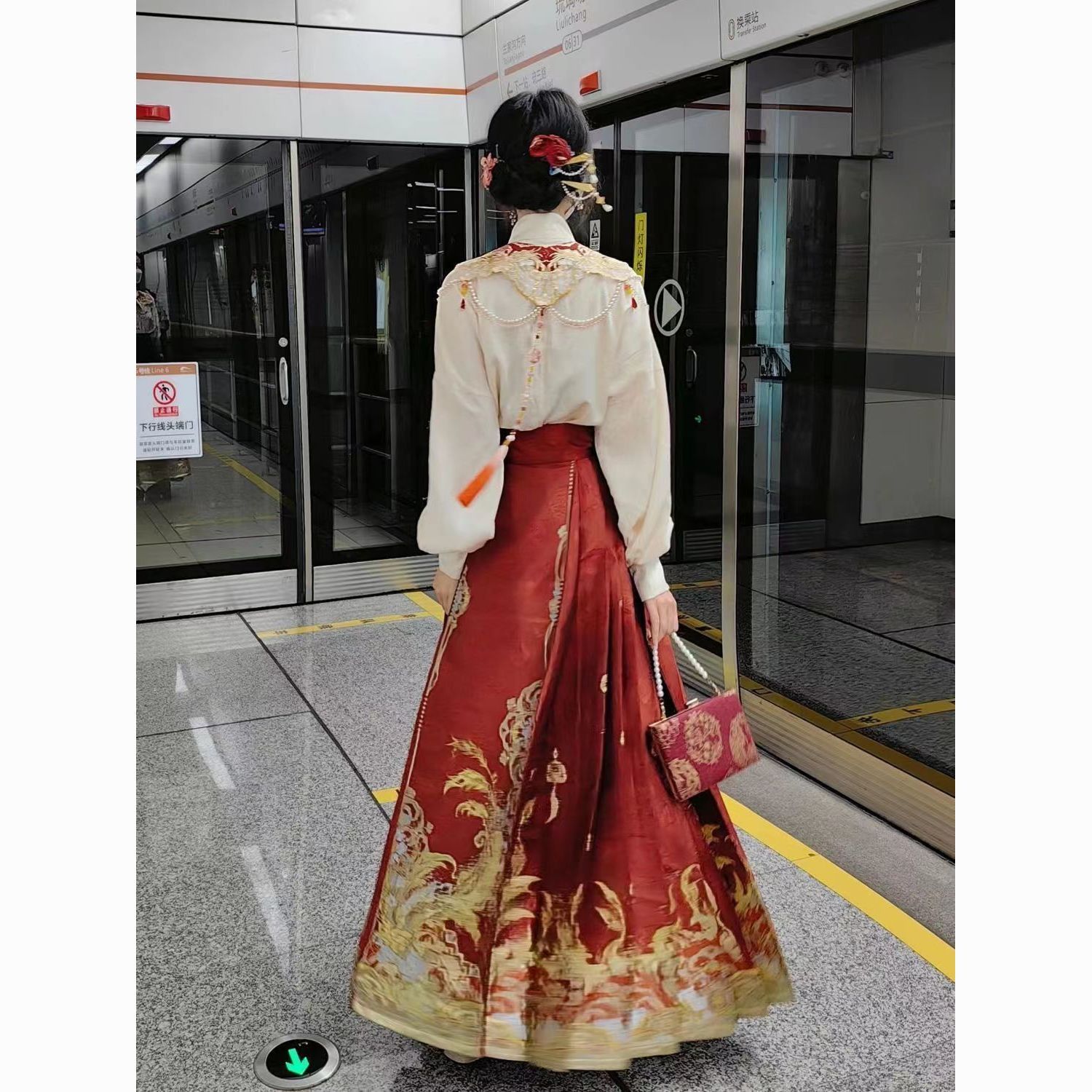 一堂缔约国风重工马面刺绣裙云肩汉服云肩敬酒订婚红色中式套装