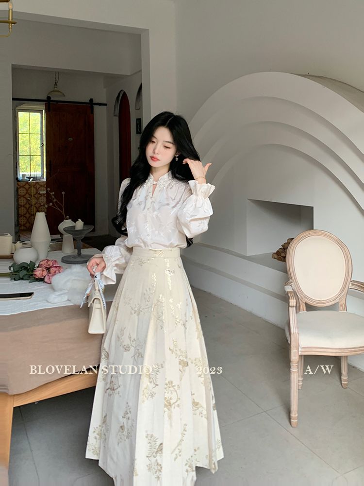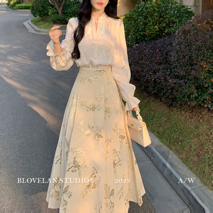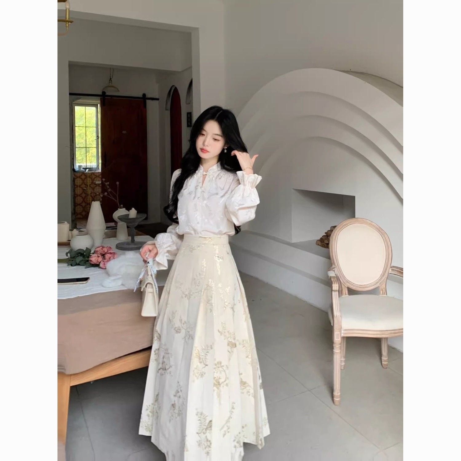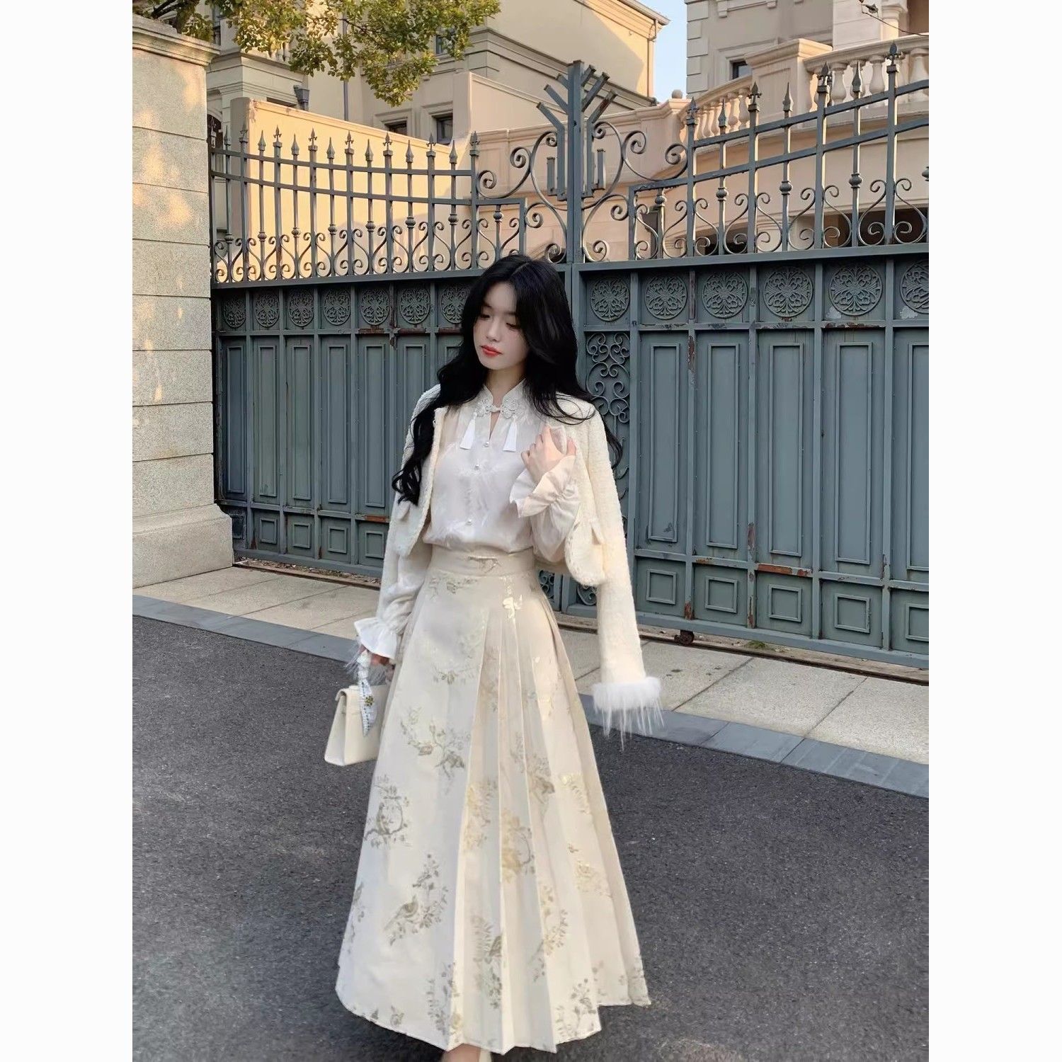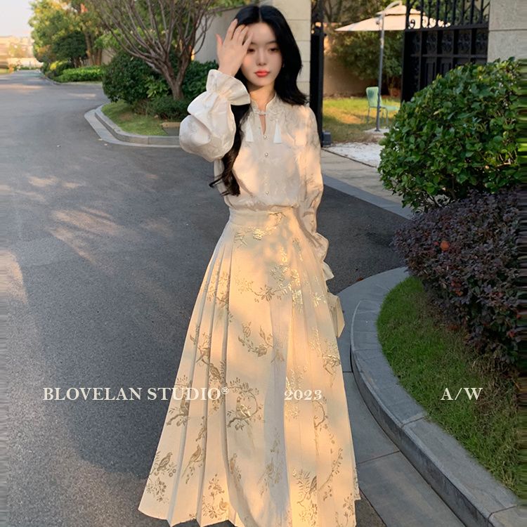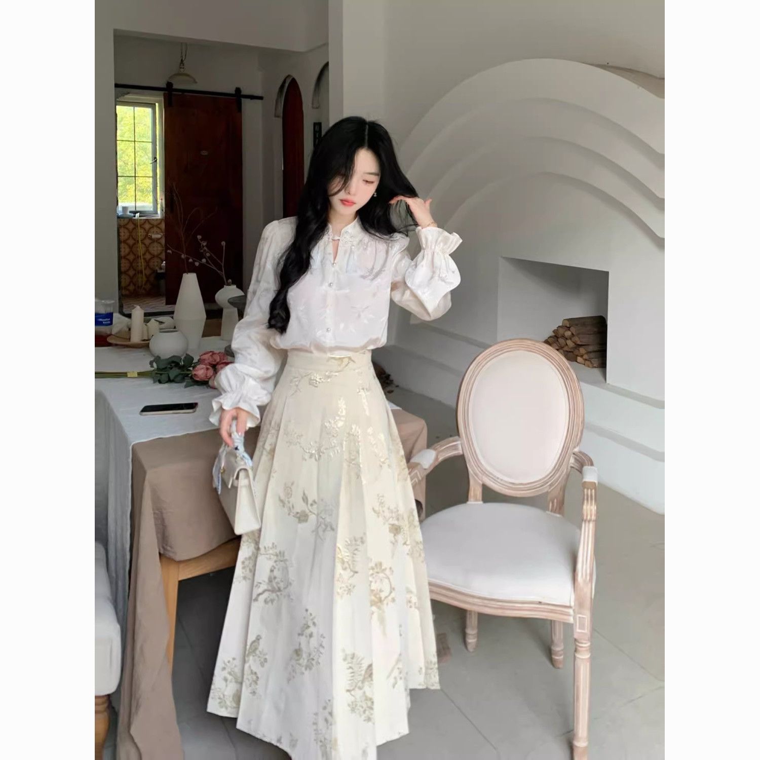 新中式国风马面裙套装女2024秋新款日常改良盘扣衬衫连衣裙两件套