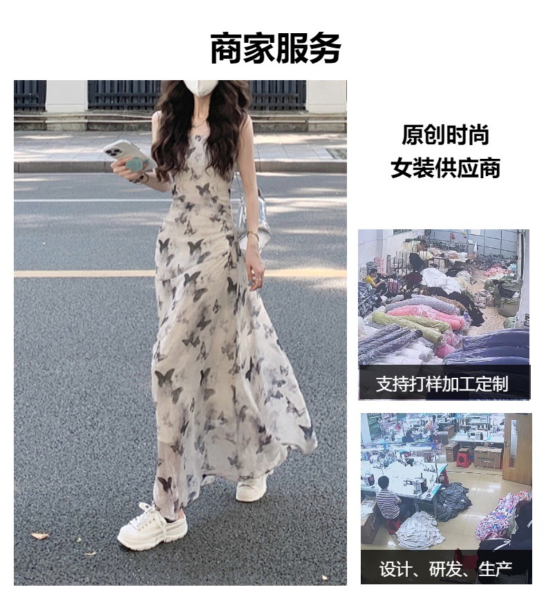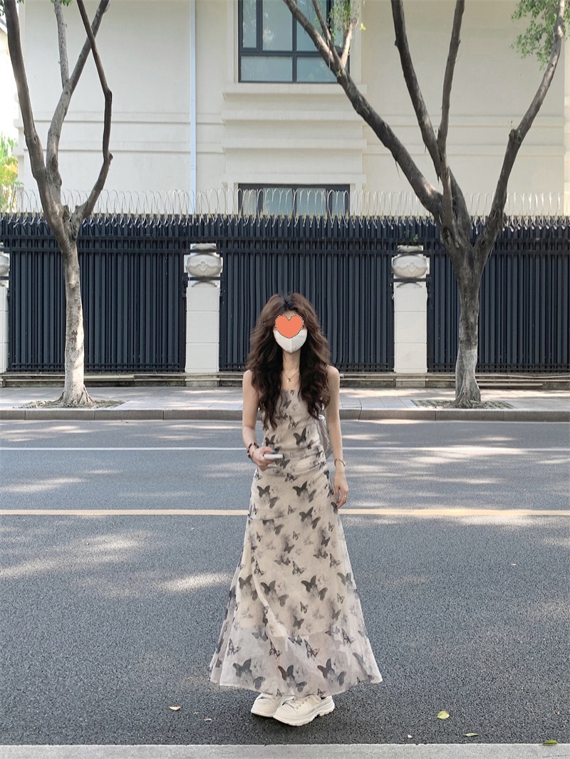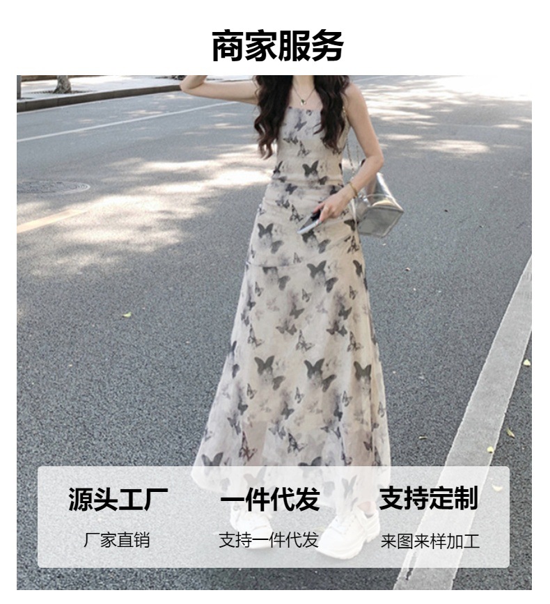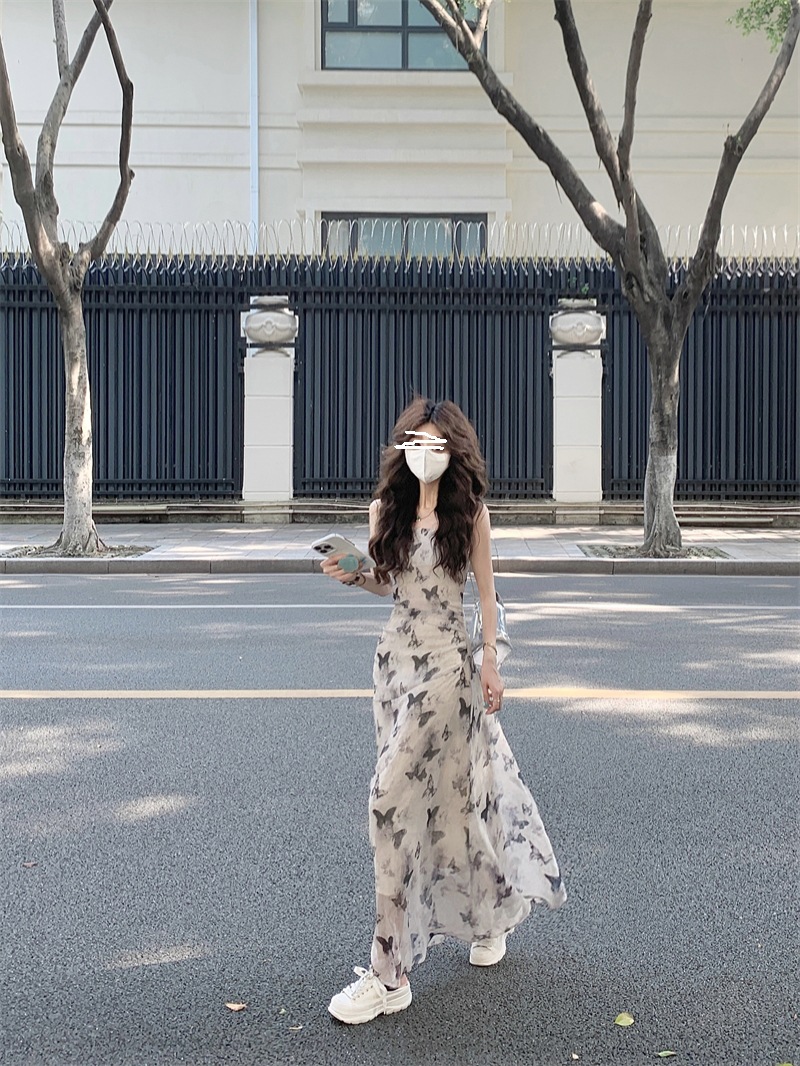 清冷系水墨蝴蝶连衣裙女夏显瘦复古褶皱收腰纯欲茶歇碎花吊带长裙
