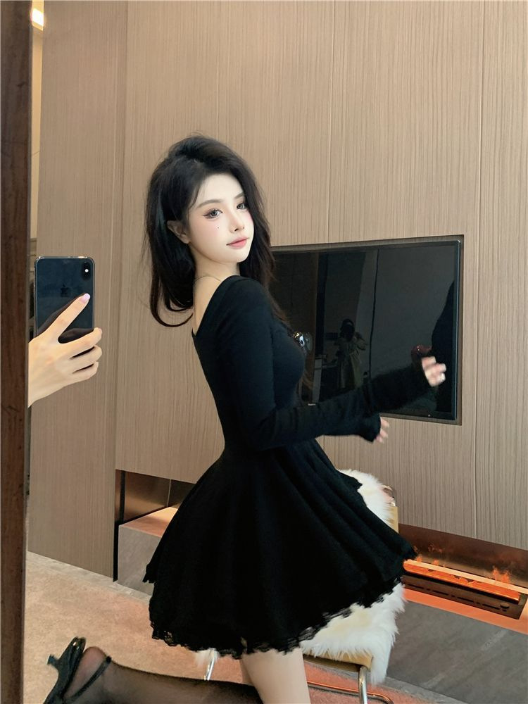 法式性感辣妹纯欲方领锁骨长袖连衣裙女装秋季新款小个子收腰短裙