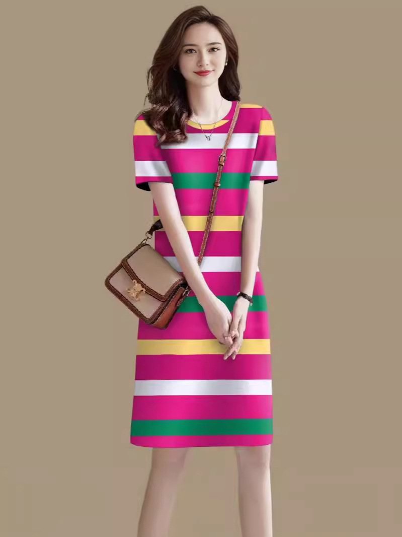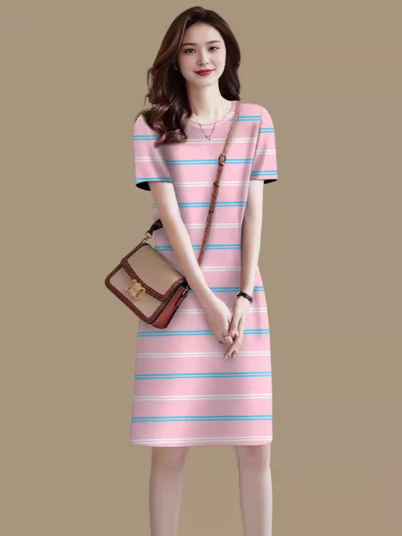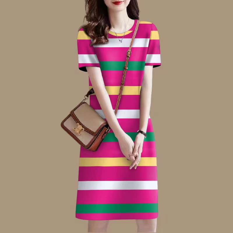 批发2025年夏季新款中年妈妈减龄圆领条纹连衣裙显瘦裙子一件代发