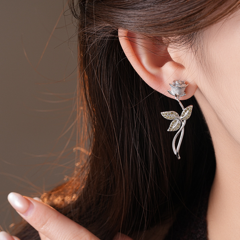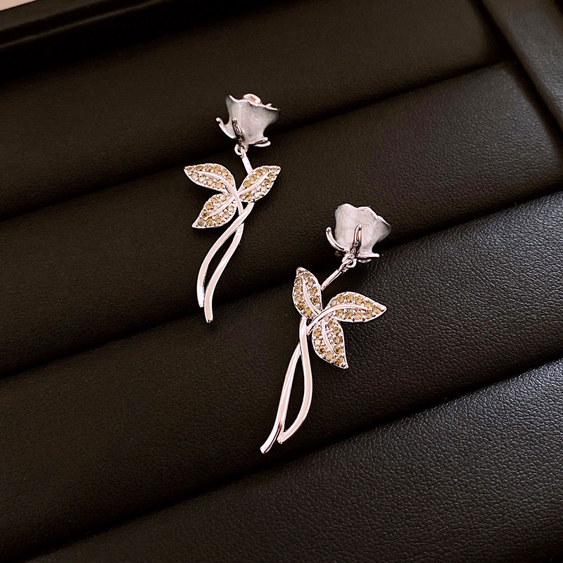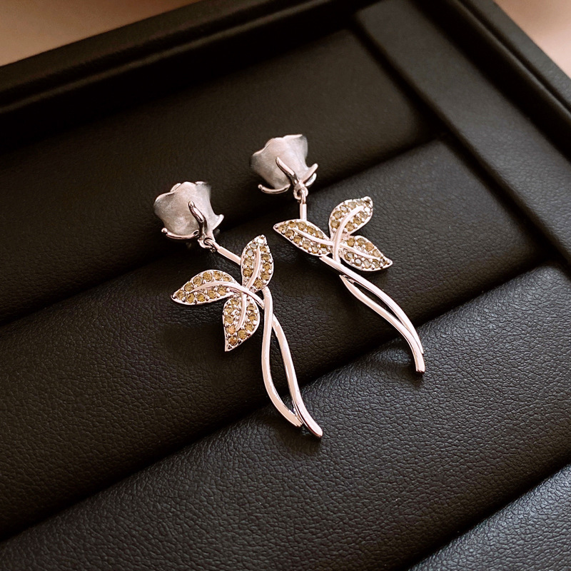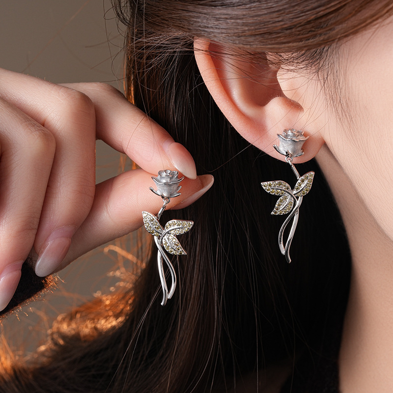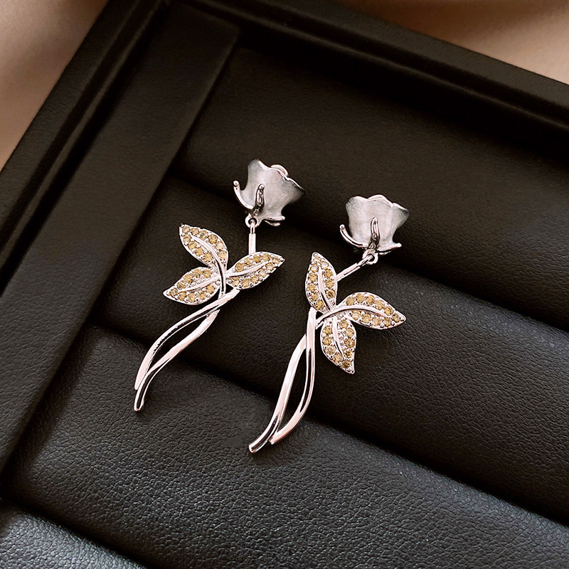 银针田园锆石玫瑰花花朵树叶耳钉时尚简约个性耳环轻奢高级感耳饰