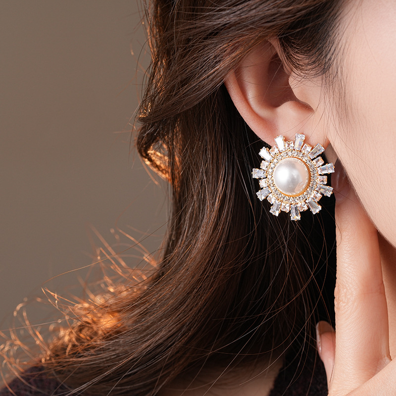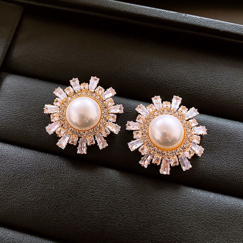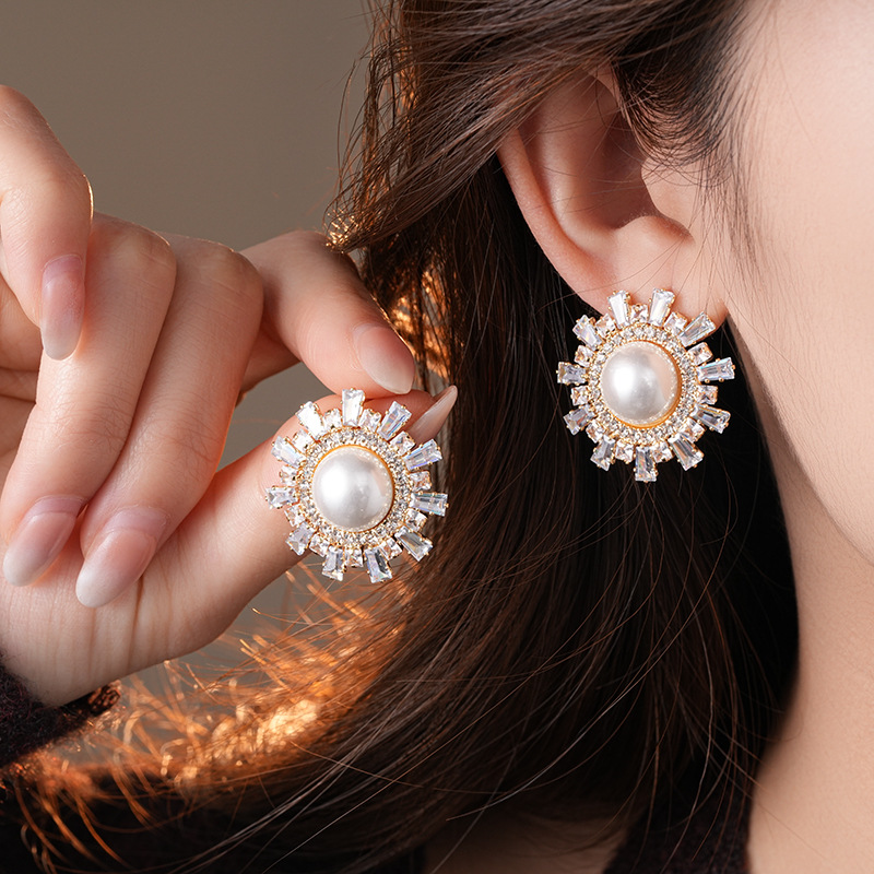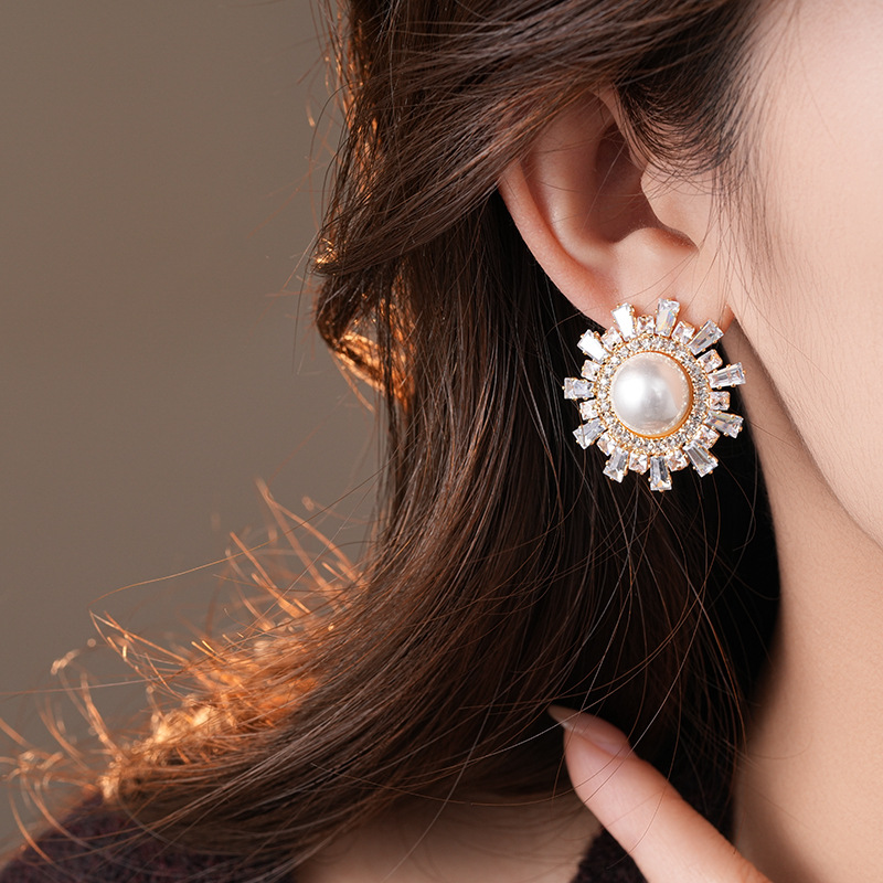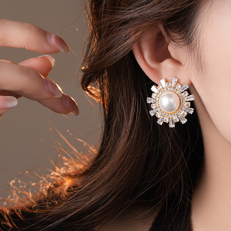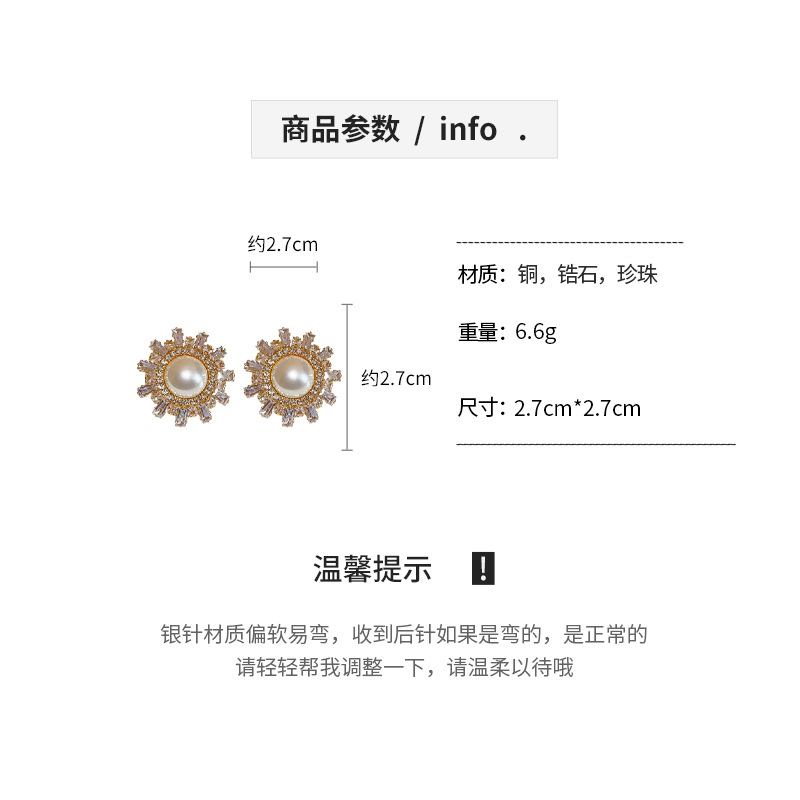 银针时尚锆石圆形太阳花珍珠耳钉网红同款气质耳环轻奢高级感耳饰